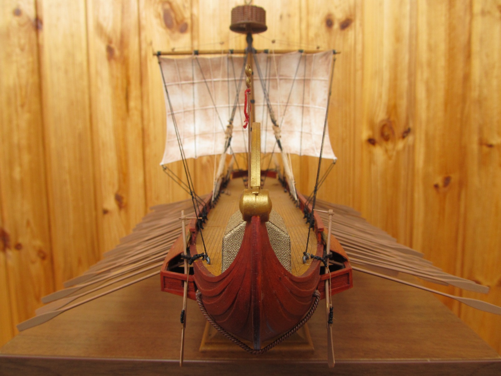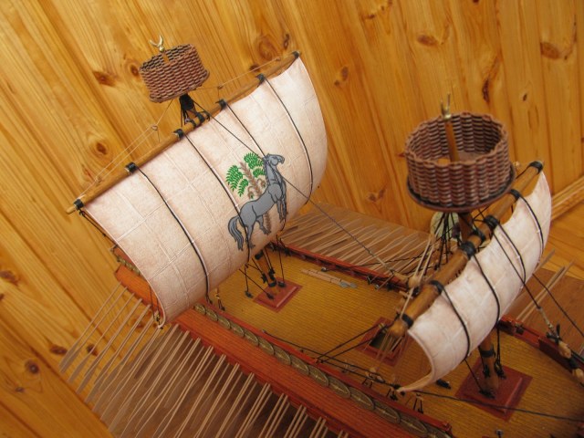 Окраска удалась, особенно доставили пластиковые паруса. По веслам согласен с коллегами, пластмассОВАТО как-то выглядят. И на мой чисто субъективный взгляд реи великоваты у вас получились по сечению.Если представить в натуральную величину.