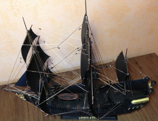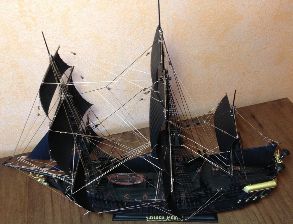 Представляю Вашему вниманию свой вариант Черной жемчужины. Собирал для своей девушки, вариант окраски в конкретный черный (как в фильме) захотела она, и даже внесла свою лепту в покраску деталей золотом). Сборка корпуса заняла не так много времени, а вот этот самый ТАКЕЛАЖ потребовал просто уйму времени (из-за этого был большой перерыв между сборкой корпуса и натягиванием ниточек, банально опустились руки). О старении и других примочках речи даже не шло, очень все это сложно пока для меня, да и сборка с покраской и такелажем все же поубавили энтузиазм со временем.
