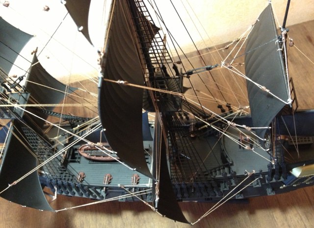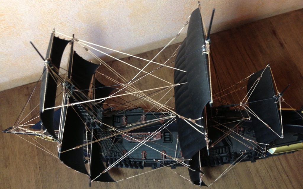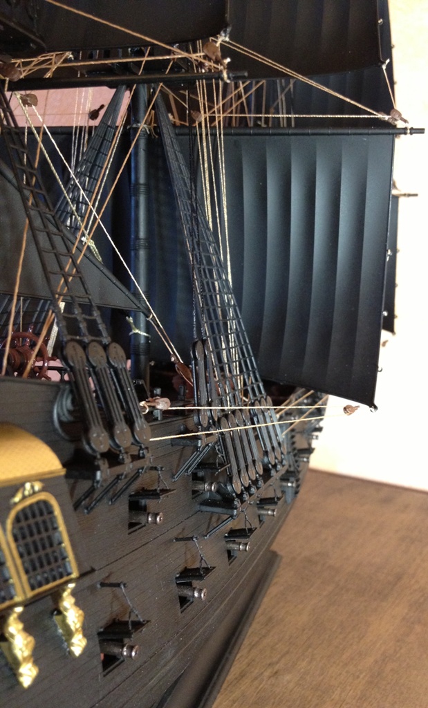 Согласен с коллегами. Монотонность черной окраски портит впечатление от модели и делает ее игрушечной. В продаже есть много модельных красок с разными оттенками черного цвета. И если бы паруса покрасили в один оттенок черного, корпус в другой а палубу в третий то модель от этого только бы выиграла.