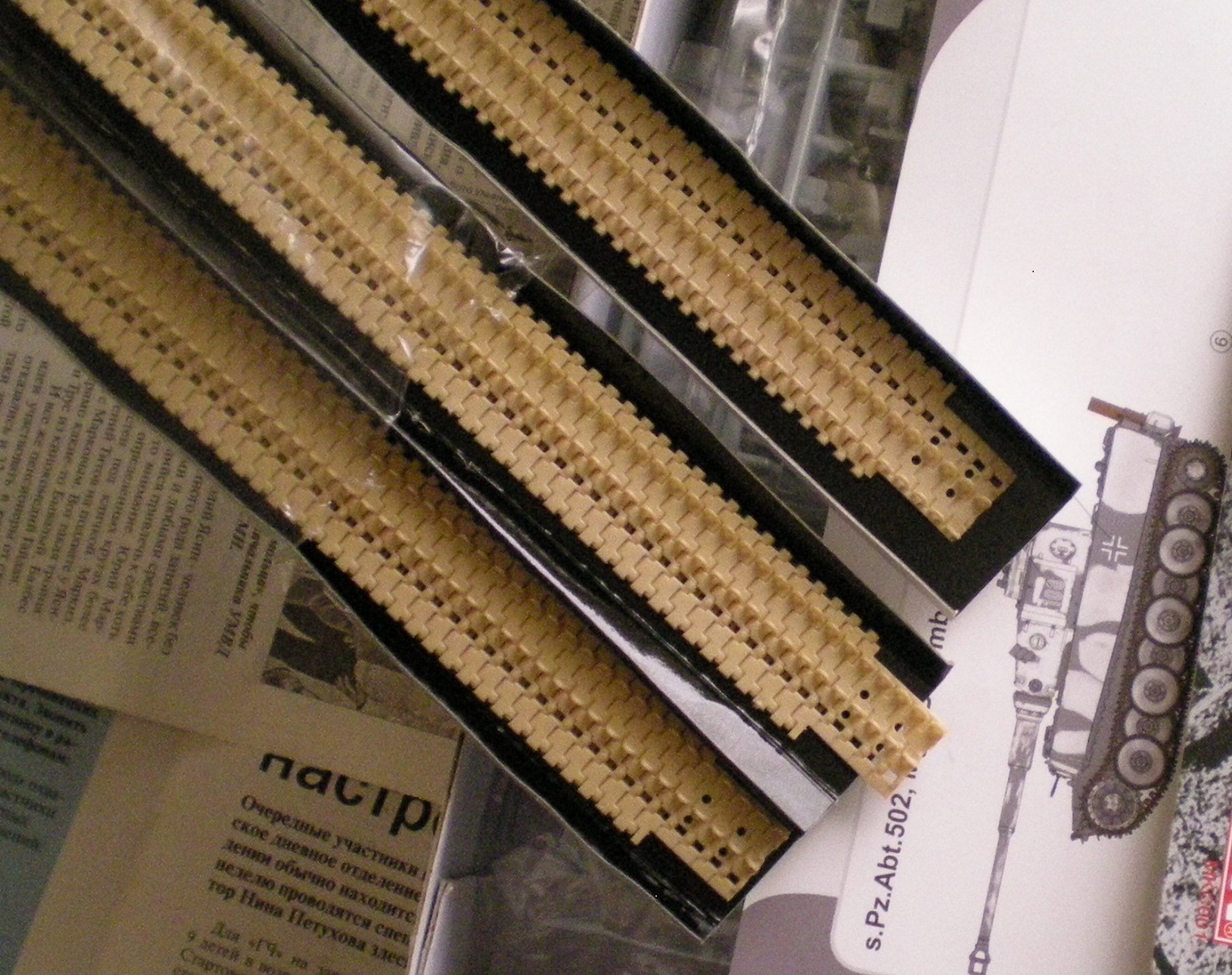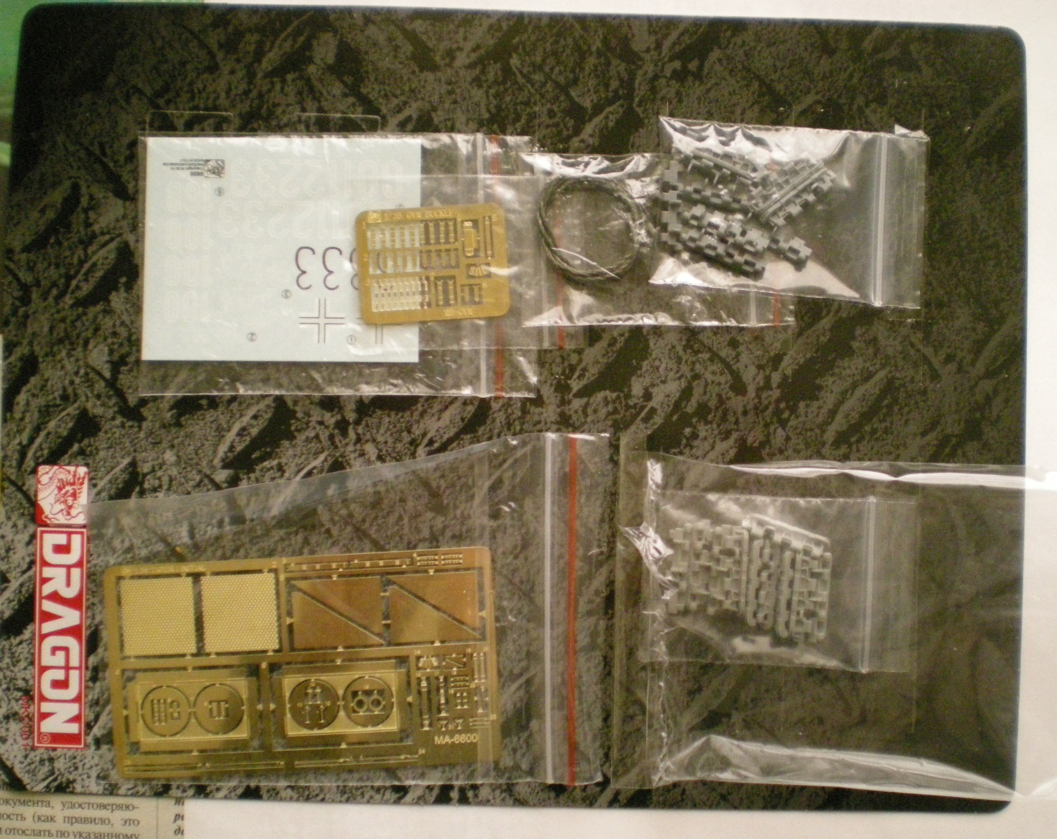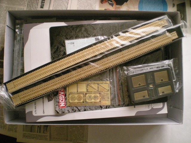 В коробке лежит 16 литников серого пластика, корпус танка, 3 платы фототравления, 3 виниловых гусеницы, 2 троса, декали, схемы окраски и инструкция. Качество на высочайшем уровне. Инструкция большая ,но понятная.