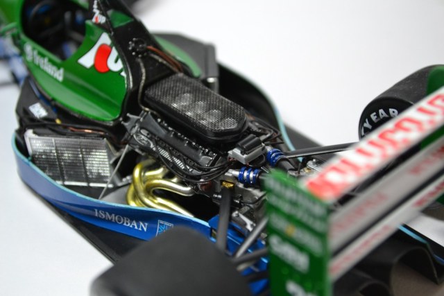 Небольшим доработкам подвергся моторный отсек - сымитировал проводку, добавил распорки двигателя. Покрыл карбоновой декалью часть торцевых пластин переднего антикрыла. Ремни пилота не решился делать - попробую это дело на следующей модели.