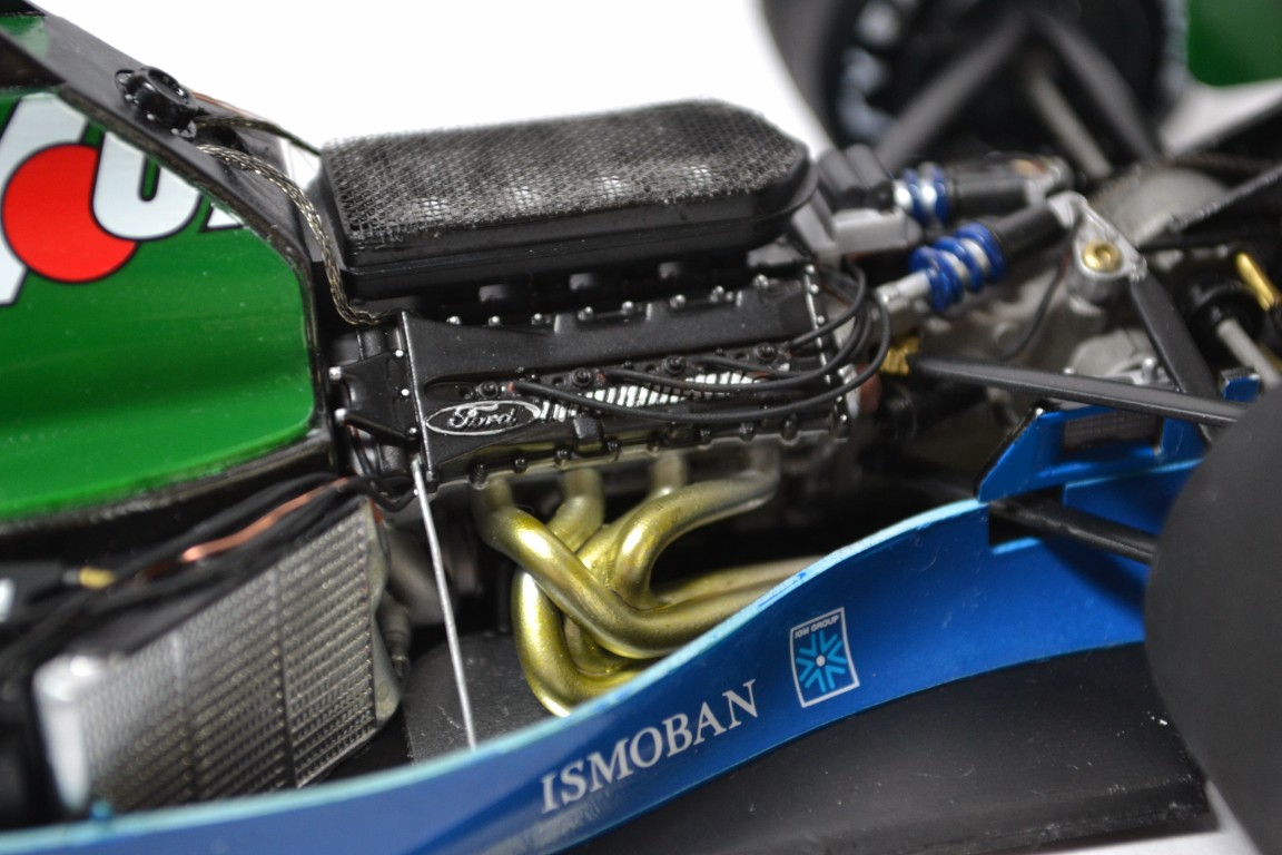 Очень приятная модель! Очень понравились трубы выходного коллектора - у меня Лотус 107, тяжело выскребать облой на этих кишках... Не подскажете, диски колёс и рычаги подвески красили? По поводу днища - до 1994-го года, после запрета граунд-эффекта в начале 80-х у болидов Ф-1 оно было плоским и никаких досок на нём не было. На модели днище приходится ровнять с обеих сторон, т.к. с внутренней стороны Тамия оставляет толкатели, а низ при отливке рёбер под монокок получает утяжины. Вы могли бы набрать ещё "очков в копилку", представив днище со следами потёртостей и с выходами выхлопных труб! Спасибо Александр, очень вдохновляюще!!!