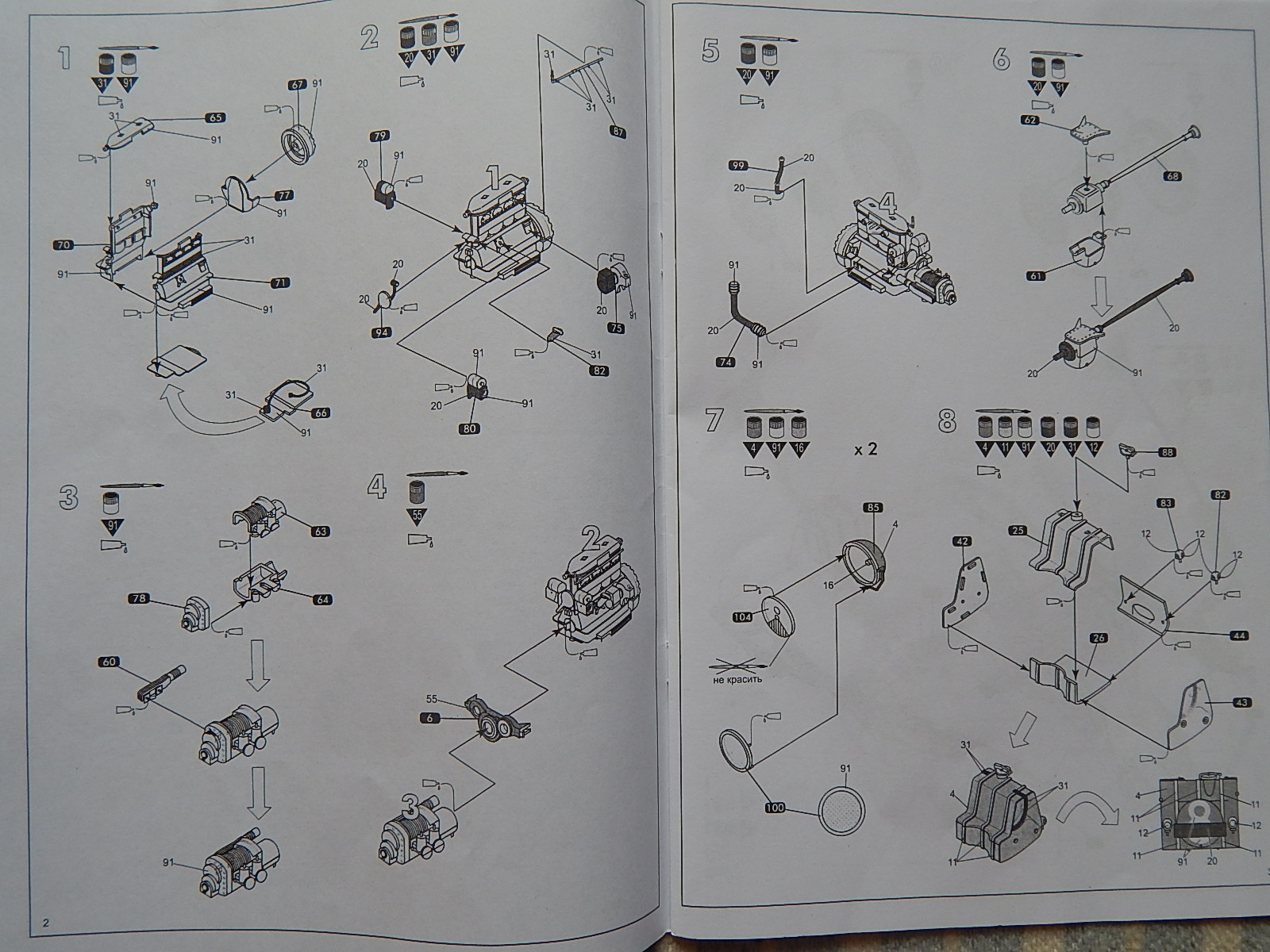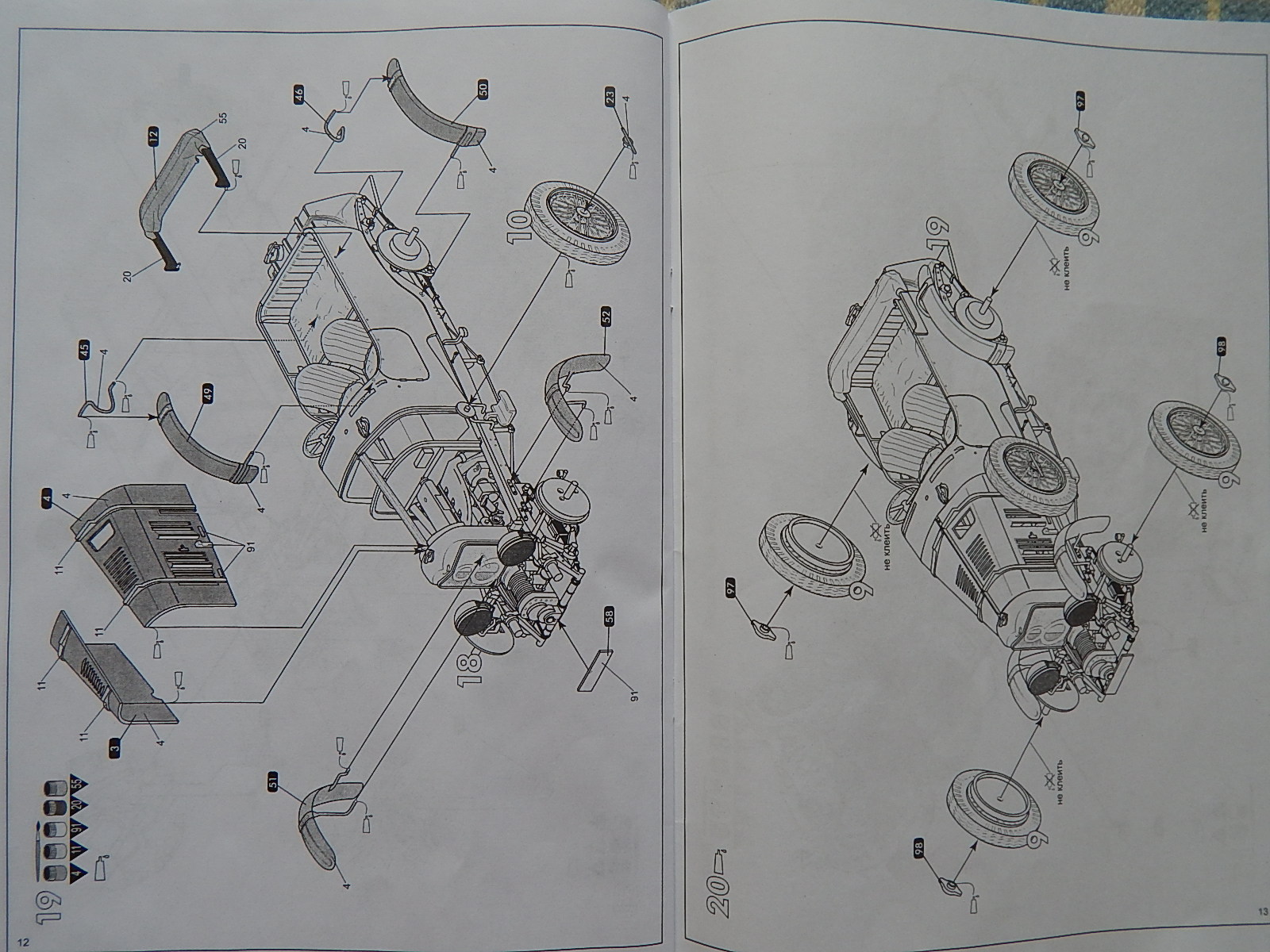 В наборе мы имеем хорошо читаемую инструкцию, сделанную в виде книжки на 16 страниц, 4 литника тёмно-зелёного цвета, 1 литник хромированного пластика, 1 литник с прозрачными деталями и 5 резиновых колёс. Качество литников хорошее, утяжин и облоя не обнаружил. Посмотрим, как поведёт себя модель при сборке.
