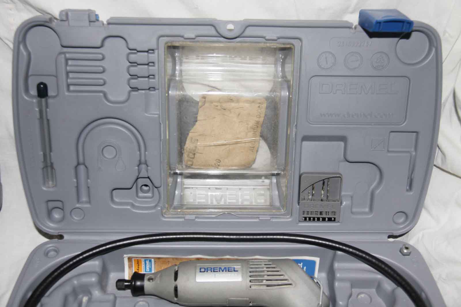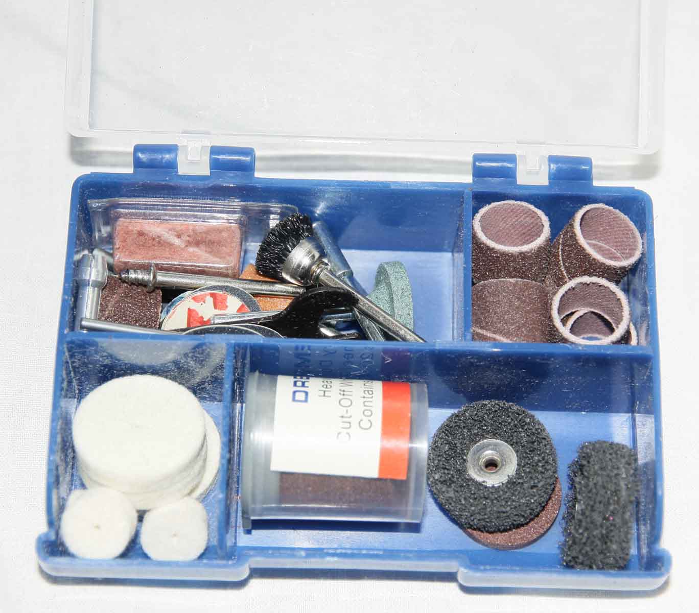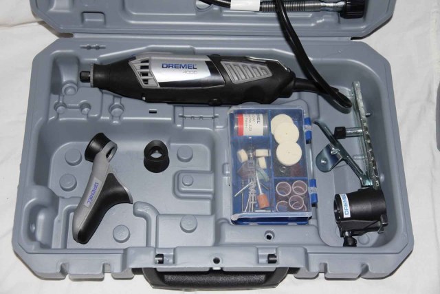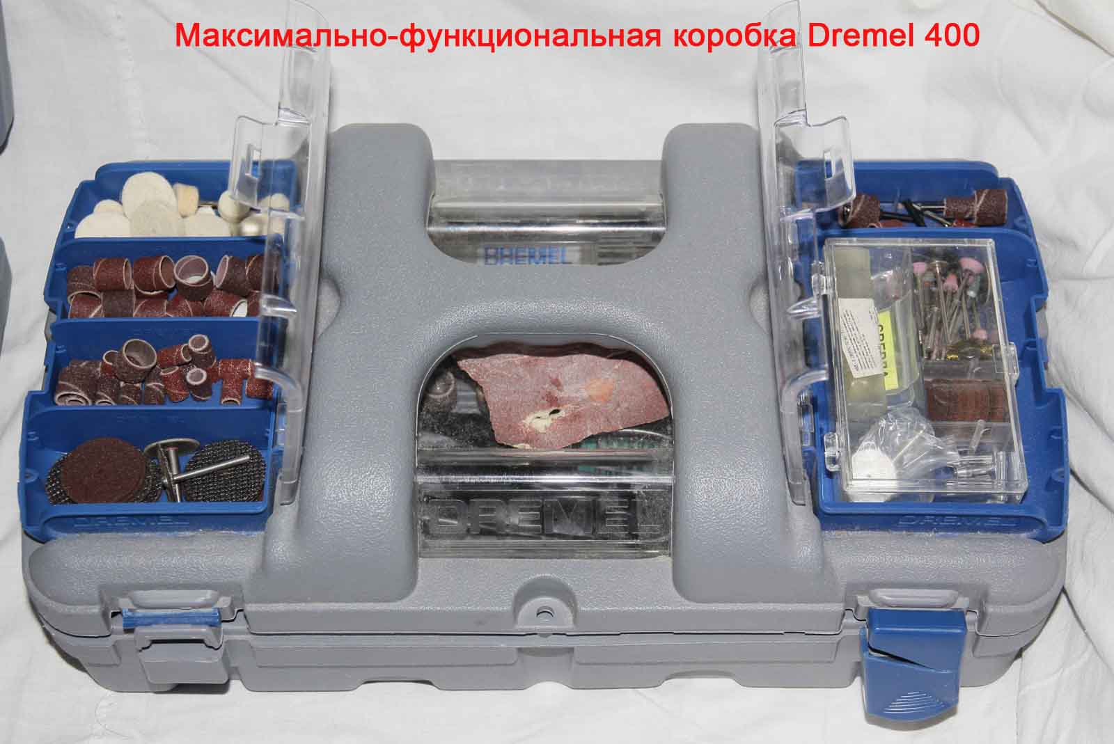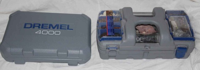 Кейс. Хороший прочный пластик, такой же был на моем Dremel 400. Только после 6 лет плотной эксплуатации оторвались защелки. Т.е. надежная вещь. По сравнению с кейсом от Dremel 400 вещь совершенно не функциональная, большая часть насадок просто лежит внутри и при переноске весело звенит. Надо как-то его модернизировать...