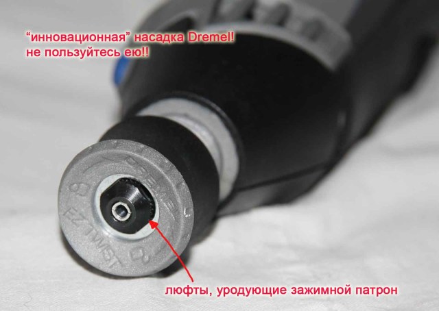Инновационная насадка для быстрой установки/съема хвостовиков. В этой насадке встроен ключ, отвинчивающий металлический зажим цанг , но из-за больших зазоров между ключом и зажимом, последний будет очень быстро (примерно через год) раздолбан и смят. Ключиком с такими же зазорами я пользовался на Dremel 400 и через год полностью убил зажим, теперь зажимаю плоскогубцами.