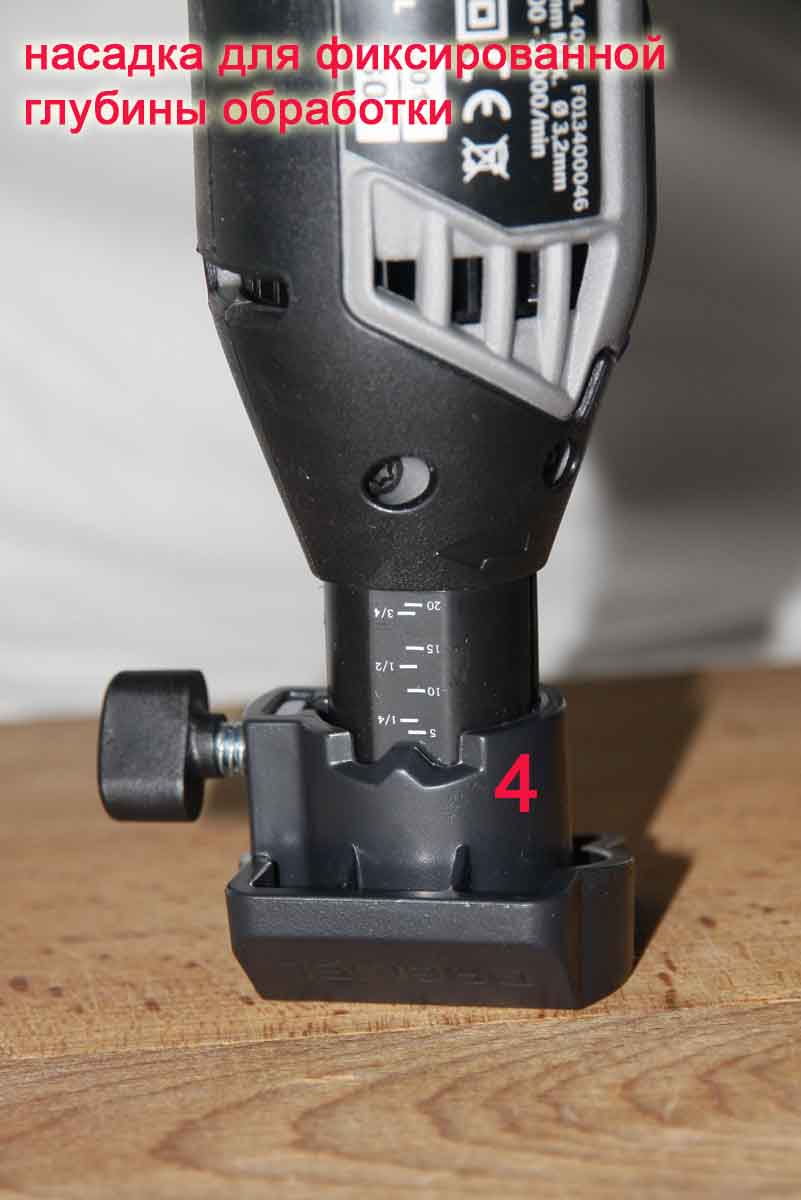 Насадки для циркульной и параллельной резки. Сделаны из пластика, а направляющие из толстой стали. Кроме всего прочего имеют возможность телескопически менять глубину реза путем поднятия инструмента относительно насадки. Дана шкала подъема.