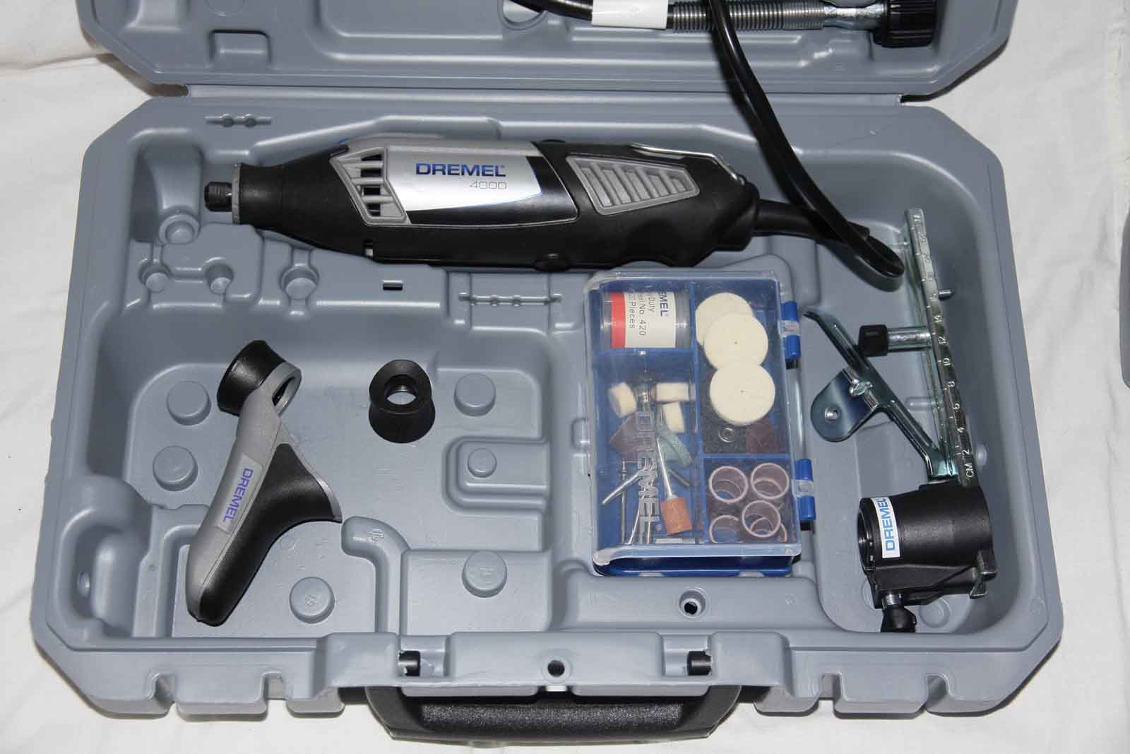 Всем доброго времени суток. После 7 лет бесперебойной работы Dremel 400 у меня полностью развалился зажим цанг параллельно повредив резьбу на валу. Думая, что отремонтировать не получится, заказал в интернет магазине Dremel новую модель Dremel 4000. Маркировка набора 4000 4/65.