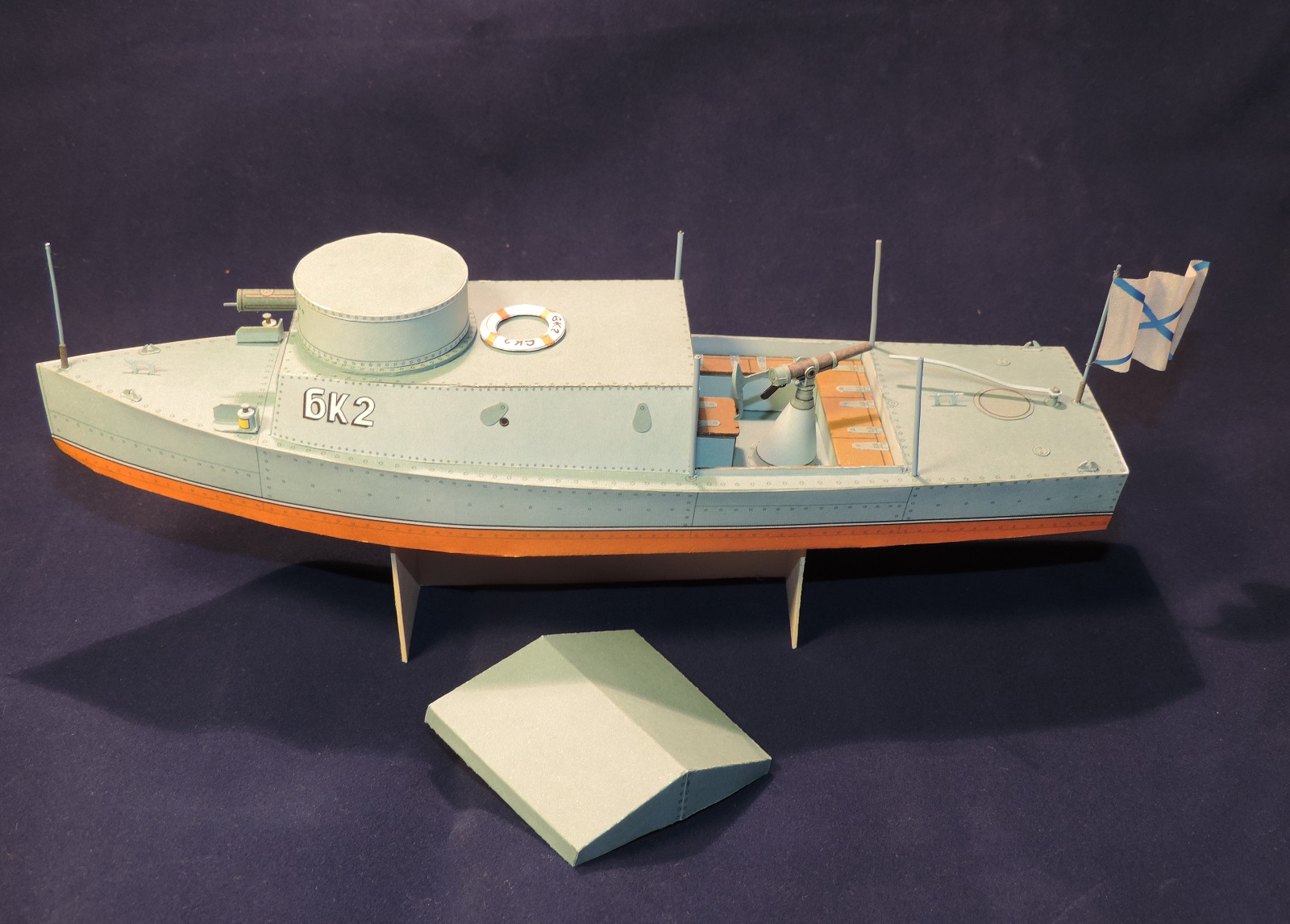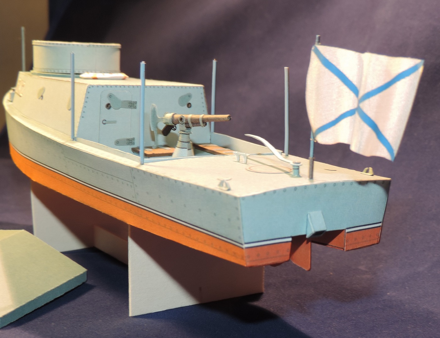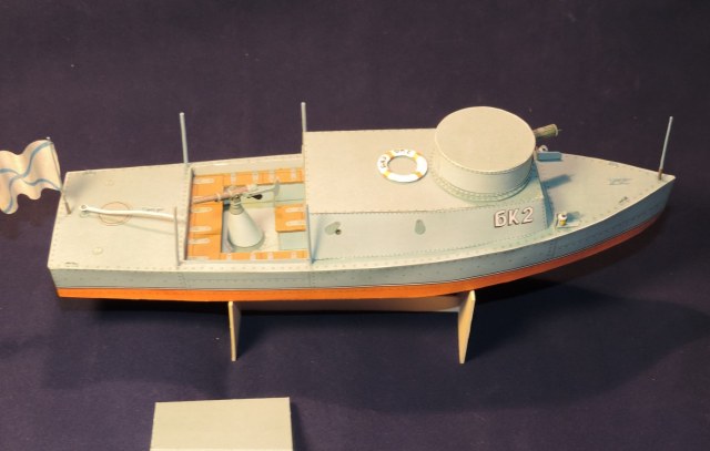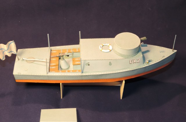 Борис уважаю ваши работы,но позвольте не согласится.на речных катерах и лодках тогда вешались просто фонари желтого огня на носу и корме.собиралось по как есть на выкройках.детали не перекраивал а сделал как есть.не было задачи сделать шарниры рабочими.ну а если копать так и у вооружения хватает минусов и вопросов))) приглядитесь хоть выкройке пулемёта.)))за волнистую броню и палубу, спасибо,исправлю видно отошла. Беда данного набора,если кто соберётся делать, помимо довольно корявых раскроев, в том что для такой довольно крупной модели напрочь отсутствует силовой набор.Ну и последнее, собирал не столько для себя,сколько понять смогут ли дети такое сделать)))у каждого свои причуды)))