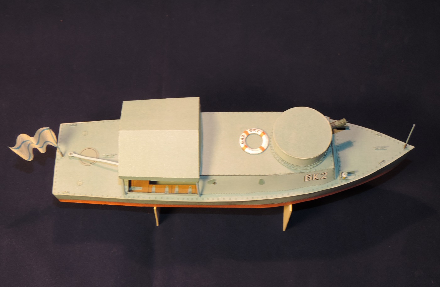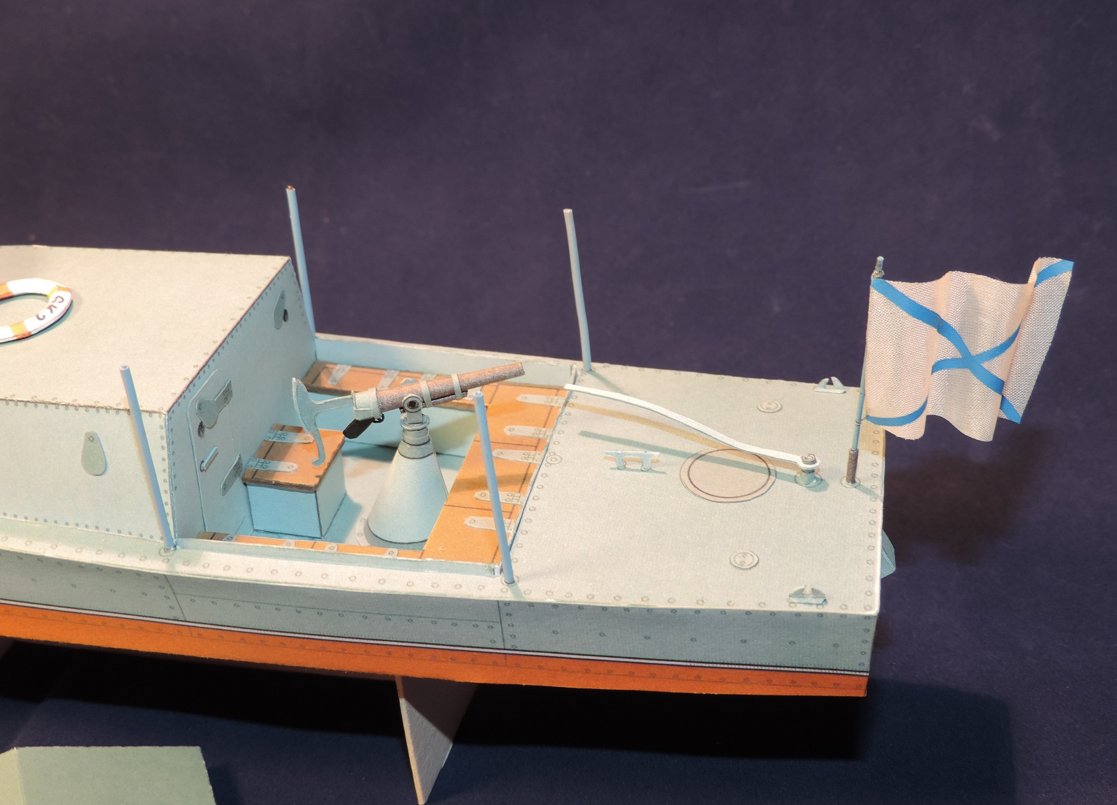 Из замечаний бортовые огни у вас выполнены в одном цвете желтом, а должно быть один борт зеленый другой красный, хотя возможно для речных катеров на указанный период 1916г. действовали другие правила. И следующее замечание касается андреевского флага, мне кажется он слишком большой для такого катера. Но это уже придиризмы.