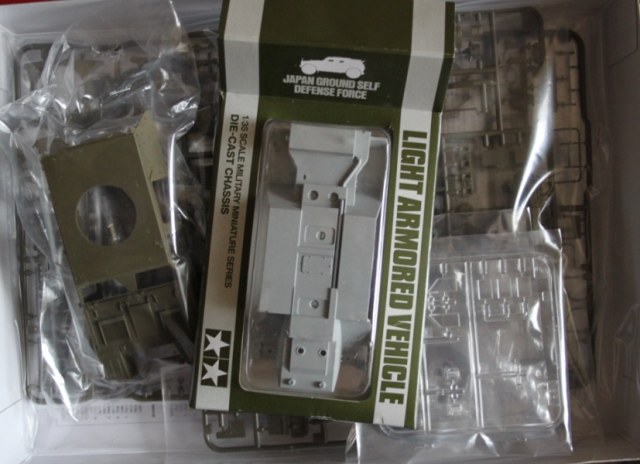 -внутри находятся: 2 литника зеленого цвета со всеми детальками, кузов модели, 4 резиновые покрышки с подробной детализацией протектора, литник с остеклением, пакетик с болтиками и еще одим со втулками для колес (видимо) и самое "вкусное" металлическое днище,которое значительно добавит веса готовой модели ну и конечно картонка с декалями.