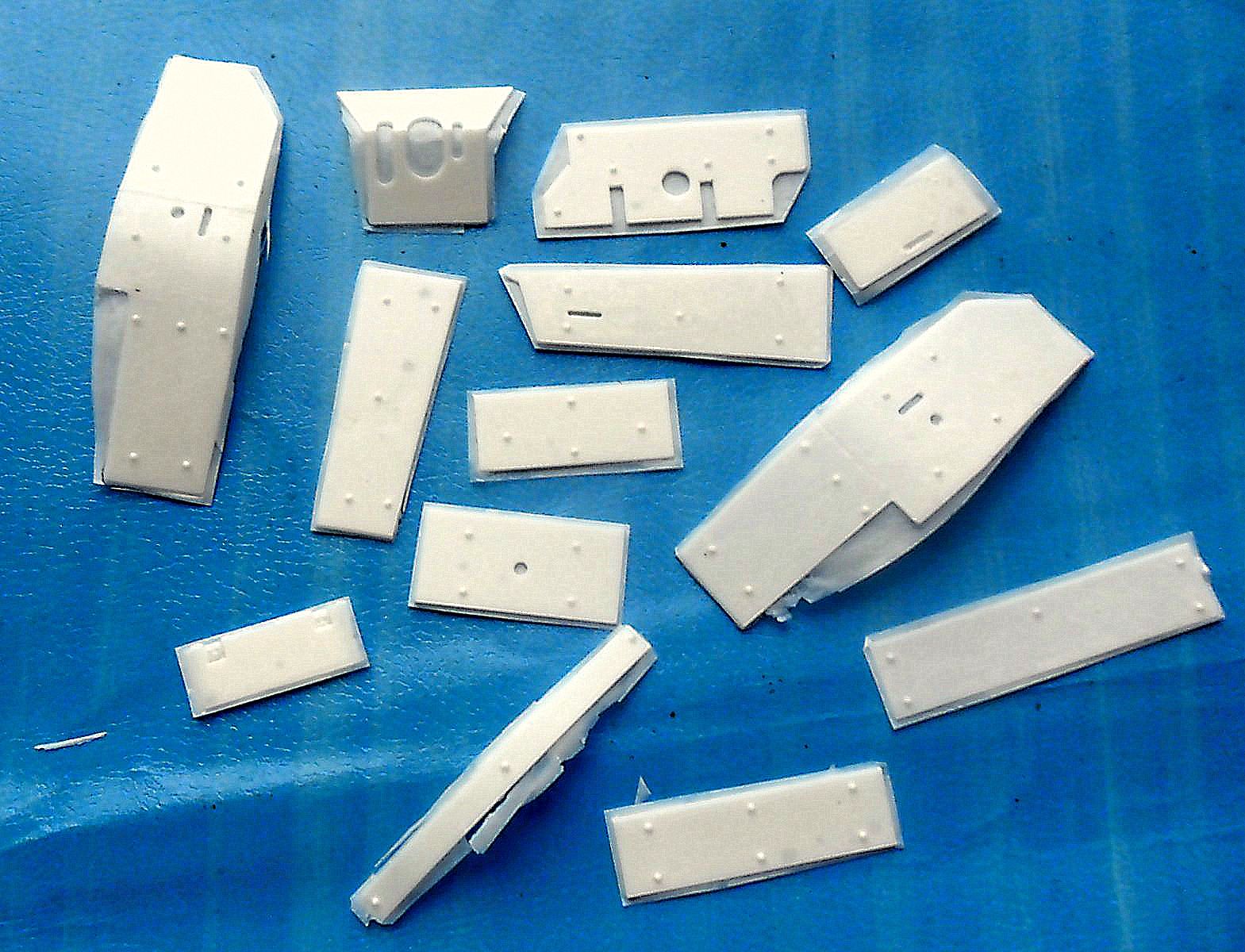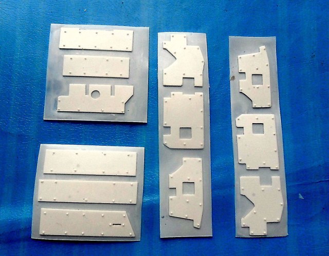 Наборы представляют собой смоляные детали, изображающие дополнительные листы брони для различных вариантов экранировки. Смола белого цвета, достаточно тонкая. На бронелистах присутствуют необходимые изображения гужонов, болтов, клепок и сварки.