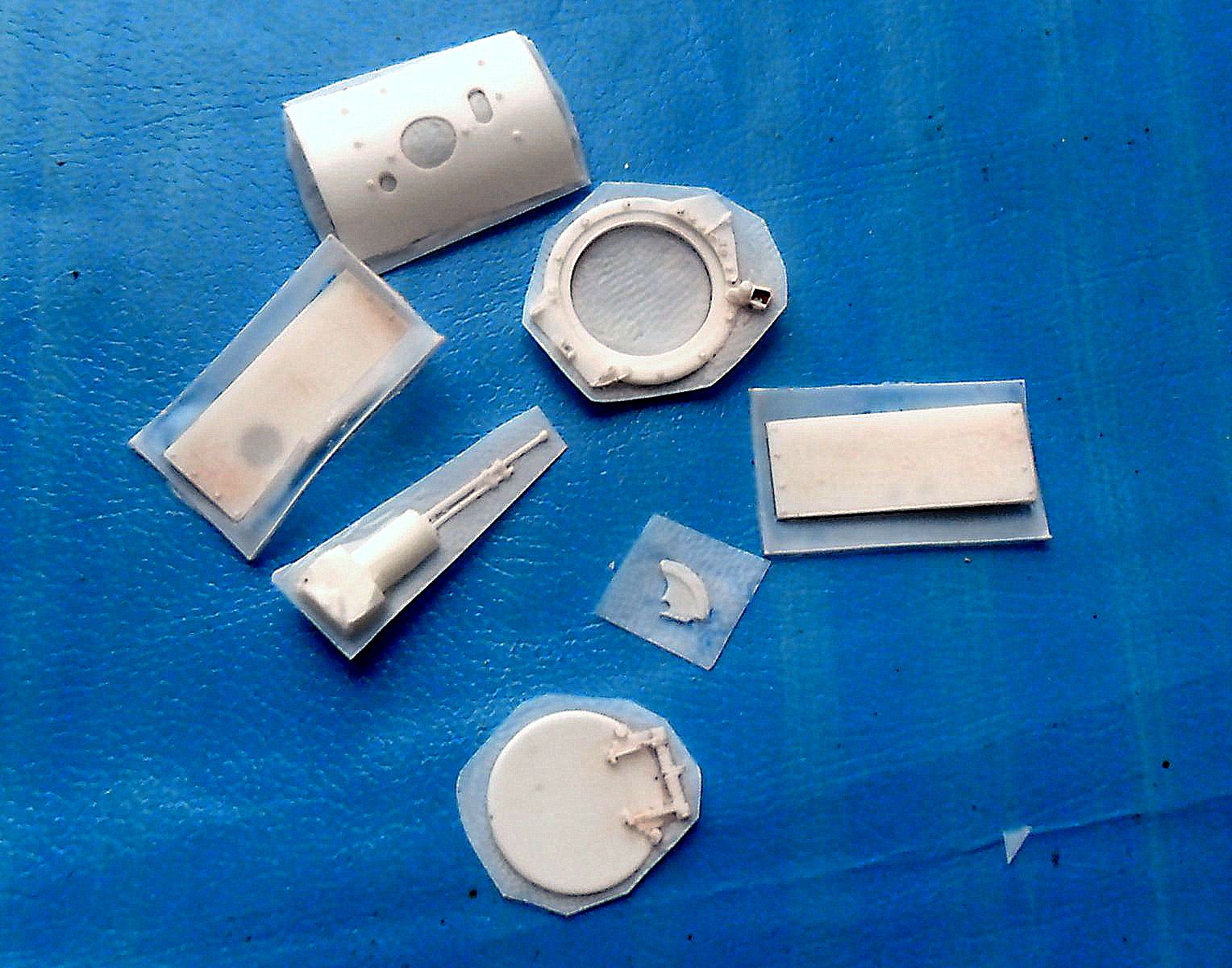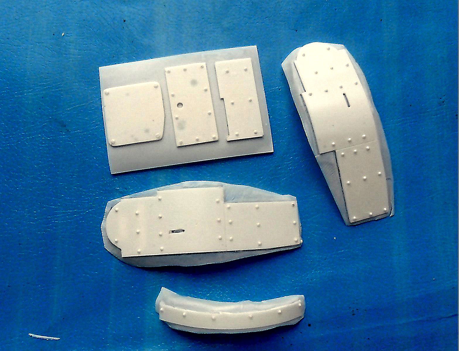 На фото №№ 4-6 изображен набор из 24 деталей для воссоздания модели Т-26 с цилиндрической башней по образцу экранировки, выполняемой на заводе № 174 в период финской войны. Здесь имеются детали для экранировки корпуса, включая борта за гусеницами, башни и детали для люка с турелью (но это не обязательно, т.к. не у всех экранированных машин были такие люки). Образец такой экранировки есть на фото, к примеру, финского трофея, но там на машине отсутствует турель и есть двугорбая крышка, есть фото машин и других вариантов. Так что данный вариант буду делать из "хоббибоссовского" Т-26 обр. 35 г.