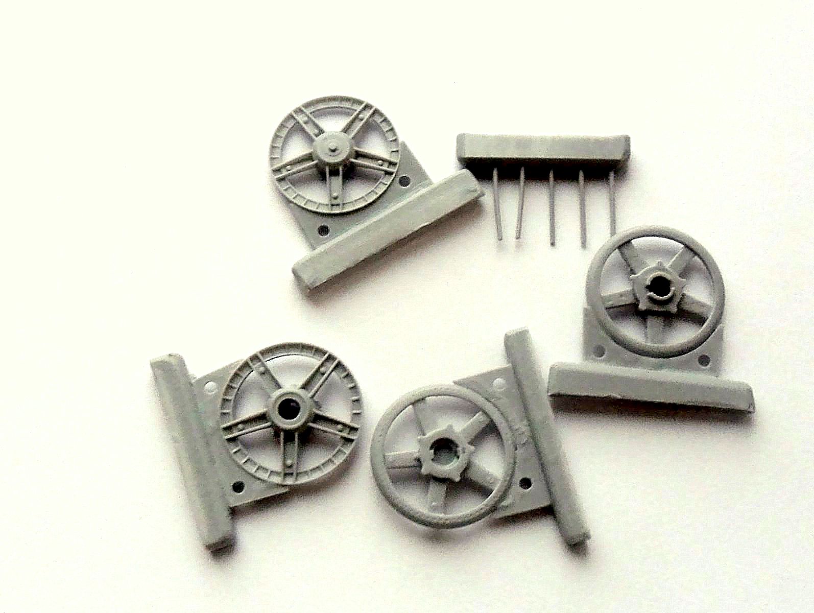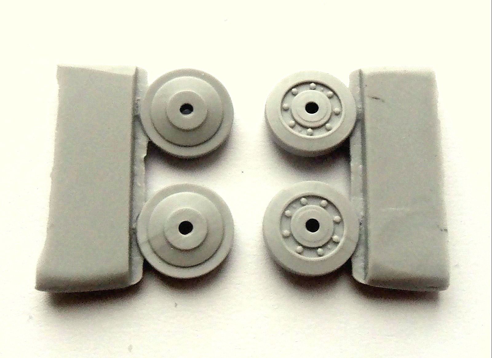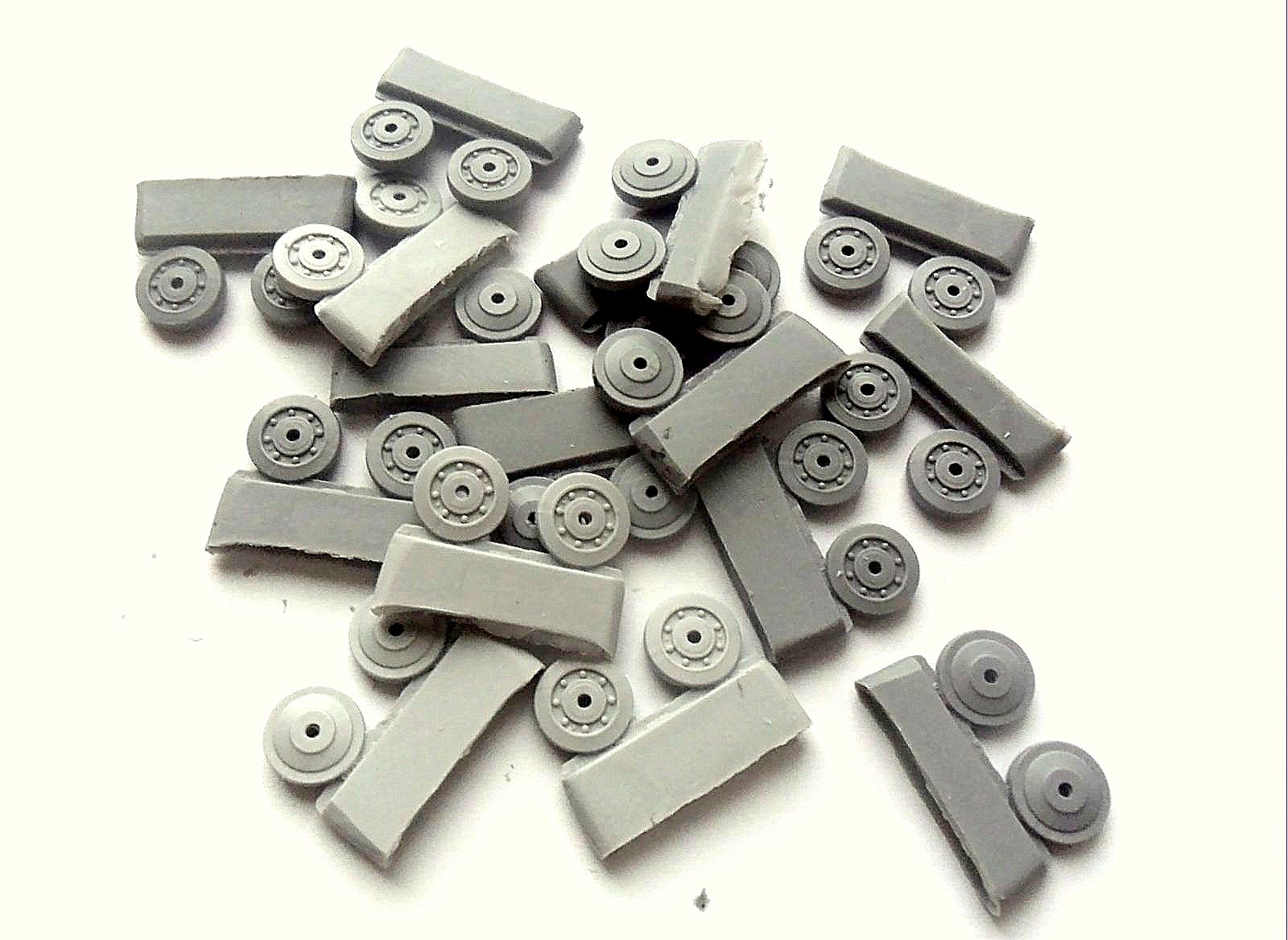 Набор включает в себя поздние ленивцы и поздние опорные катки со съемным бандажом. Детали отлиты из смолы серого цвета, наподобие изделий "Комплекта ЗИП". Все детали пролиты очень четко, никаких подводных камней нет, за исключением необходимости обработки мест приливов смолы.