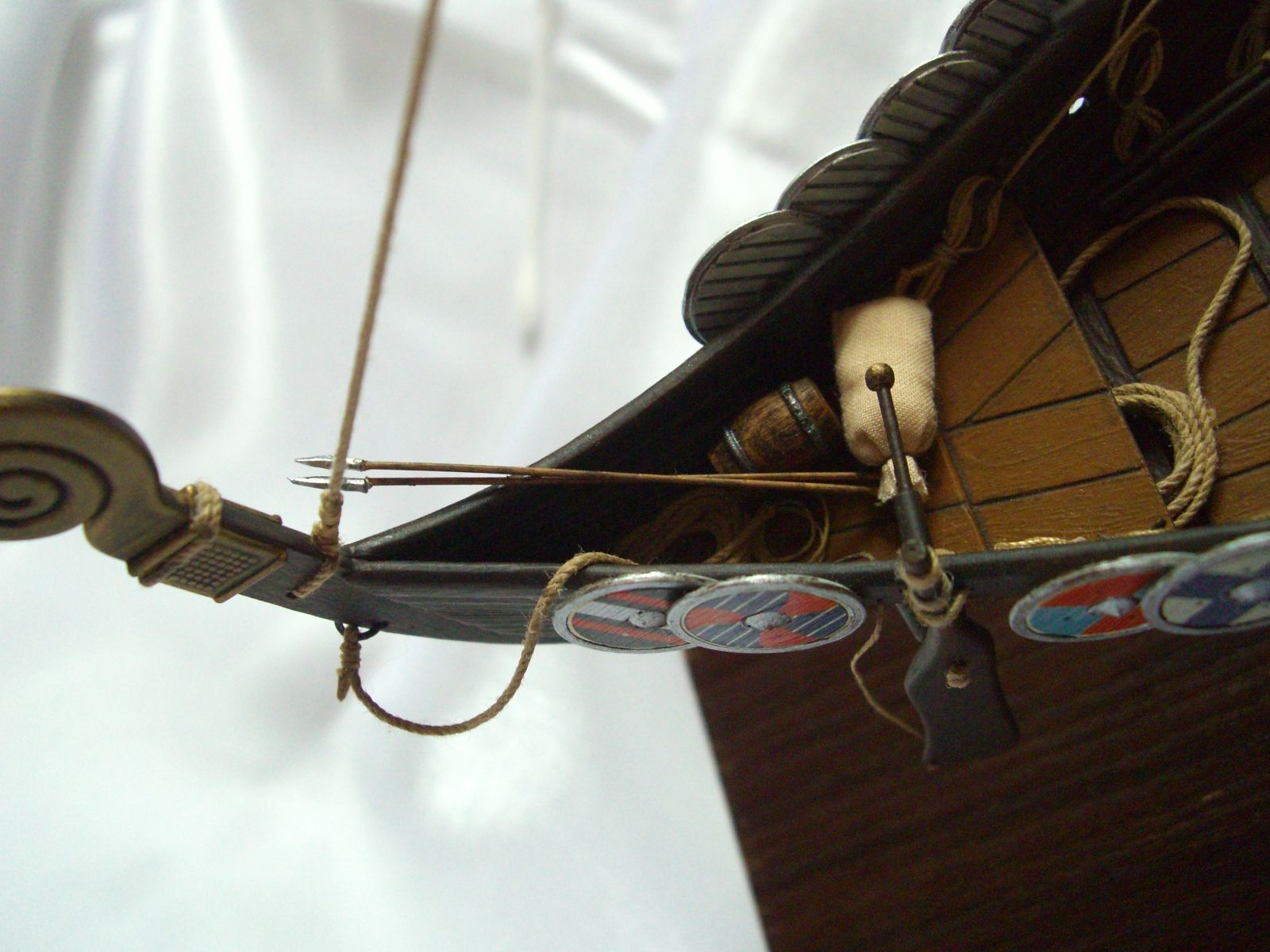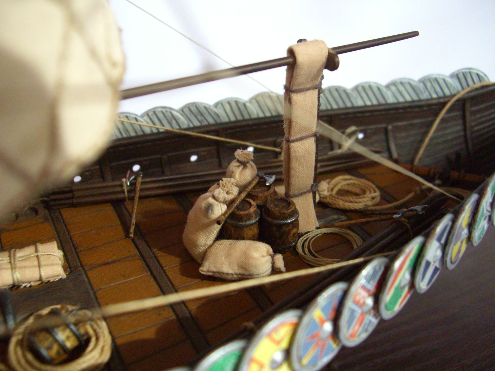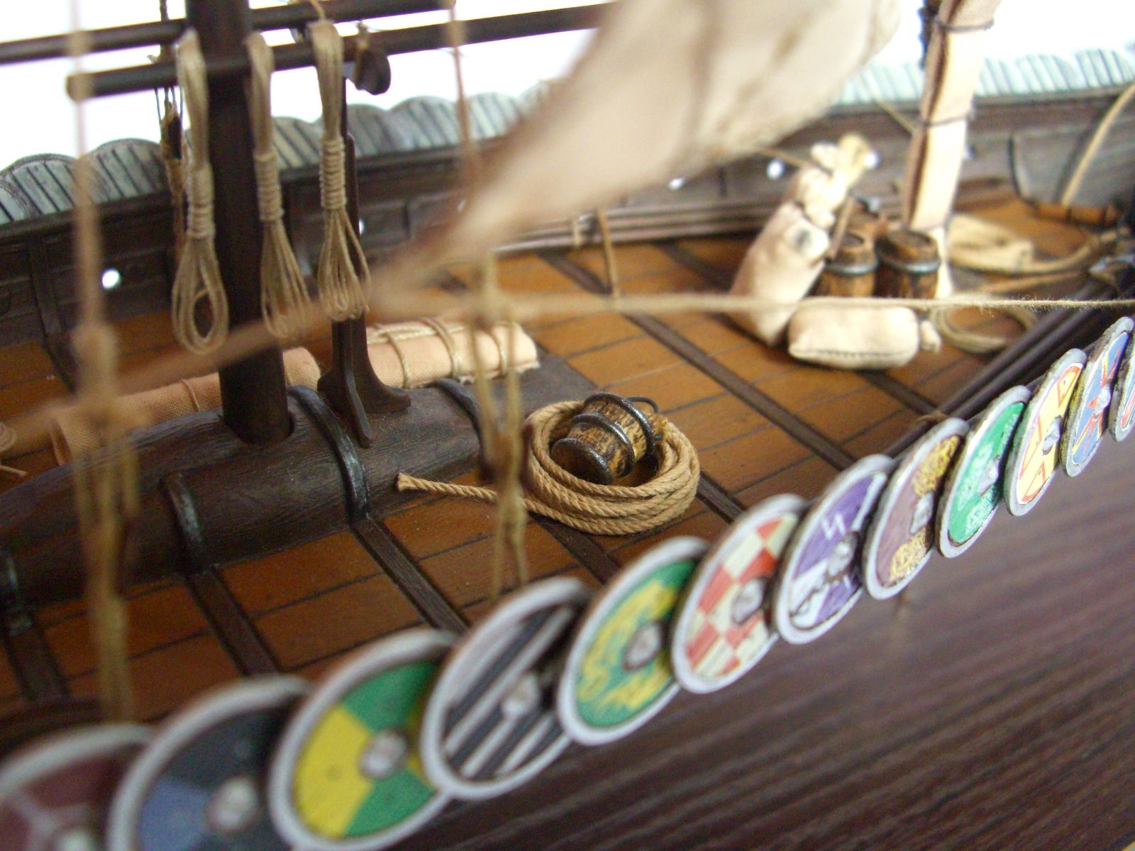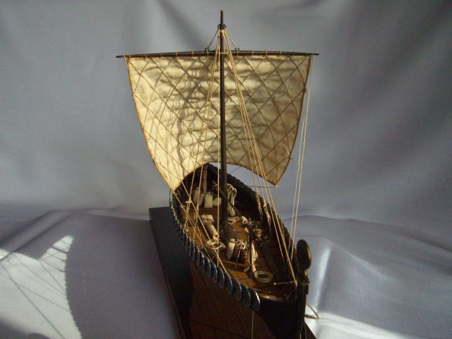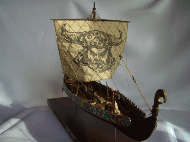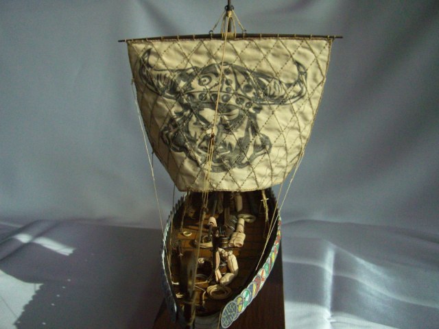 в общем то понравился корабль, но вот парус - просто лоскутное одеяло, т.к. прострочка слишком грубая. В этом масштабе, получается, что парус прошивался канатами. Рисунок на парусе - это вообще шедевр, такого не могло быть, а если даже и могло, то таких картин викинги точно рисовать не могли. Первое, на что я посмотрел - это парус - он убил всю серьезность восприятия, но , в общем-то, в галерею можно
