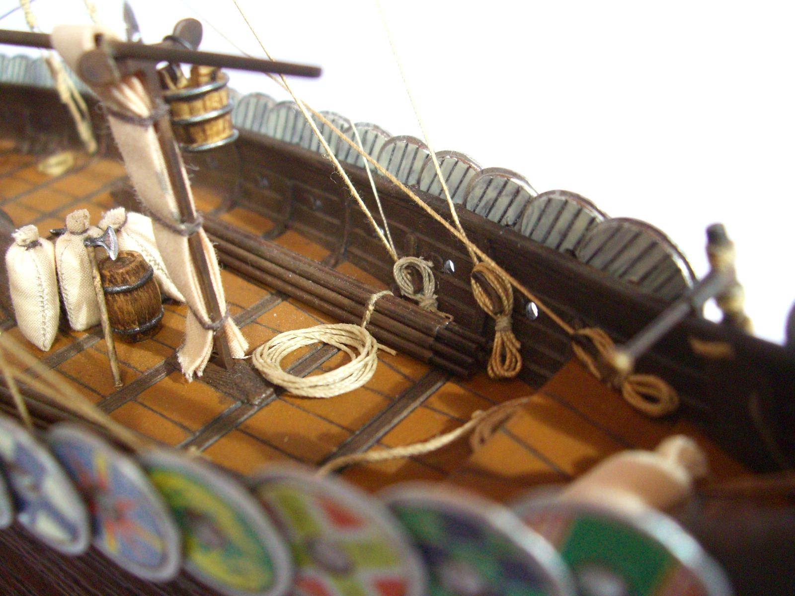 Пластик,но хорошо покрашен за небольшими упущщениями.Прострочка паруса-нонсенс.Во-первых очень грубая/крупная/,а во-вторых-это просто сшивка полос ткани в одно полотнище и швы идут сверху вниз.Диагональная прострочка-фантазия.Рисунок тоже не в теме.Снасти:одни безумно волосатые/надо либо обжигать,либо вощить/,а другие откровенная синтетика.Ну и обручи на ведрах и бочках совсем не катят.Они же плоские должны быть.Щиты ярко слишком покрашены.Приглушить бы чуток.Но в галерею можно.