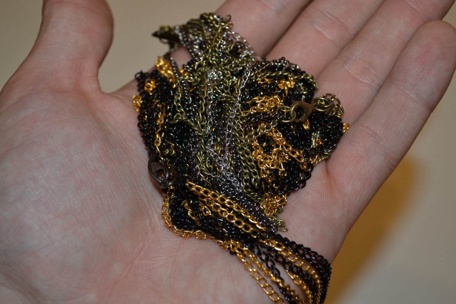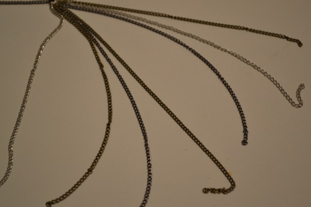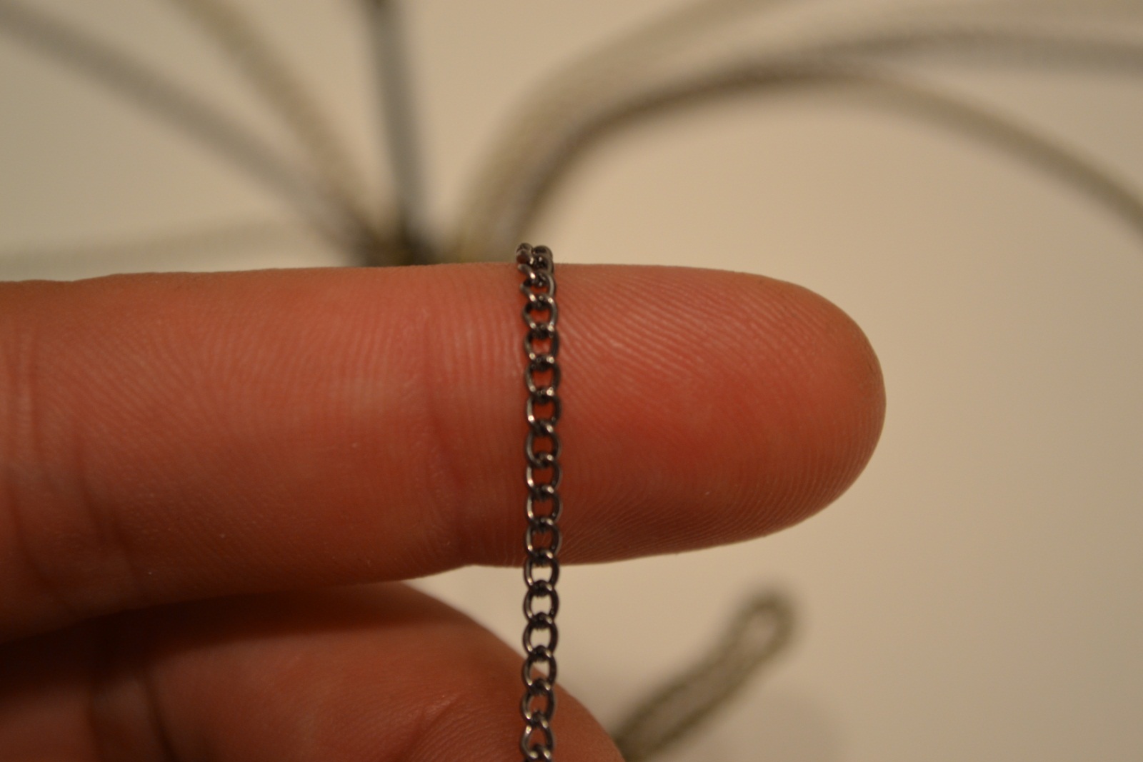Многим часто приходится имитировать цепи.Недавно в магазине Fix Price (http://www.fix-price.ru/about/) я купил по 28 р. 3 украшения,содержащих различные цепочки.В итоге за 84 р. я получил 5, а может и все 7 метров различных цепей. Выбор украшений в магазине сети Fix Price достаточно широк, есть цепочки с крупными и мелкими звеньями, овальными и круглыми, со смешением. Магазины есть во всех больших и средних городах. Конечно это Китай, пусть это не и не 100% соответствие оригиналу до сотых долей миллиметра, но,мне кажется, это достаточно реалистично,дешево и сердито. Буду рад, если кому пригодится