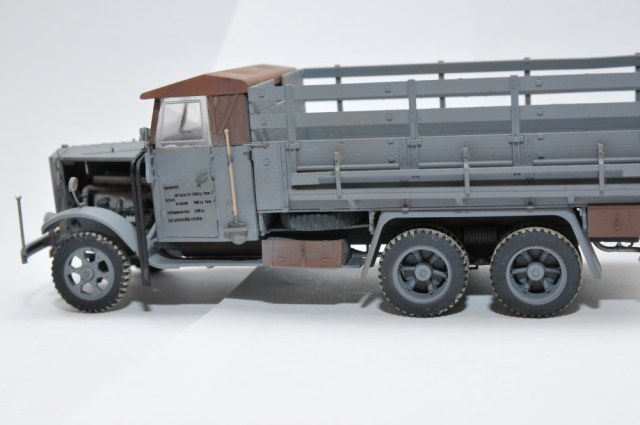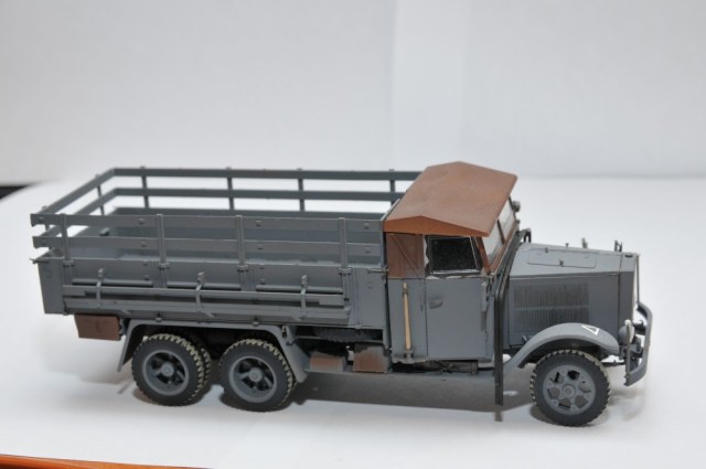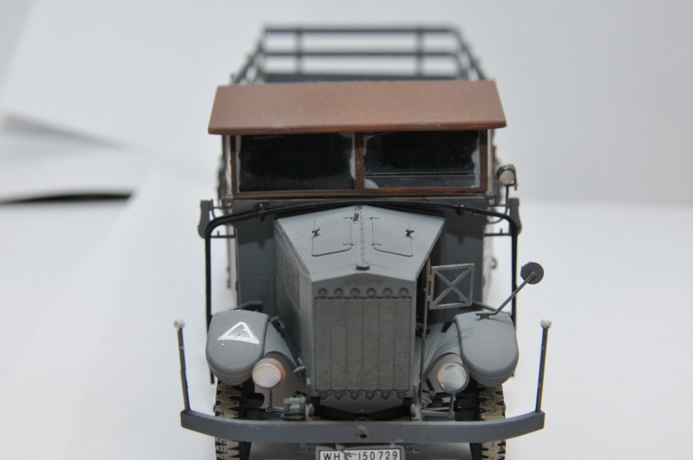 Складывается впечатление, то забыли покрасить рамки боковых стекло, залитое клеем лобовое стекло надо замаскировать. сделать трафарет по форме дворника из модельного молярного скотча и задуть светлой - песочной краской. Крыша коричневая. почему? если это брезент. то ее бы покрасить в цвет брезента. ящики под машиной коричневые то же не понял зачем, если ржавчина, то как - то странной смотрится на фоне обсолютно чистой машины.