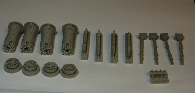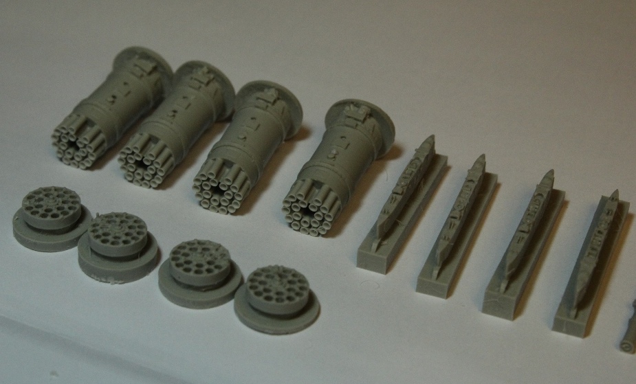 Здравствуйте, дорогие каропчане! Спешу поделиться впечатлениями от купленного сегодня конверсионного набора вооружения для Ми-24 в 48-ом масштабе! Набор включает в себя 4 блока НАР Б8В20А, 4 ПТУР "Штурм" и 4 пилона. Всё это очень качественно отлито из смолы и очень-очень похоже на настоящее вооружение. На направяляющих трубах блоков НАР намечены очень хорошие углубления, которые не составит ни малейшего труда рассверлить для достижения нужной глубины, что придаст неповторимой смотрибельности на модели!