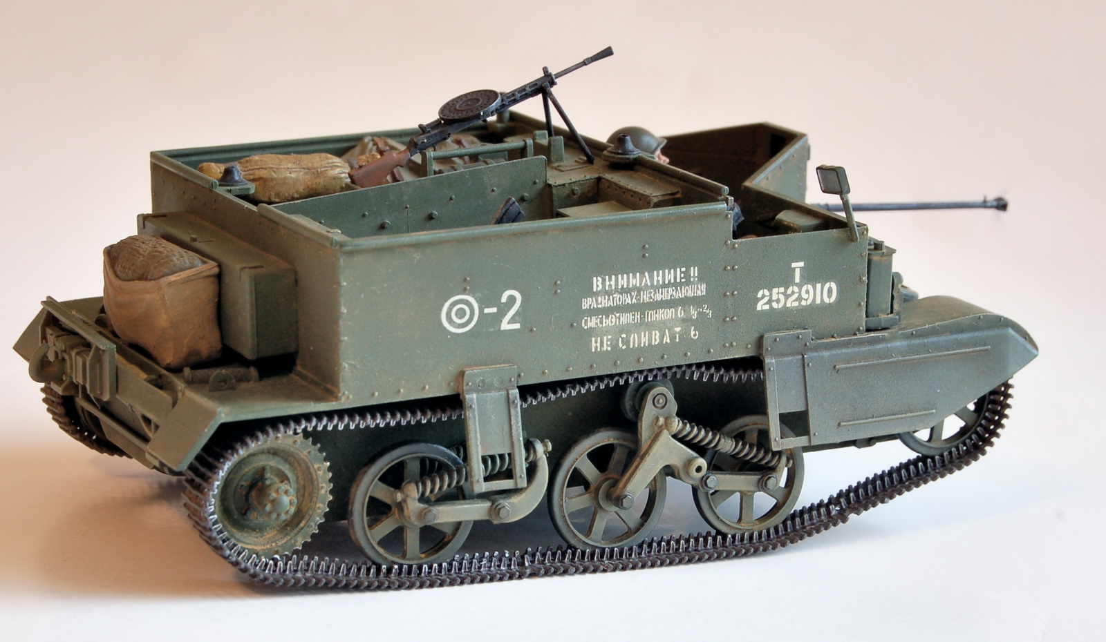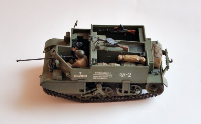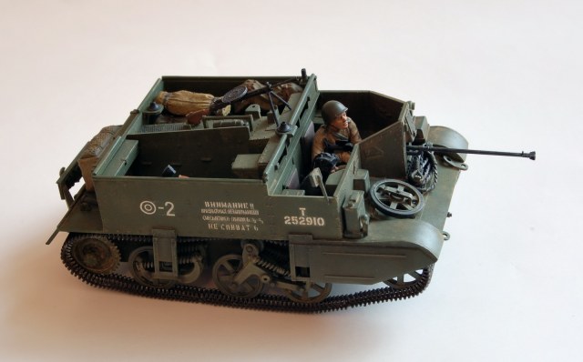 Года 4 тому назад захотелось взять небольшого "британца" и сделать его на сужбе в РККА.Был взят "слегка" обновленный тамиевский кит British Universal Carrier Mk II Forced Reconnaissance No 35249 в масштабе 1/35 (http://www.super-hobby.ru/products/Universal-Carrier-Forced-Rec.html). Обнавленность его заключается в добавке к старым литникам 1976 года литника 2001 года с 3-мя новыми англичанами, да еще и новая декаль была. Модель в сборке была хороша. если делать "из коробки", то очень даже не затруднительно,и может получится "модель выходного дня". что-бы подчеркнуть "нашесть" машины добавил водителя из "звездовского" набора танкистов и стрелка с противотанковым ружьем.стрелок - переделка бойца из тамиевского набора (35306 Russian Anti-Tank Team http://www.super-hobby.ru/products/Russian-Anti-Tank-Team.html),оттуда же и ружье.