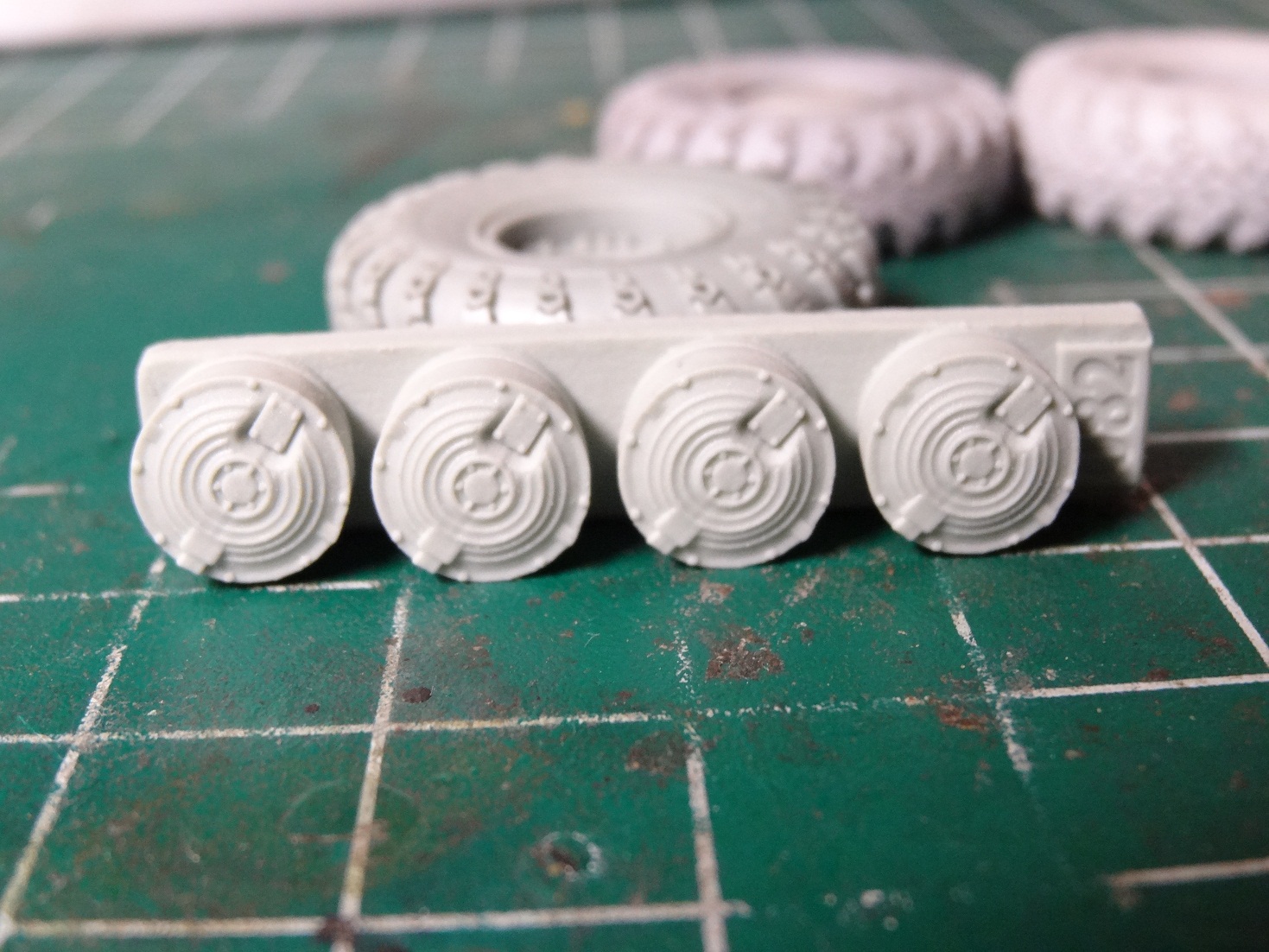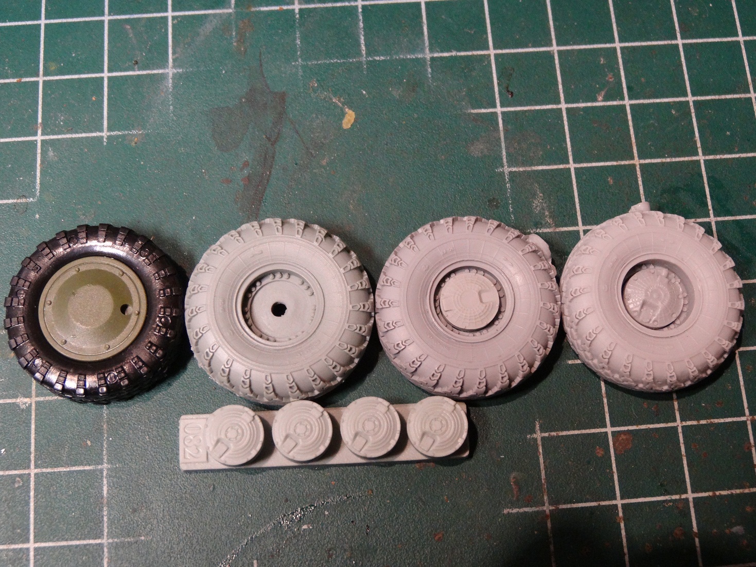 Миниармовские колеса хорошо проработаны,но на мой взгляд немного узковаты,да и ступицы надо стачивать серьезно,чтобы утопить. А на бтр 82 так еще и отсутствуют проставки для крепления в наборе,запаски тоже нет как на бтр-80.