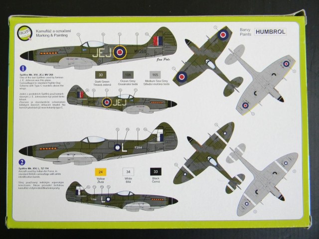 Добрый день, уважаемые коллеги. Представляю обзор модели Spitfire Mk 14e от чешского производителя AZ. Под маркой "Legato", как я понимаю, они выпускают "бюджетные" варианты своих моделей, без фототравления и прочих "вкусностей". Итак: коробка из достаточно жесткого картона, с боковой загрузкой. На передней части - Спит, преследующий Ме-262, или наоборот. Кстати, название самолета на коробке утверждает, что это - модификация XIVc, а рисунок это категорически опровергает. На обратной стороне коробки - два варианта окраски, причем самолет "Джонни" Джонсона потерял законцовки крыла (см. переднюю часть коробки). Видимо, художник, рисовавший эту коробку, был несколько "не в себе" :)