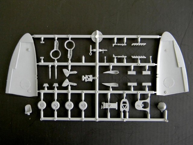 Перейдем к содержимому. В запечатанном пакете видим два литника верой пластмассы, фонарь, инструкцию по сборке (отпечатанную с обоих сторон листа А4) и две декали: одна - опозновательные знаки на 2 варианта, вторая - техничка, причем от Спитфайра I/II.