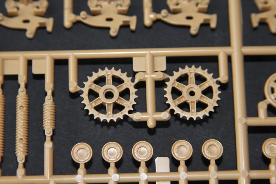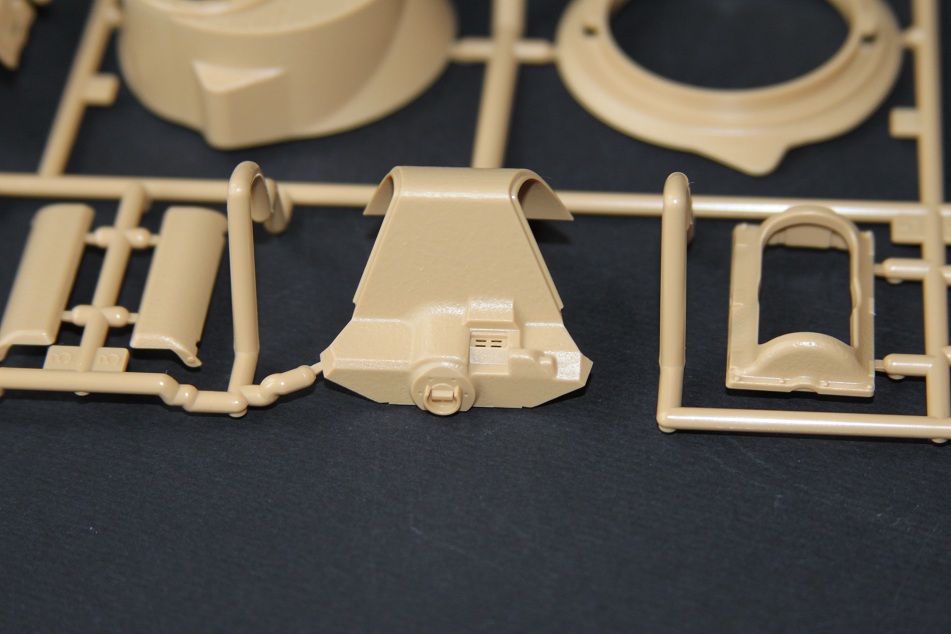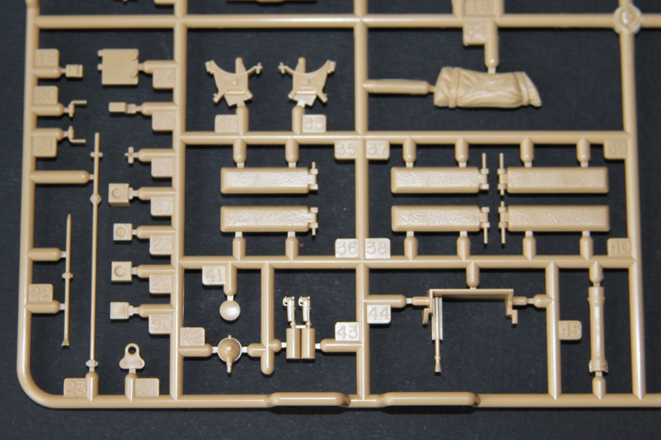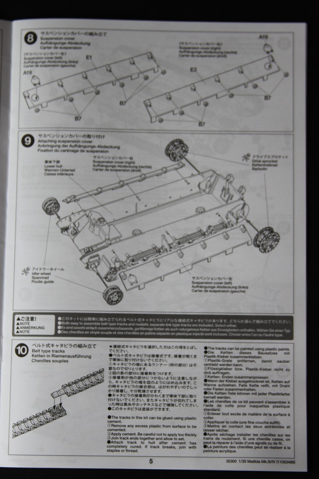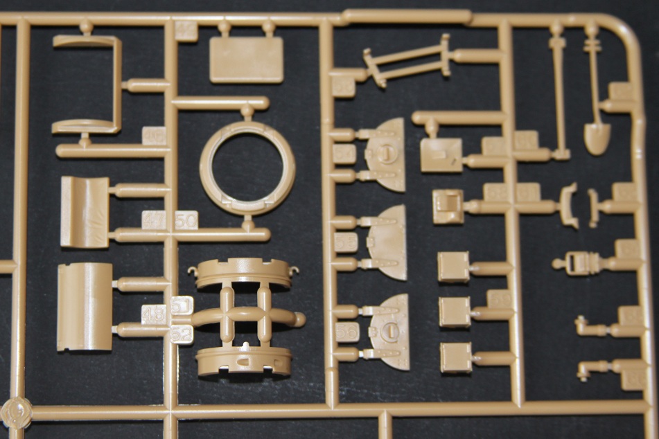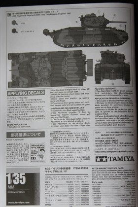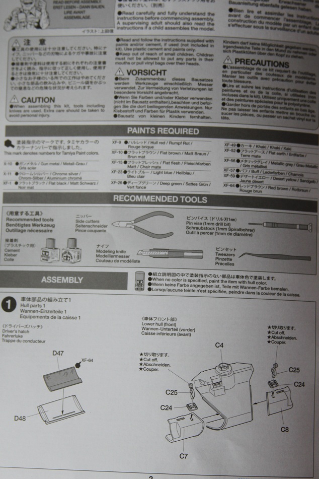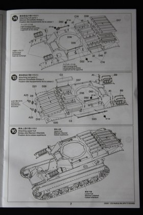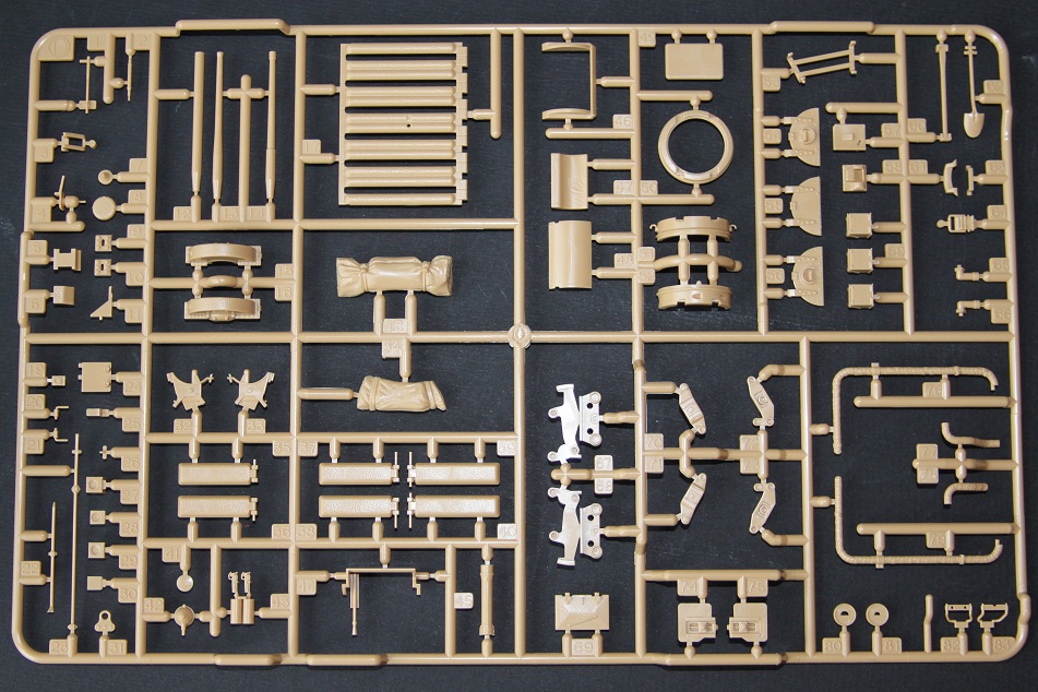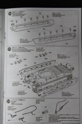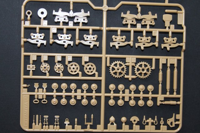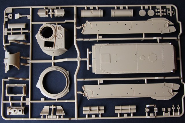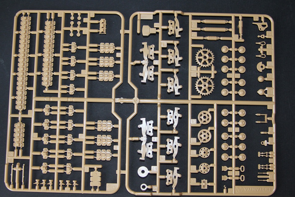 В коробке лежат пять литников песочного цвета, виниловые траки, пакет с резинками для подвижных деталей, отрезок нити имитирующей трос, декаль, корпус танка идёт отдельной деталью. Набор очень хорошего качества литьё чёткое без утяжин и облоя а толкатели расположены на внутренних сторонах. В наборе имеется экипаж из трёх человек , три орудийных ствола , пластиковые траки собирающиеся из нескольких частей, декаль на три варианта под три камуфляжа. Инструкция выполнена в виде книжки на 15 страниц, где подробно показана сборка танка и схемы камуфляжей. Набор хорошего качества, отличный пластик но, как и вся TAMIYA довольно простоватый и будет не лишним взять набор травления и наборные траки.