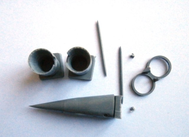 Набор состоит из восьми смоляных деталей, платы фототравления и декали. Смола темно серого цвета, очень приличного качества. Смола однородная, без пузырей. Облоя нет. Радует детализация сопел. Расшивка на смоляной носовой части аккуратная и внятная. ИМХО, имея данный набор, при желании – можно «запилить» любую модификацию разведчика.