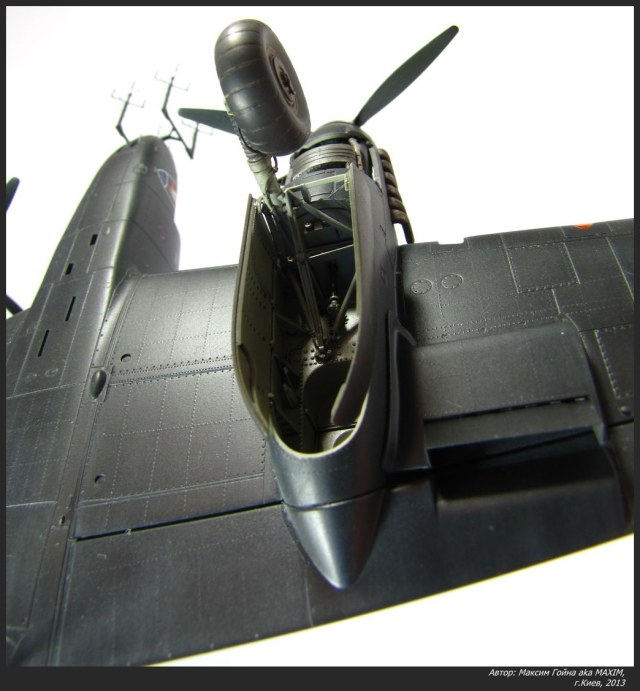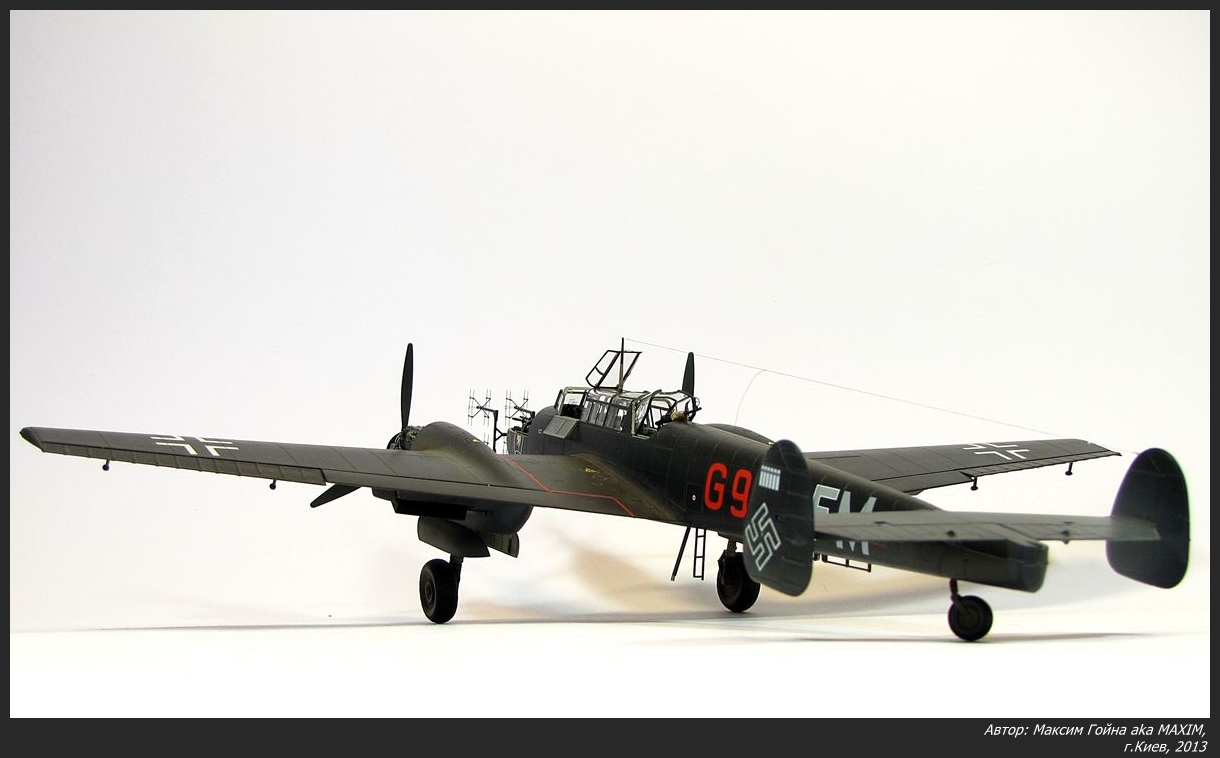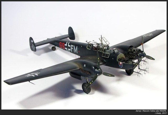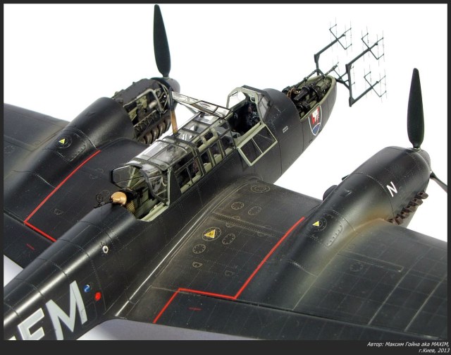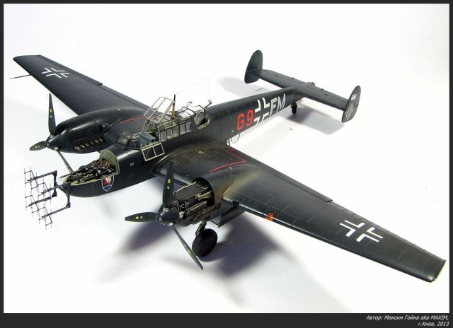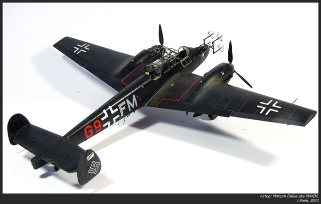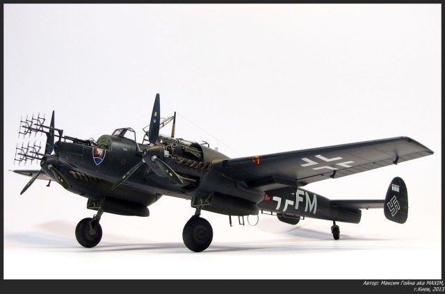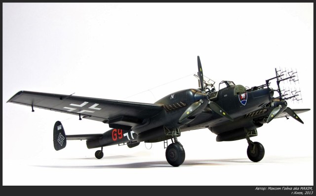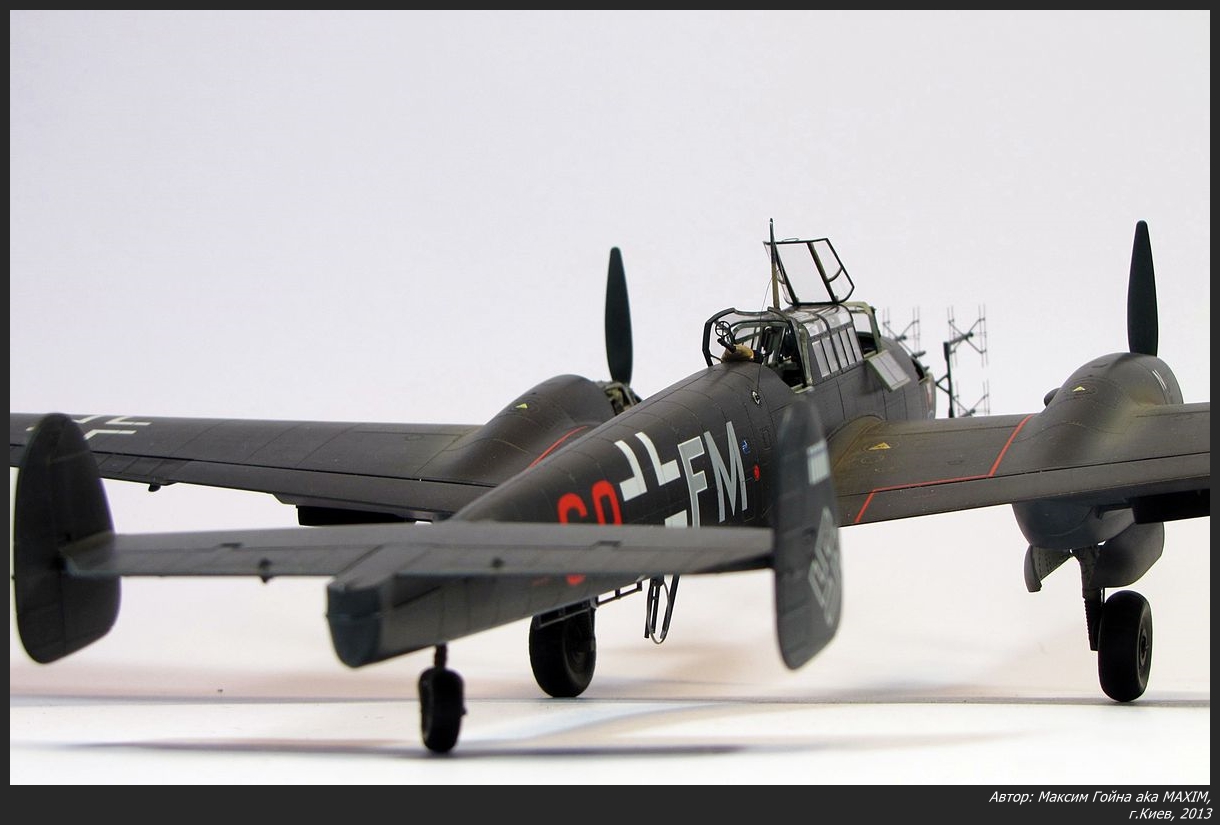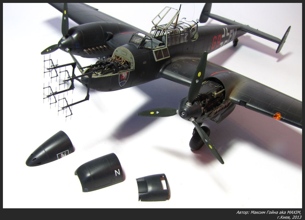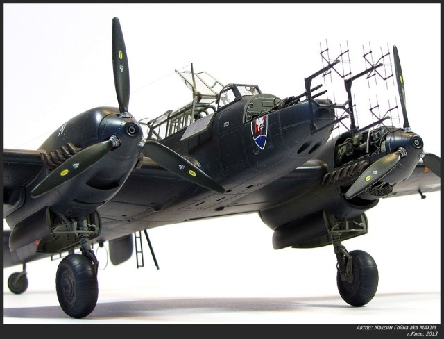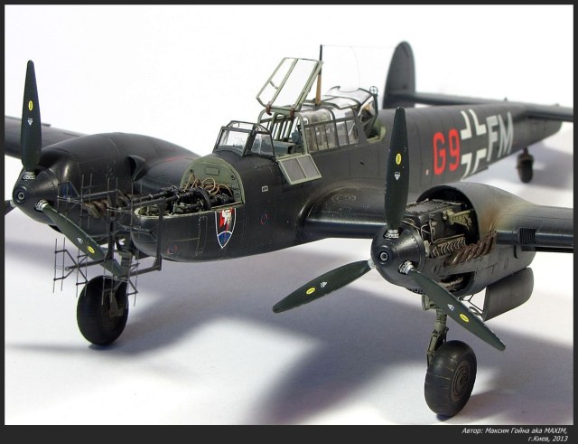 Двигатель, стойки шасси и оружейную нишу дополнил проводкой ориентируясь на имеющиеся фото и чертежи. Кабина окрашена комбинировано и RLM02,и RLM66. Имитировал клеп. Радар FuG202 собирал с помощью пайки и супер-клея. Красил модель черной краской, предварительно размешанной с серым и синим цветом. Далее постшейдинг черным цветом, полировка наждаком 2000 для "поднятия" клепа, глянцевый лак, декали и снова глянцевый лак. Далее матовый лак, "масляные точки" и финишный матовый.