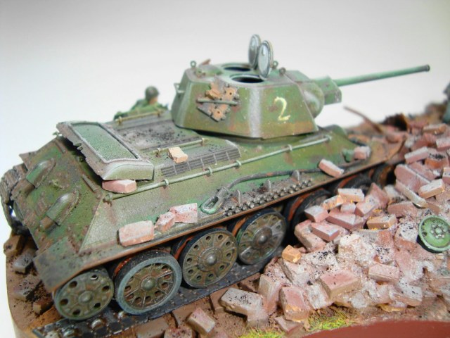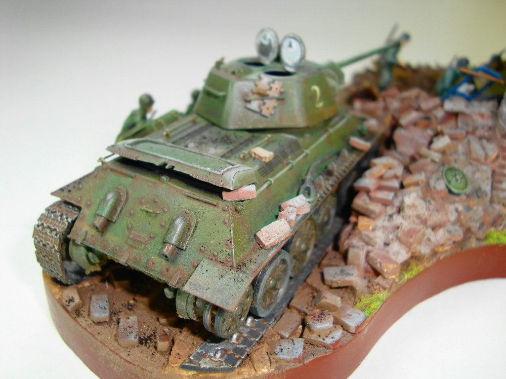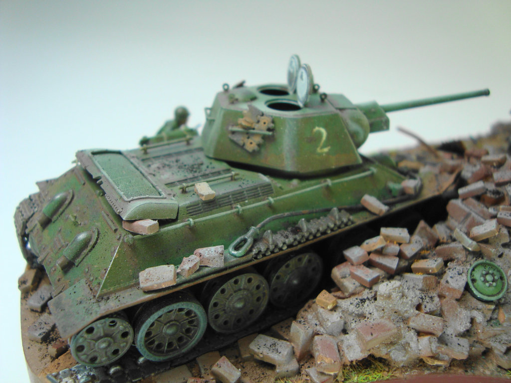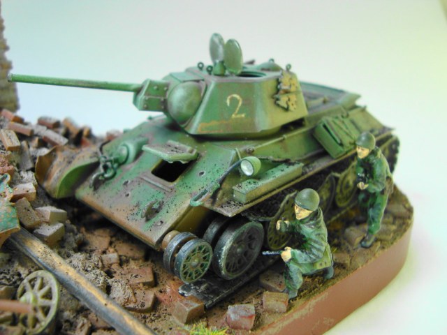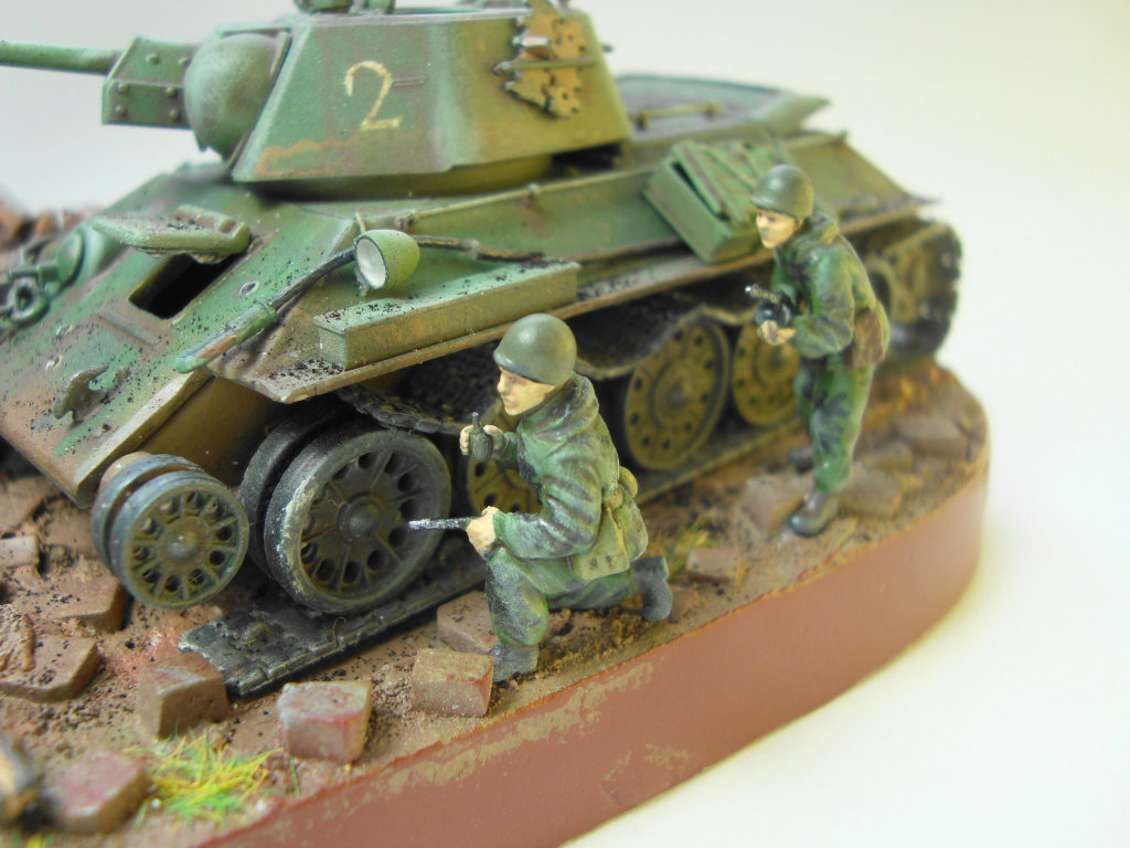 К примеру...уберите наших....откройте крышку движка 34ки, копоть и т.д....и получится хорошая городская засада....а за танком посадите снайпера или наблюдателя....немцы так делали часто...фото такие есть...