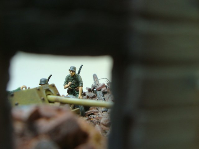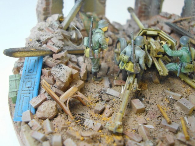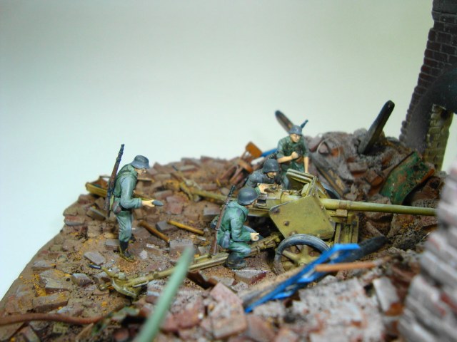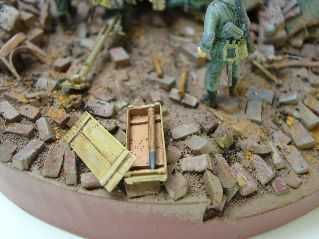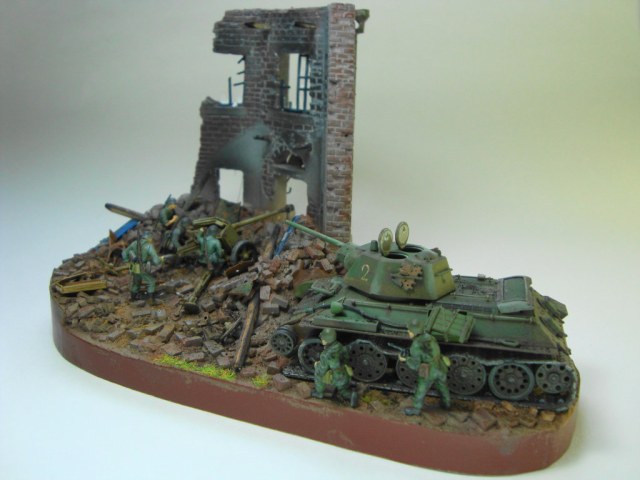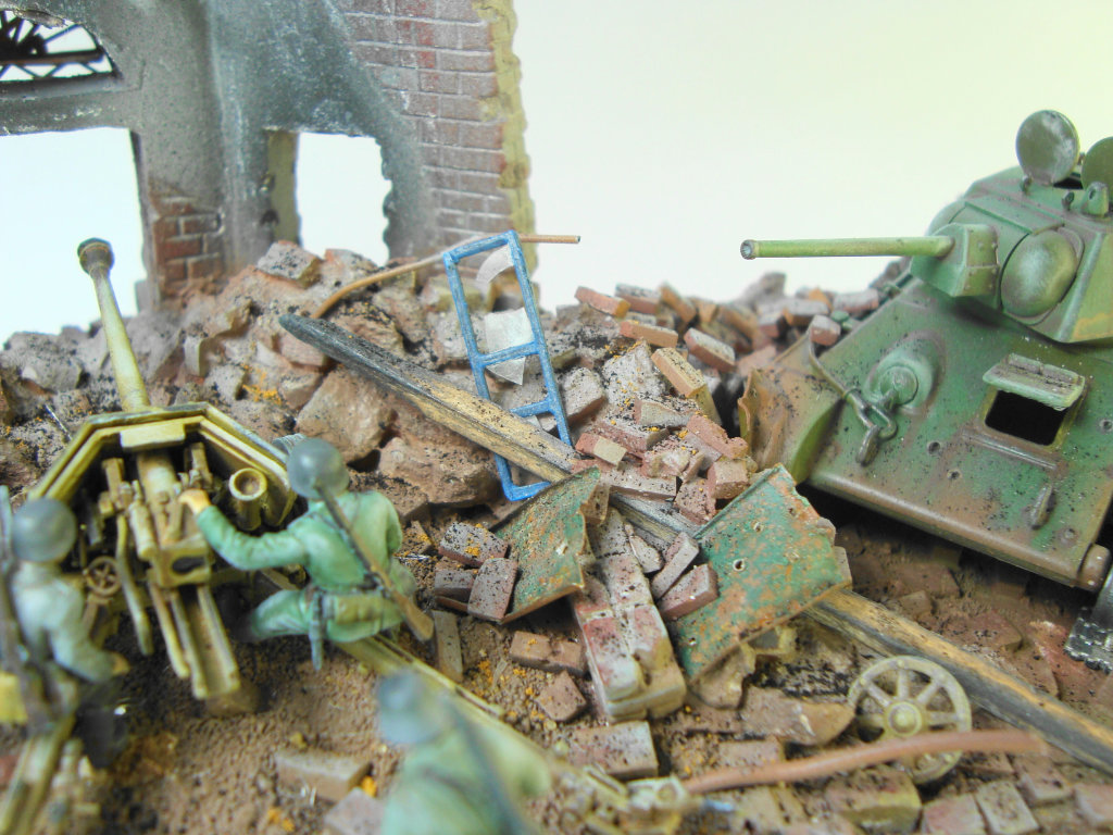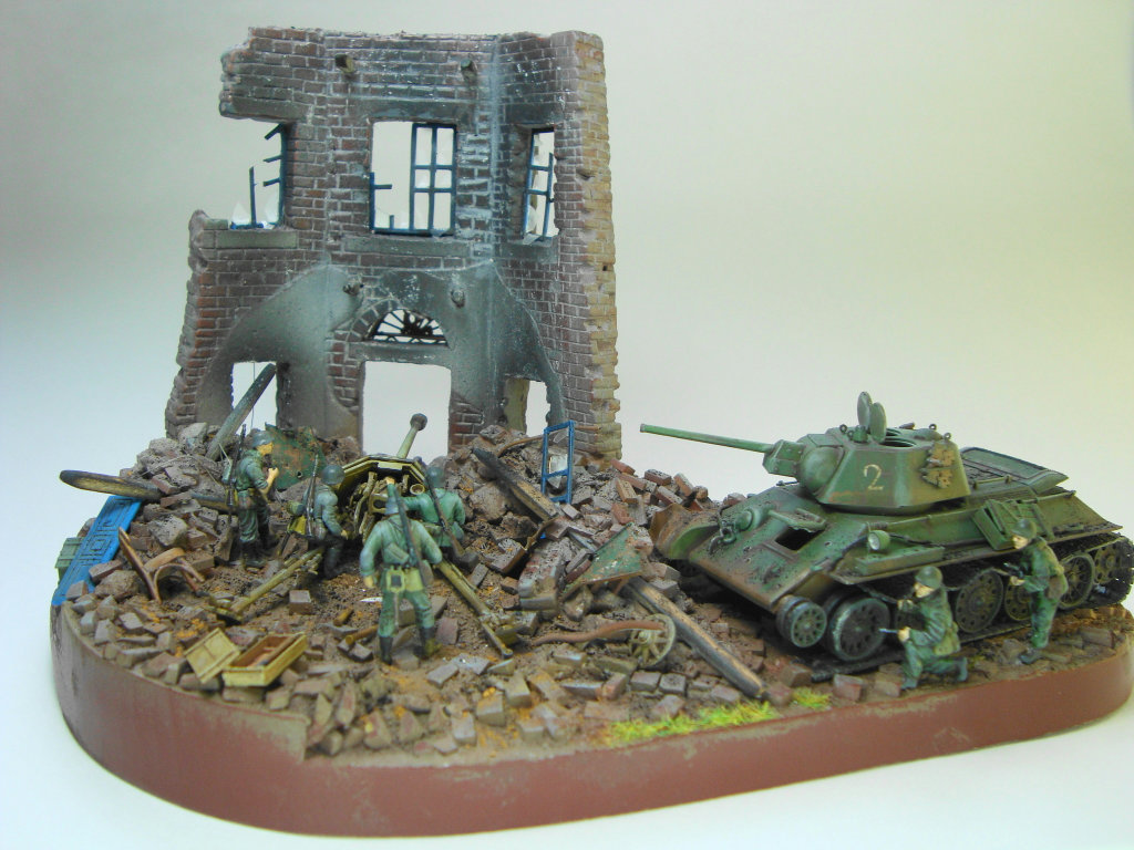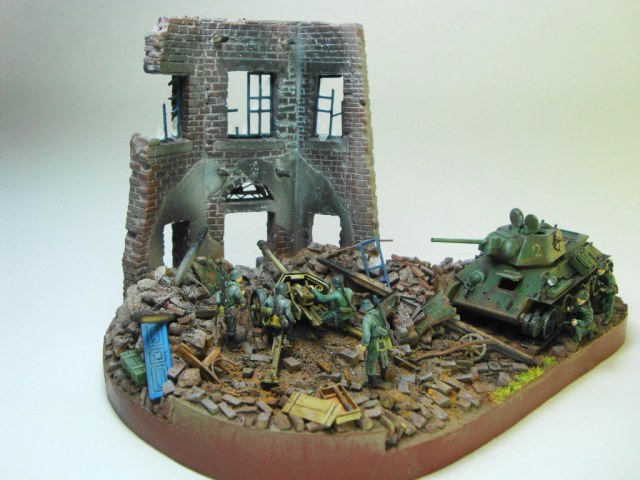 В работе использовался набор: 7,5см Pak 40 w/Gun Crew от "Dragon", Т-34/76 и "Советские разведчики" от "Звезды" с небольшими доработками. Наводчик и замковый - конверсия "Звездовского" мотоциклиста, разведчикам надел каски и дал гранату. У т-34/76 открыл люки и поставил решетку над трансмиссией от "Dragonовской" тридцатьчетверки. Использована разная мелочь от других производителей. Руины из акриловой универсальной шпатлевки. Применял пивжесть, например снарядный ящик к Pak-40 полностью из нее. Красил красками "Тамия" и "звезда", смывка "MIG", пудренница "Tamiya"