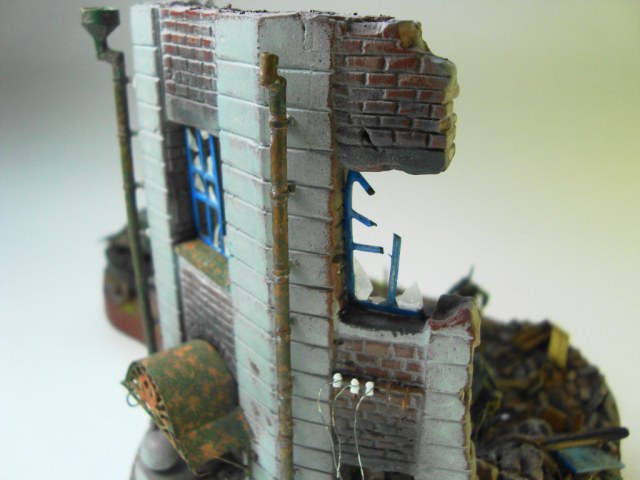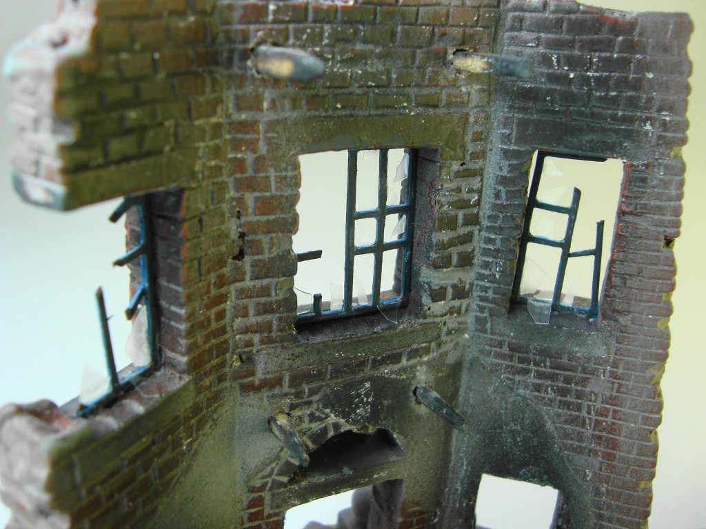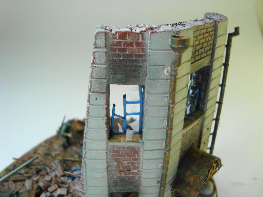 В принципе ничего сложного, на пластмассовой подложке (например крышка от Доширака) сделал из картонна опалубку в виде фрагмента стены с проемами окон и залил ее акриловой шпатлевкой, (она продается в хоз магазинах), тонкими слоями каждый из которых просыхал сутки. После затвердевания этой заготовки, отшлифовал ее на наждачной бумаге, именно на...,бумага лежит на ровной поверхности. А затем скальпелем и надфилем вырезал на этой заготовке нужный рельеф. Стена склеена клеем ПВА из трех частей, делал я ее года полтора назад. Диорама переделывалась несколько раз, так, что это последний вариант. К сожалению я не делал фото в процессе работы есть только фото кирпичей из той же шпатлевки. По поводу кирпича под решеткой МТО, я и не думал о перегреве двигателя, просто очень хотелось, чтоб она была открыта, вот я и придумал историю, как будто танкисты хотели открыть крышку после повреждения машины, рядом был взрыв, прилетел кирпич они бросили крышку и ретировались, вообще на, этот счет можно придумать, что угодно фантазия не исчерпаема.