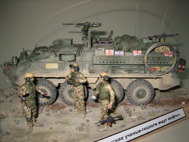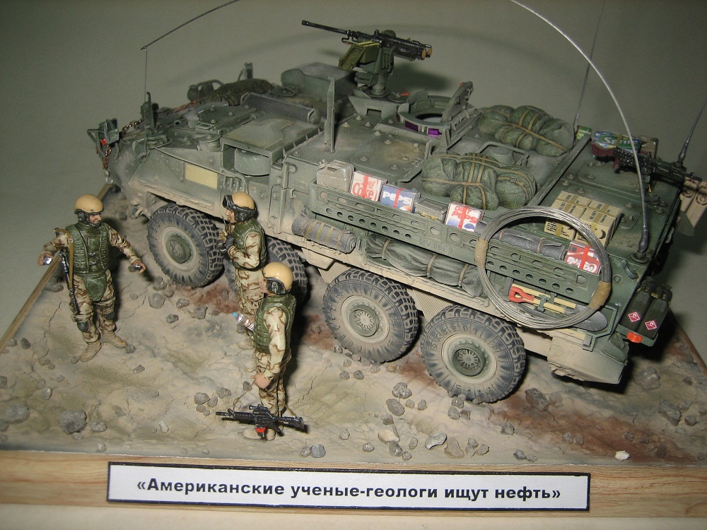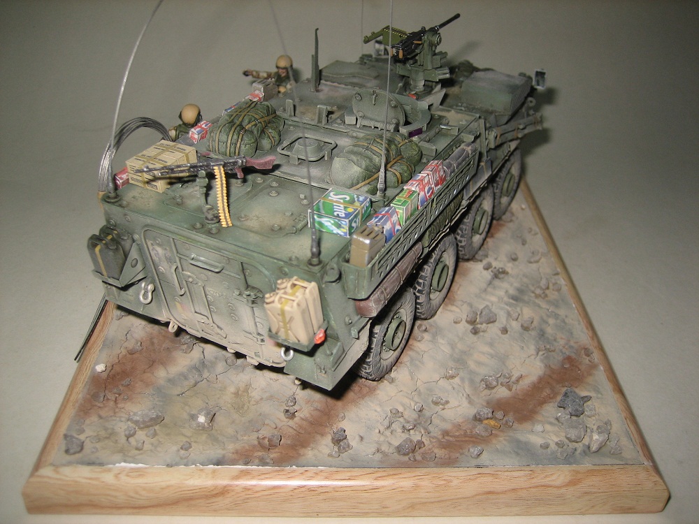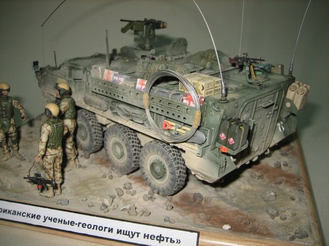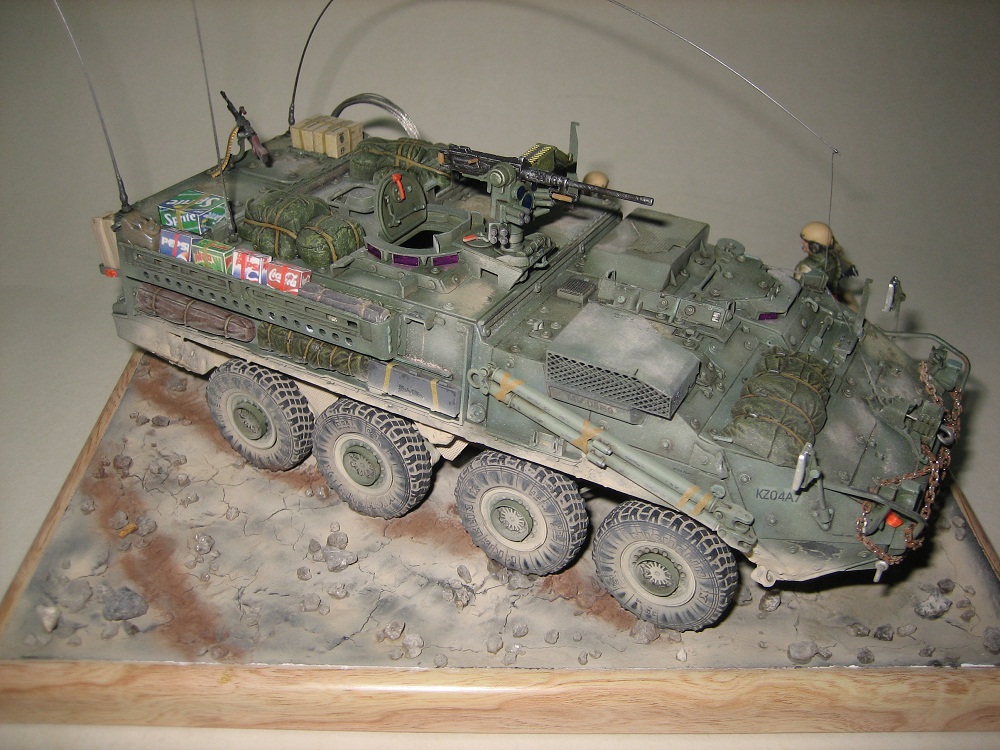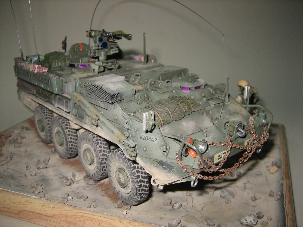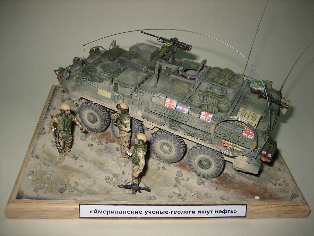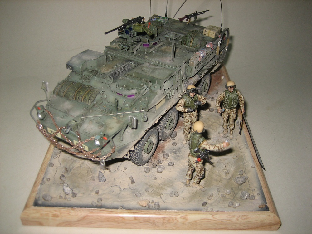 Привет всем Коропчанам ! Долго не выкладывал , т.к. появилось много заказов :) , себе времени не осталось. Вот по малеху доделал своего Страйкера. Название с юмором взял из инета ;). Модель у Трубача понравилась, все на пятерочку :), доделал троса , кое-что из обвеса, зеркала, повесил цепь, антены из литника, экипажу дал воду и автоматы ;), ленты к пулеметам, ну и так по мелочам. Подставка-фоторамка, основание шпаклевка и мелкие камешки. Пылил пастелью, красил Тамией. Кажется получилось как хотелось, удручают только декали, делал как полагается, слой глянца, деку а потом еще глянец, смывка с еще глянец, было всё гуд, потом покрыл матом и вылезла подложка :(((. Всем приятного просмотра ;)