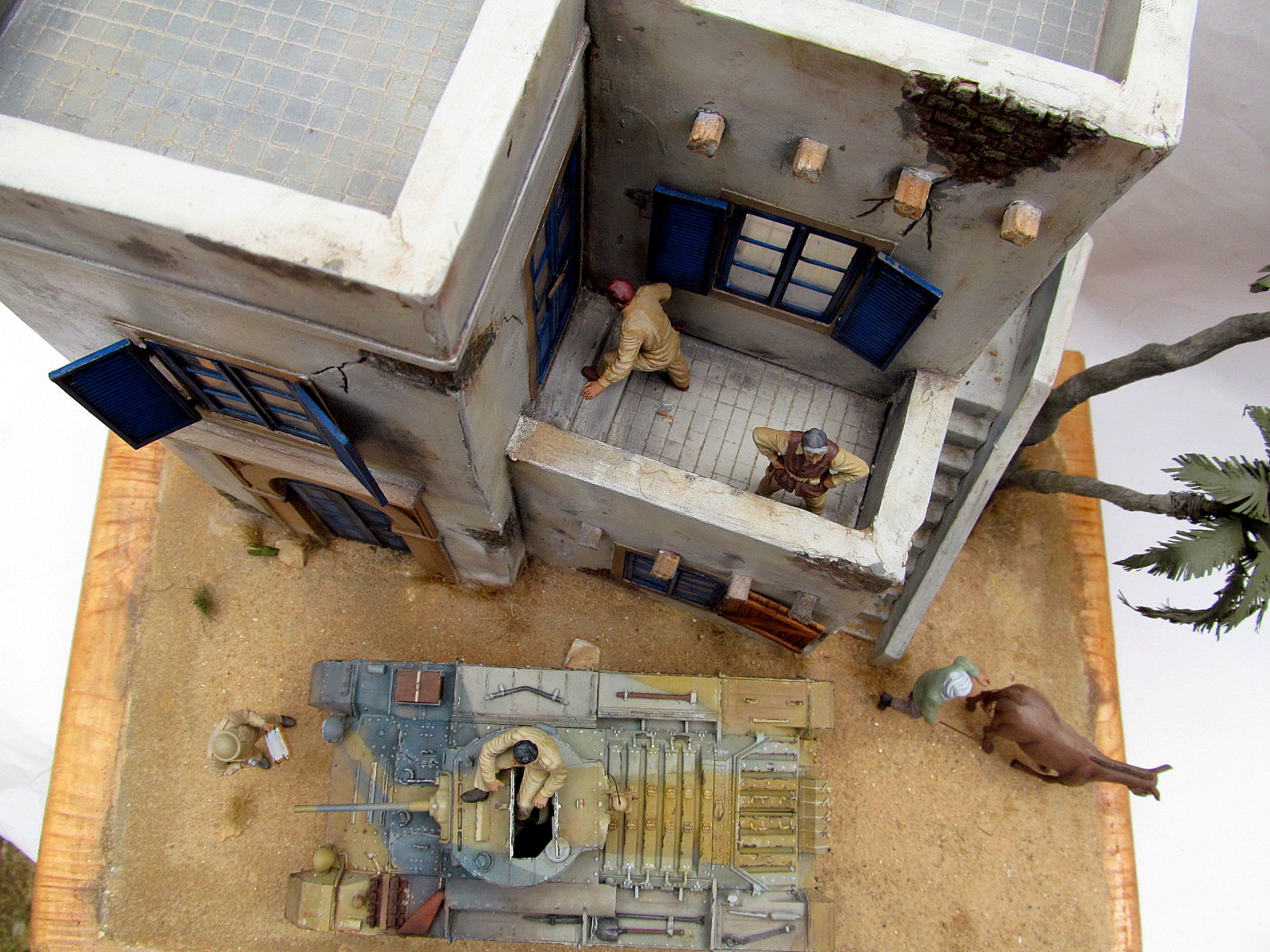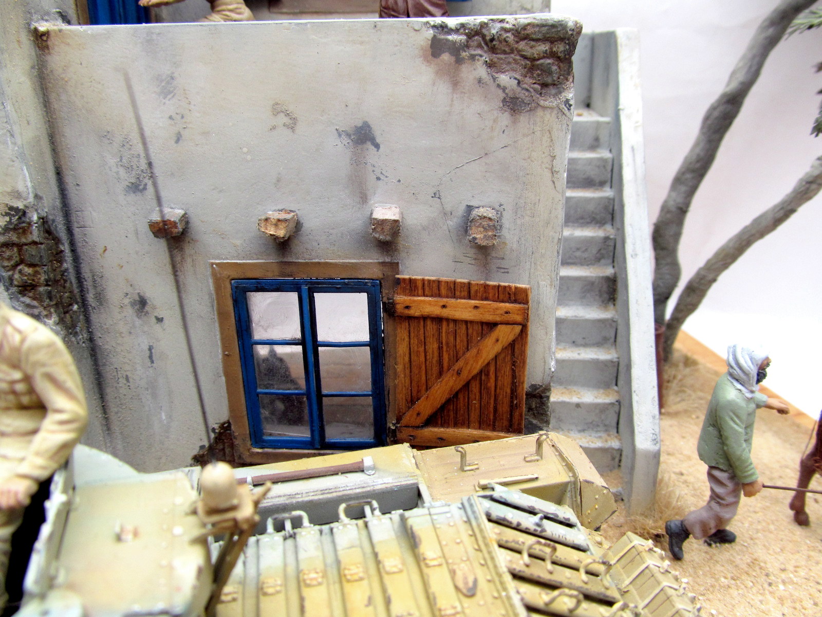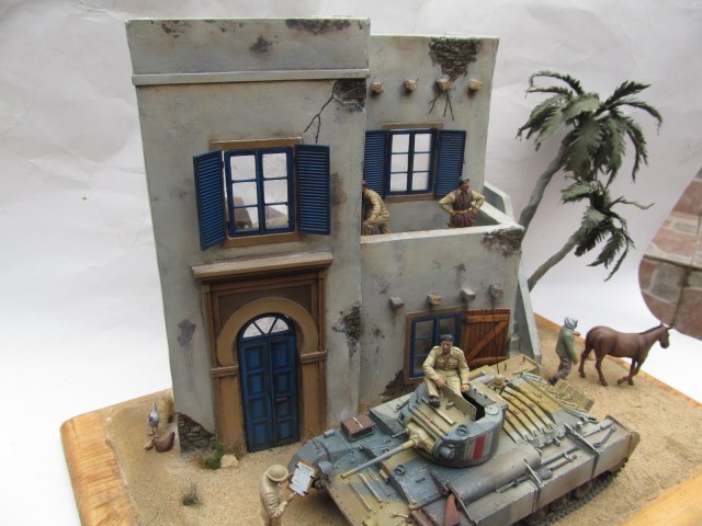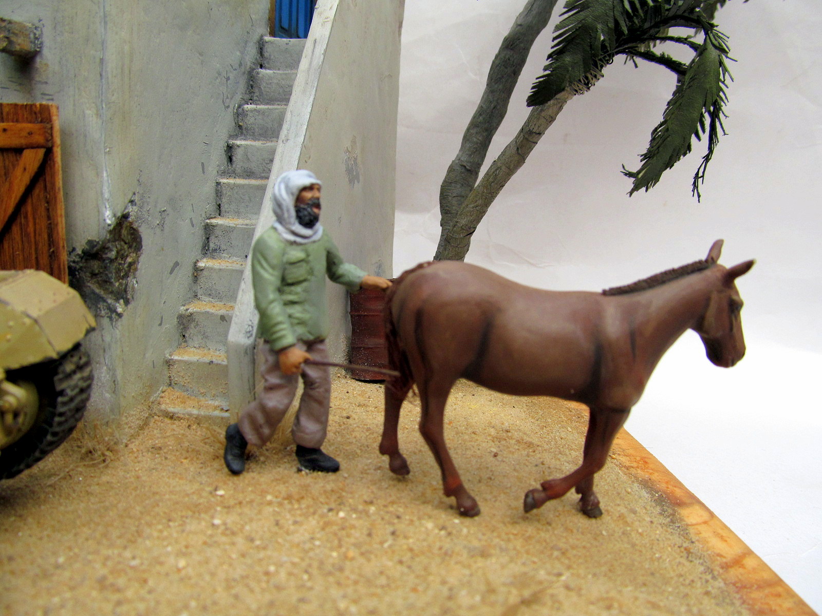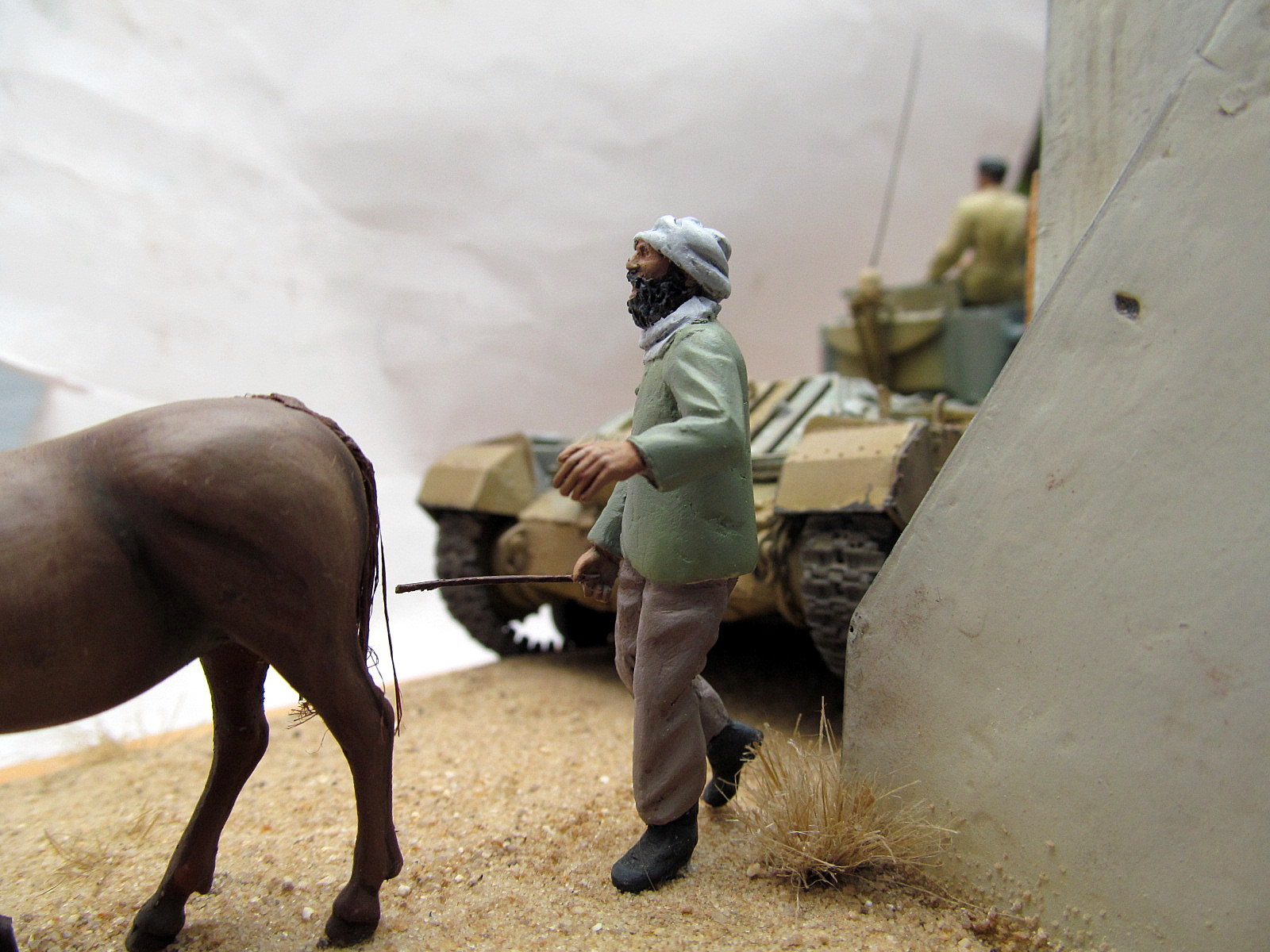 Пластилин на ногах петуха? чтот новенькое, никакого пластилина там нету, может камешек плоский какой, что именно по окраске не понравилось? можно конкретики? Сюжет таков: Британци возле своей позиции,(называйте дом как хотите штаб, казарма) Усатый командир на балконе стоит и осматривает позицию, солдат идущий к двери получил какой-то приказ от командира и идёт выполнять его. Танкист на Валентайне вылазит из танка, (возможно только приехал), ну и последний из Британцев, смотрит в компас, и что то записывает на планшет. Ну, а назовём его, Дядька Бедуин гонит своего ОСЛИКА не лошадь, а ослик,(я думаю вы в интернете сможете найти чем отличается осел от лошади) За цель в этой диораме я поставил показать элементы мирной жизни в военные будни, каждый занимается чем своими делами. Так как война это не только бои, а и затишье перед боем.
