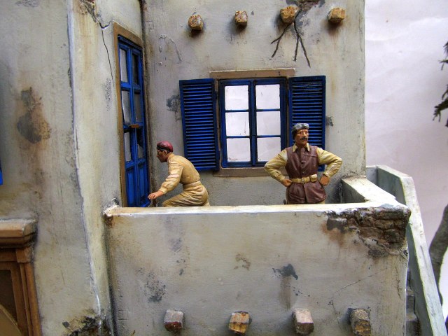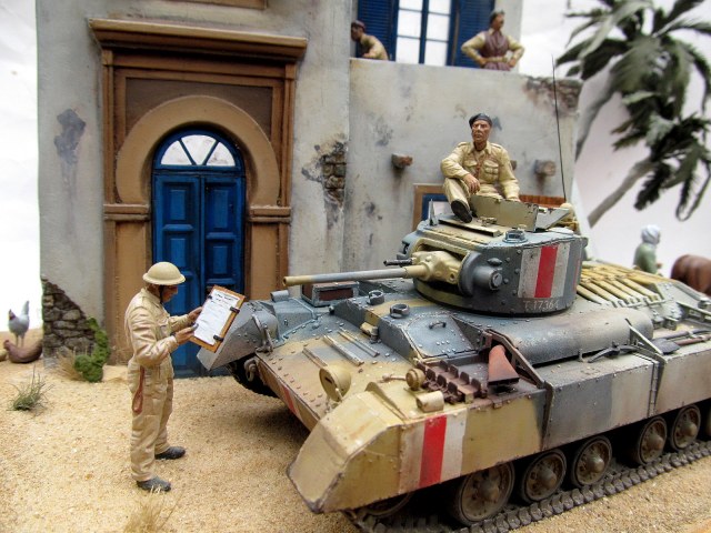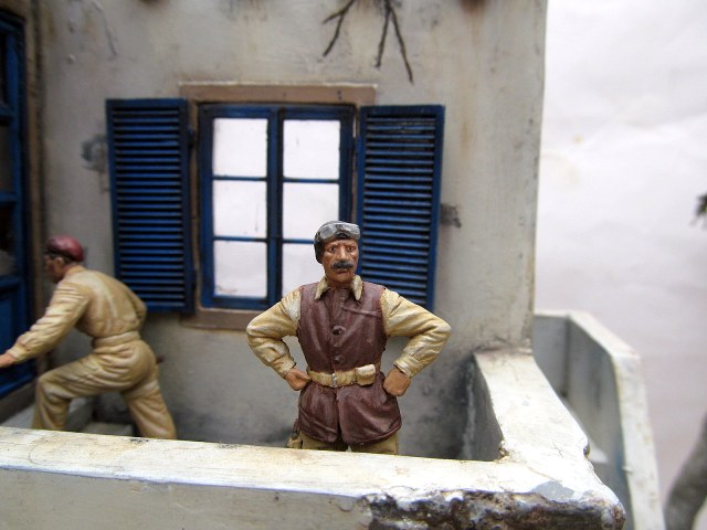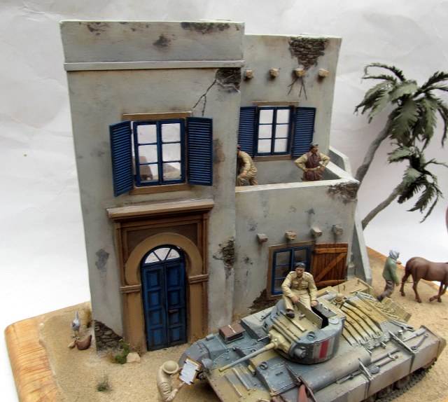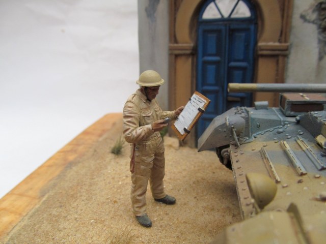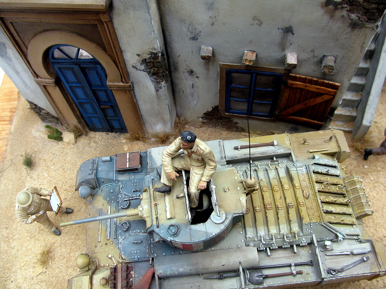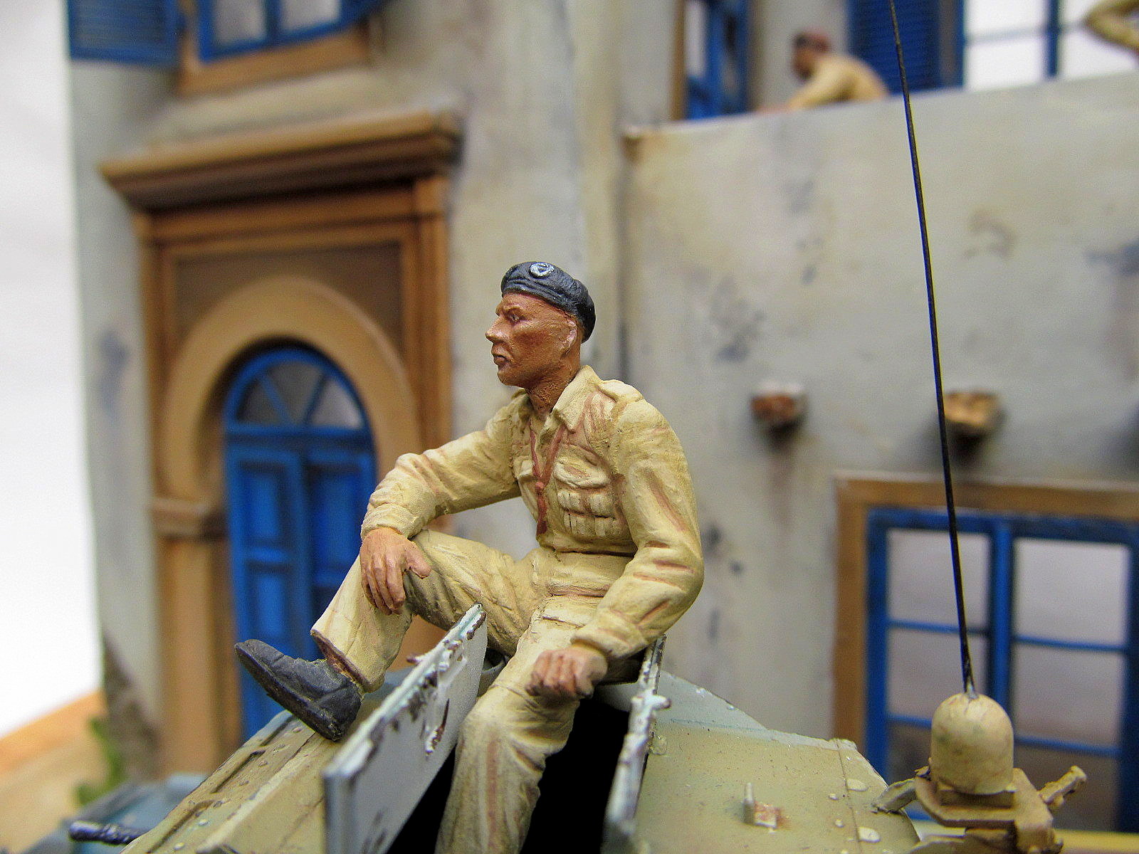 Пластилин на ногах петуха? чтот новенькое, никакого пластилина там нету, может камешек плоский какой, что именно по окраске не понравилось? можно конкретики? Сюжет таков: Британци возле своей позиции,(называйте дом как хотите штаб, казарма) Усатый командир на балконе стоит и осматривает позицию, солдат идущий к двери получил какой-то приказ от командира и идёт выполнять его. Танкист на Валентайне вылазит из танка, (возможно только приехал), ну и последний из Британцев, смотрит в компас, и что то записывает на планшет. Ну, а назовём его, Дядька Бедуин гонит своего ОСЛИКА не лошадь, а ослик,(я думаю вы в интернете сможете найти чем отличается осел от лошади) За цель в этой диораме я поставил показать элементы мирной жизни в военные будни, каждый занимается чем своими делами. Так как война это не только бои, а и затишье перед боем.