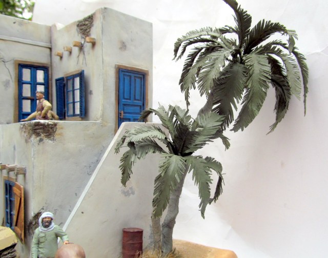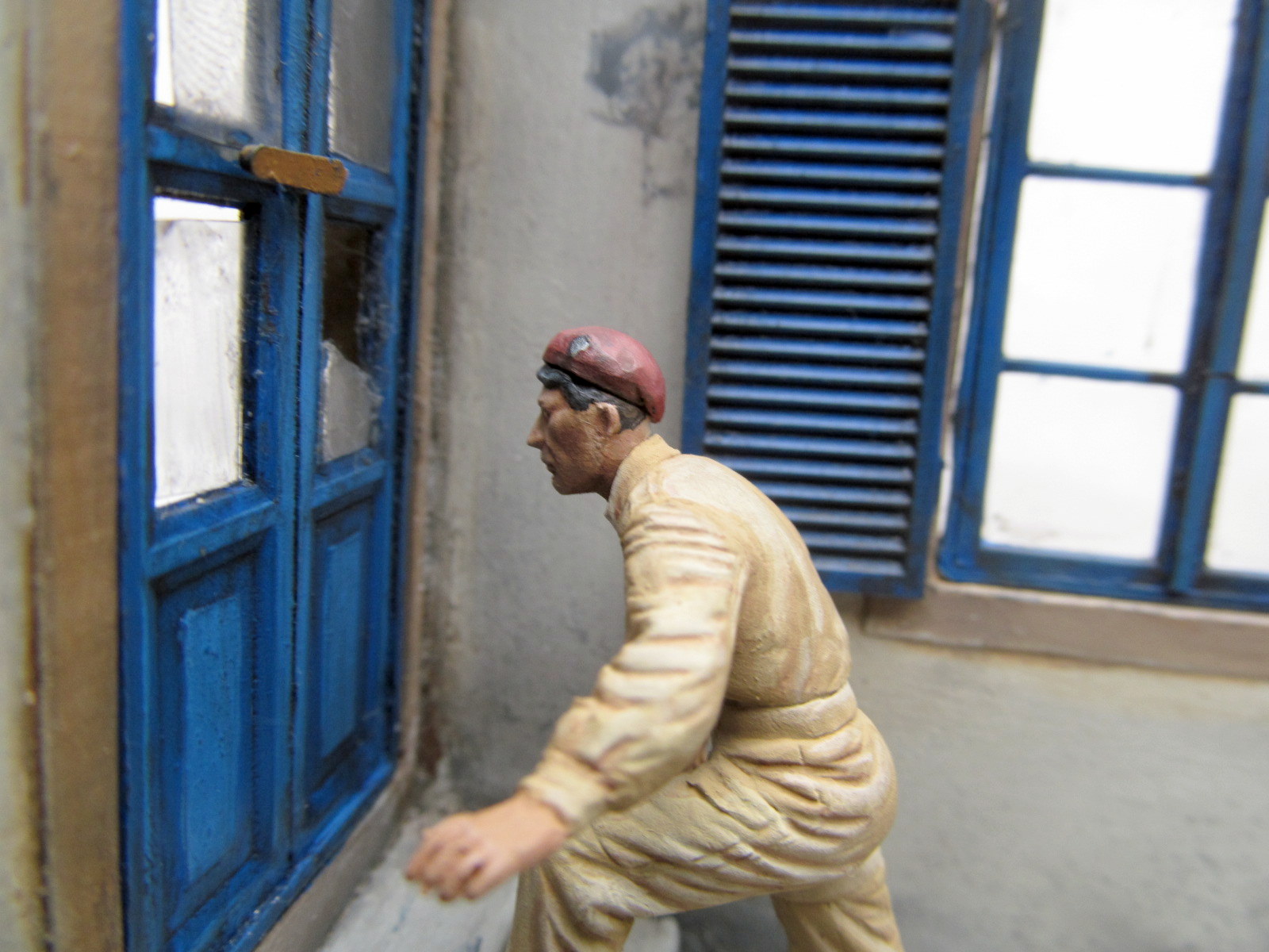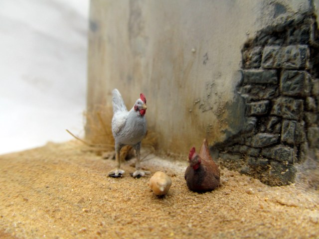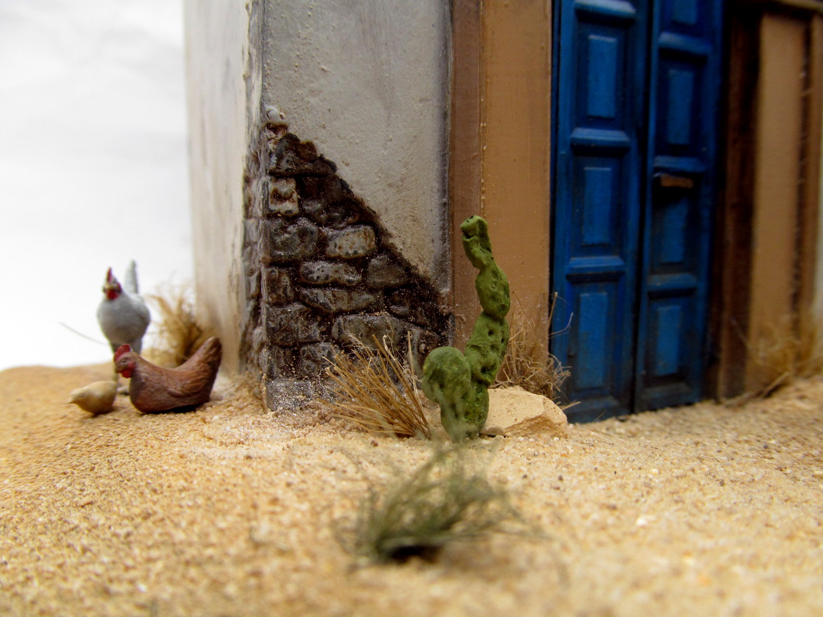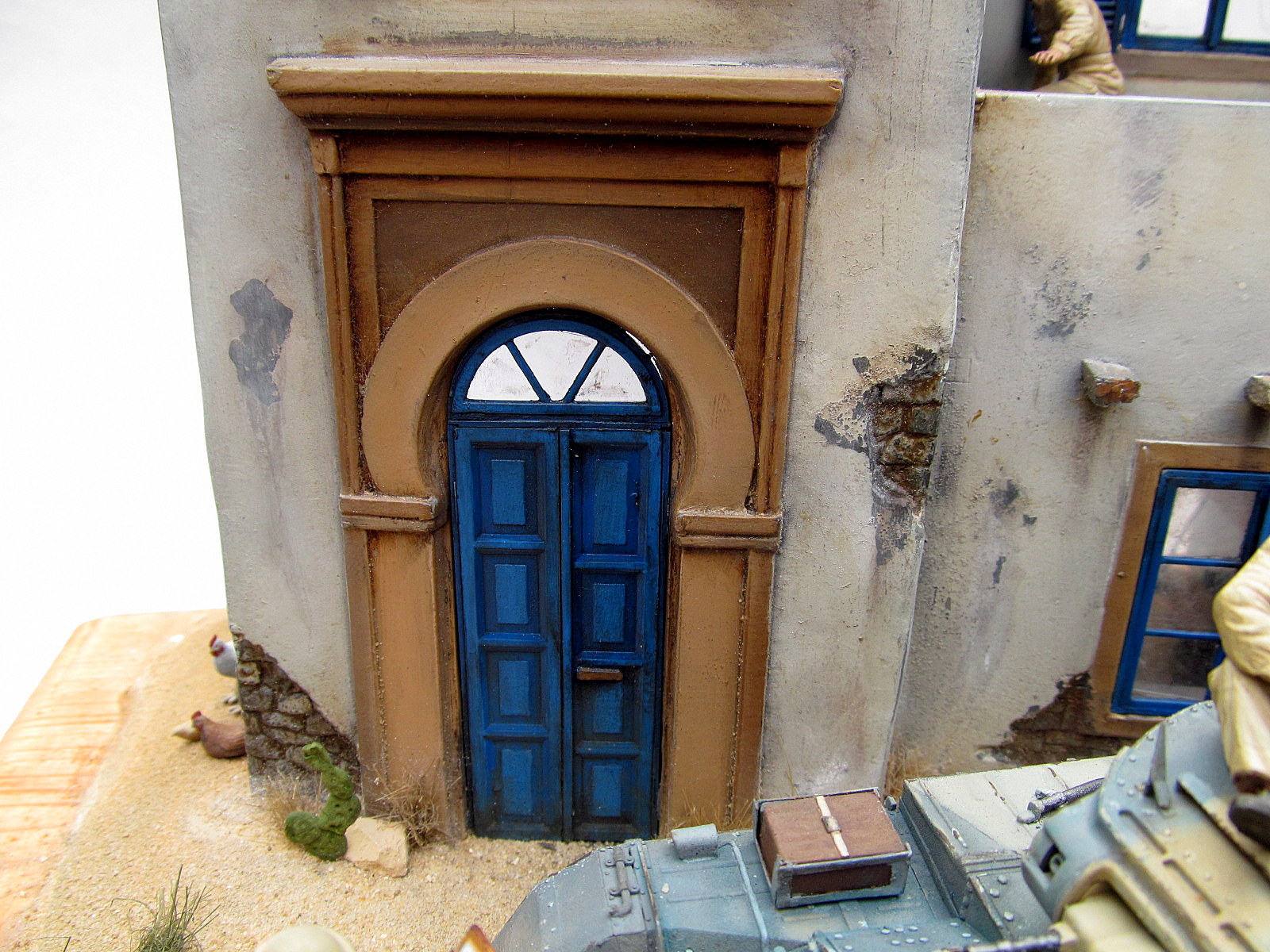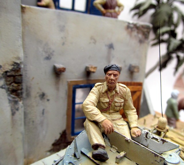 Пластилин на ногах петуха? чтот новенькое, никакого пластилина там нету, может камешек плоский какой, что именно по окраске не понравилось? можно конкретики? Сюжет таков: Британци возле своей позиции,(называйте дом как хотите штаб, казарма) Усатый командир на балконе стоит и осматривает позицию, солдат идущий к двери получил какой-то приказ от командира и идёт выполнять его. Танкист на Валентайне вылазит из танка, (возможно только приехал), ну и последний из Британцев, смотрит в компас, и что то записывает на планшет. Ну, а назовём его, Дядька Бедуин гонит своего ОСЛИКА не лошадь, а ослик,(я думаю вы в интернете сможете найти чем отличается осел от лошади) За цель в этой диораме я поставил показать элементы мирной жизни в военные будни, каждый занимается чем своими делами. Так как война это не только бои, а и затишье перед боем.