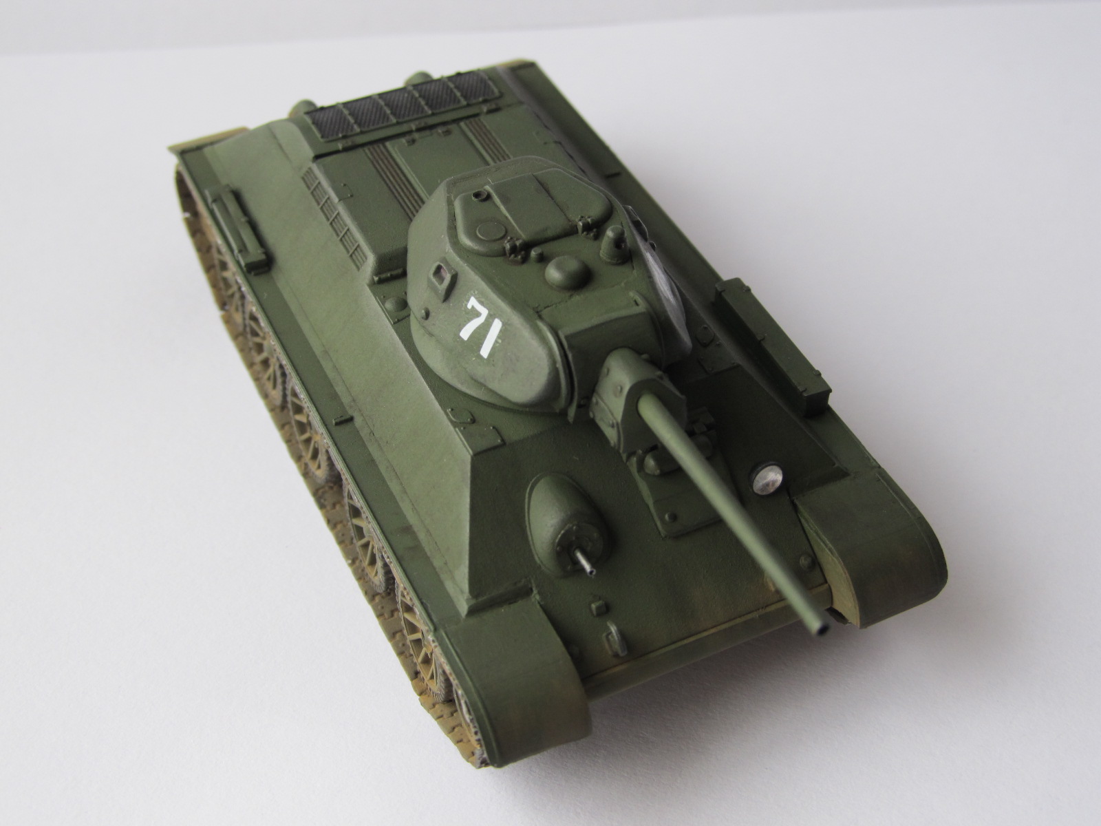 ...Короче,молодой человек.Судя по фото,если сменить катки на катки от Т-34 "Звезда",то будет машина 42-ого года,не раньше,но на борта нужно добавить хотя бы крючья для крепления баков и шпор.Да,и заглушку на башенный люк тоже,будет Т-34/76 с литой башней от СТЗ. Может быть,даже катки должны были быть с внутренней амортизацией.