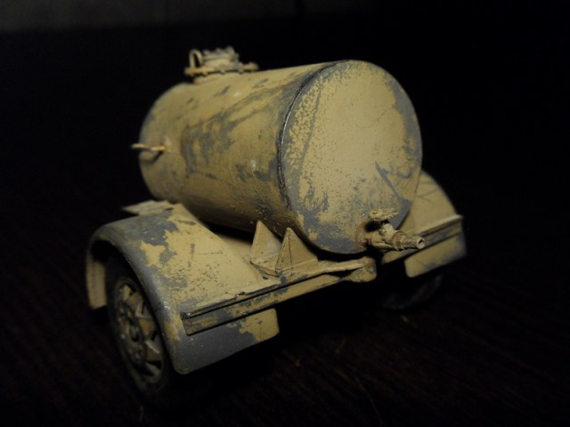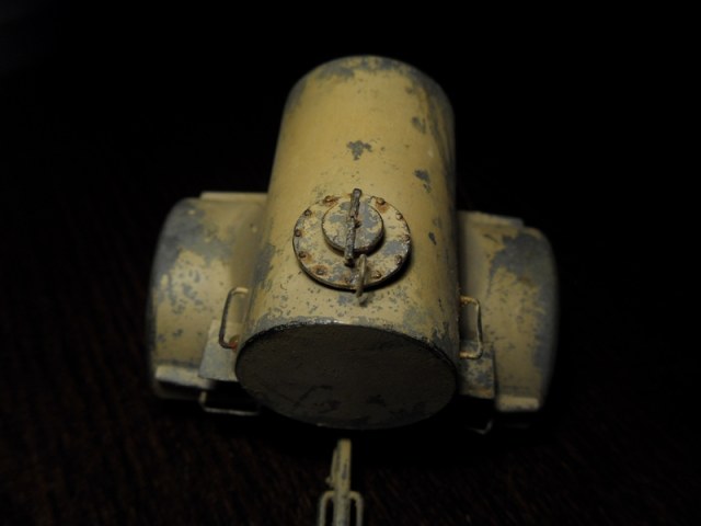 Не, ну я понимаю, Африка и всё такое, но в песок то зачем? Я тоже не смог найти никакой инфы, а по тому думаю, что в таких штуках у лисят, была большая потребность, и лепили они их скорее из того, что было... и по ворчу, если раму и колёса они перерезали из чего нить штатного, ахт-ахт например, то саму бочку слепили бы из чего нить уже ржавого, и вряд ли красили бы сначала в серое... но, как ни крути, вокруг, заливной горловины должно быть больше слеза краски и ржавчины, или дикие потёки ГСМ... А смотрится здорово...