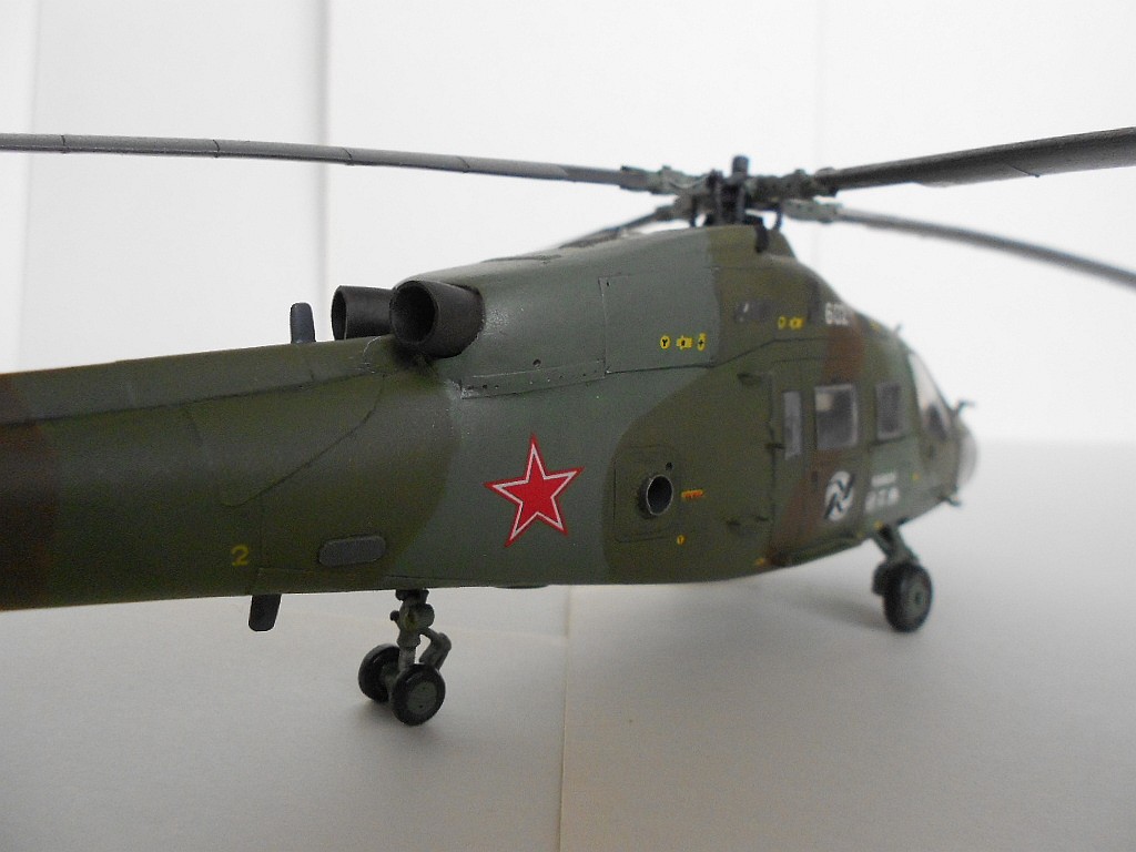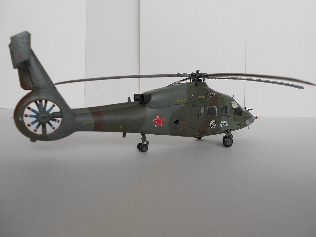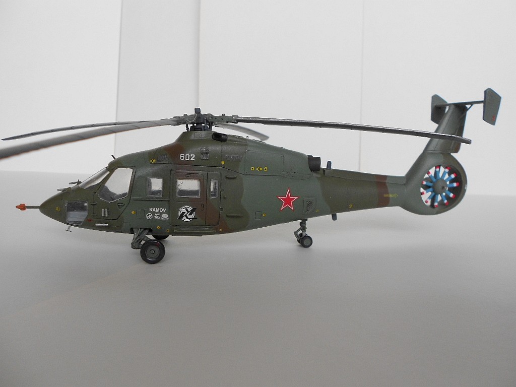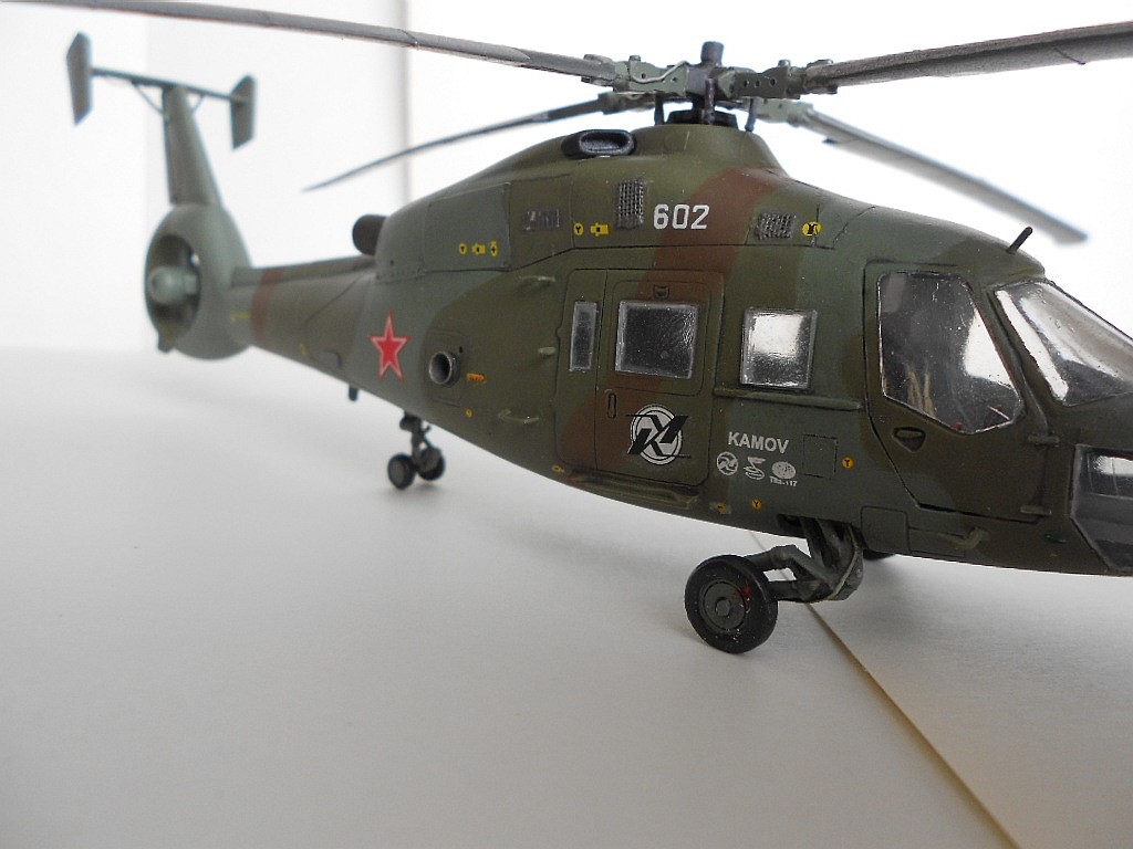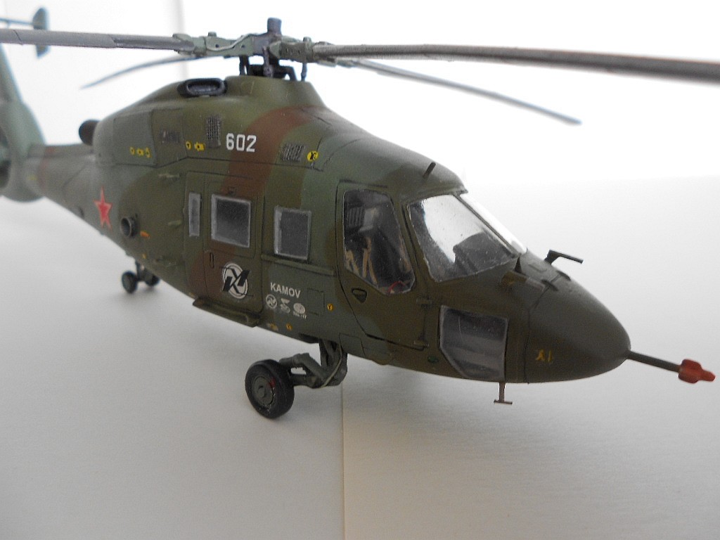 Amodel КА-62, ну все знают, что такое Amodel. Перепиливал полностью заднюю часть, где находятся двигатели. В целом почти всё родное, только смоляные кресла от КА-50. Покраска кистью, краски мешал из Звезды, акрил в тюбиках. Остекление не в дугу (вот бы Футуру), никак найти не могу. Также проводка на шасси и на НВ. Декали из закромов. Да, сеточки из старых смесителей, которые впрочем замазались все краской. Всё.