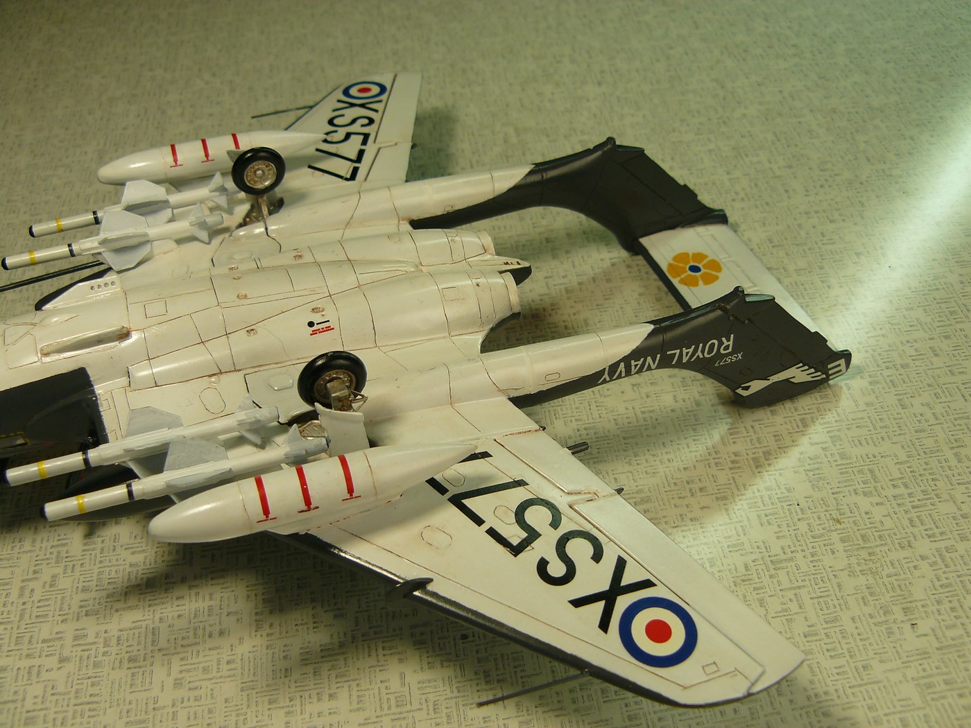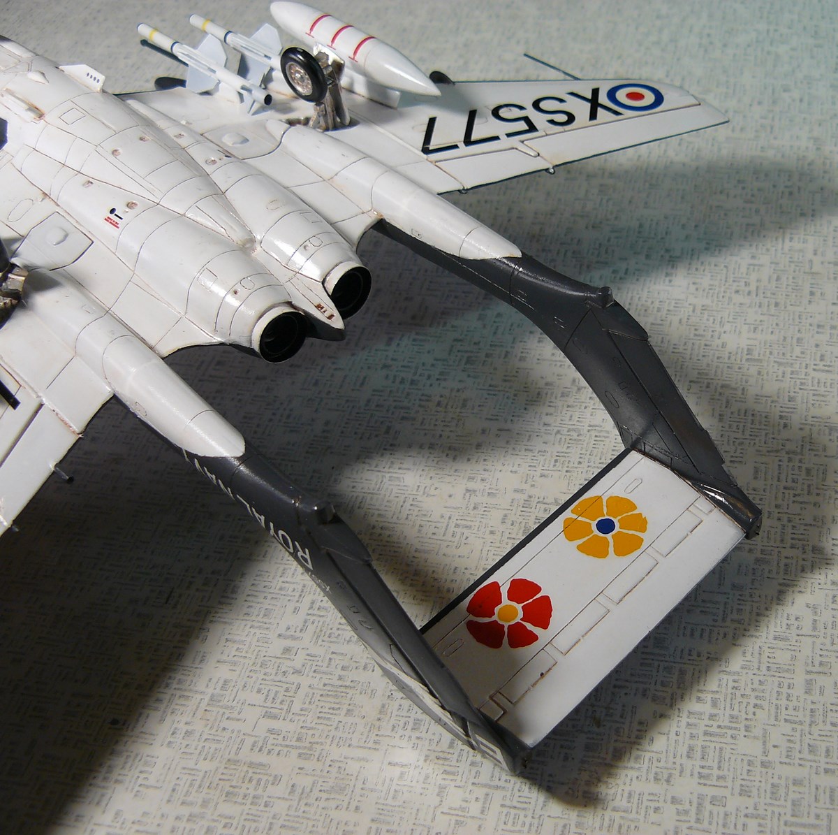 Борт - самолет из состава 899 эскадрильи с борта авианосца HMS Eagle, прибывавший там в марте 1975 года. Данный борт XS577 первый свой полет совершил в ноябре 64-го сразу как FAW2, после вывода из основного состава войск,был переделан в модификацию D3 и летал до середины 80-х., передан на хранение в 93-ем, пущен на слом в 96-ом, носовая часть сохранилась.