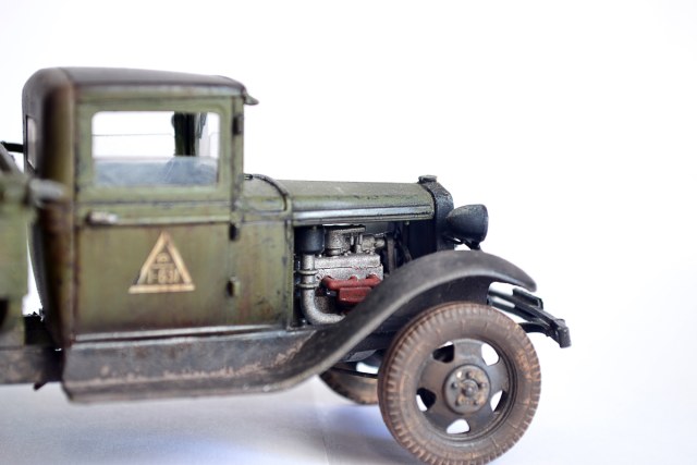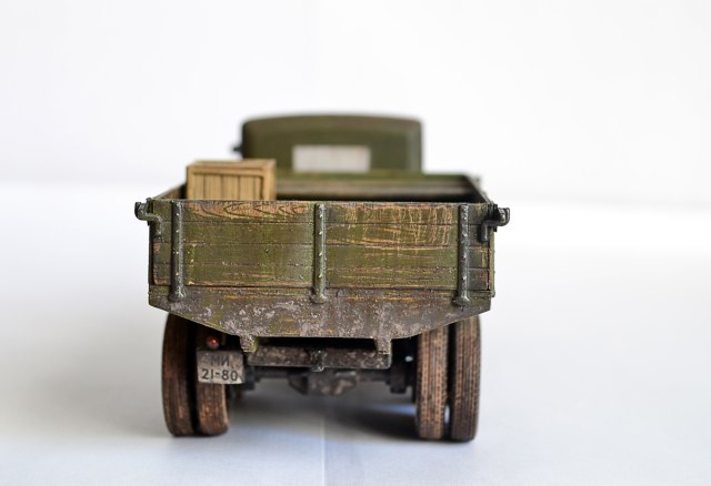 А что касается кузова, здесь все просто. технология с лаком для волос, потом механическим способом царапал базовый слой, чтобы из под него показался древесный цвет. Царапал шилом и наждачкой с крупным зерном Р80. Направление царапин примерно такое, как они могли появиться на настоящем кузове при загрузке-разгрузке. Щели между досками углублял резаком для расшивки.