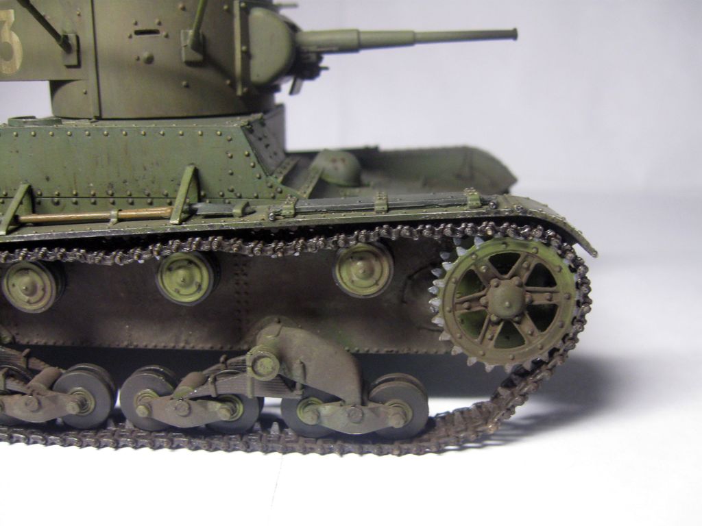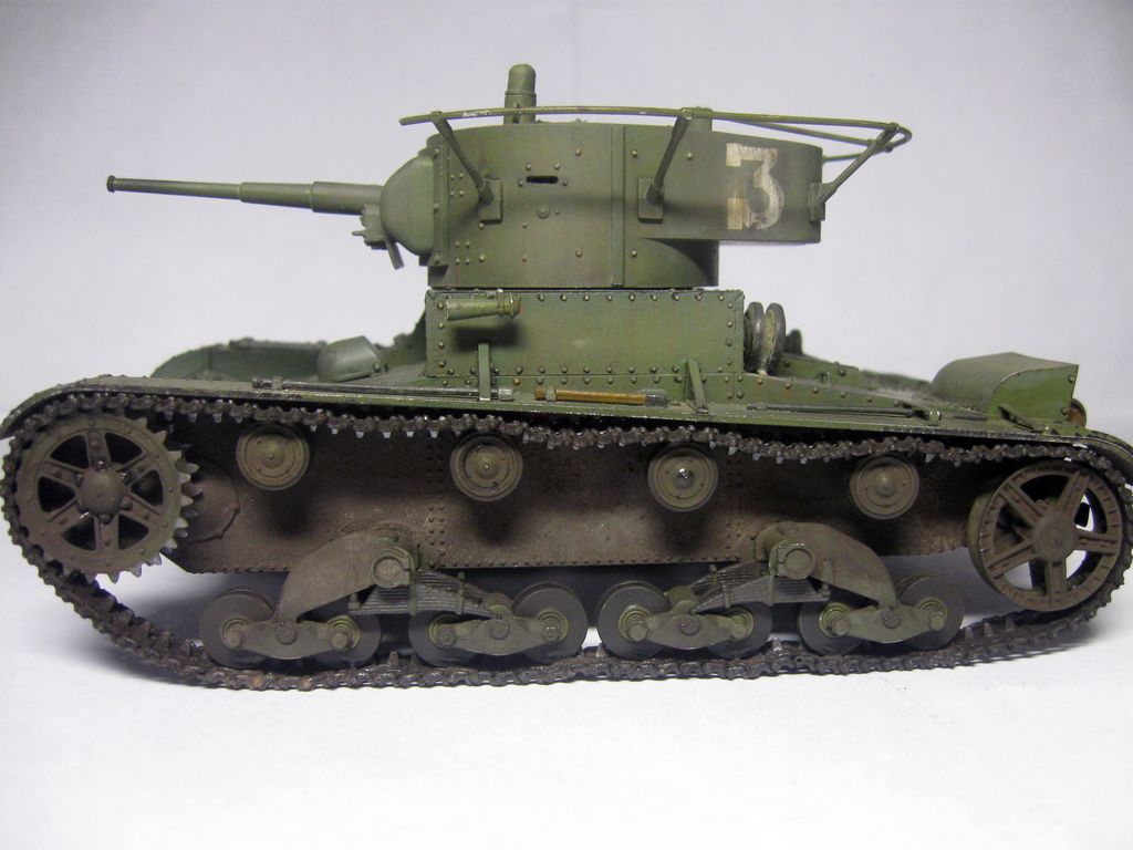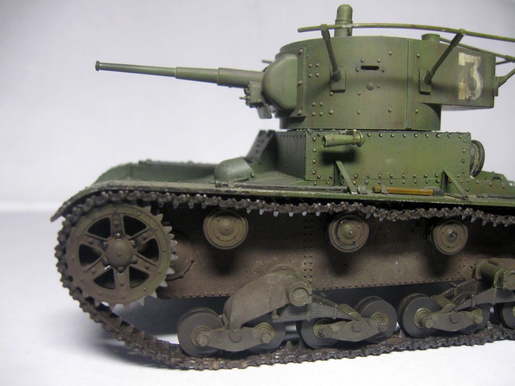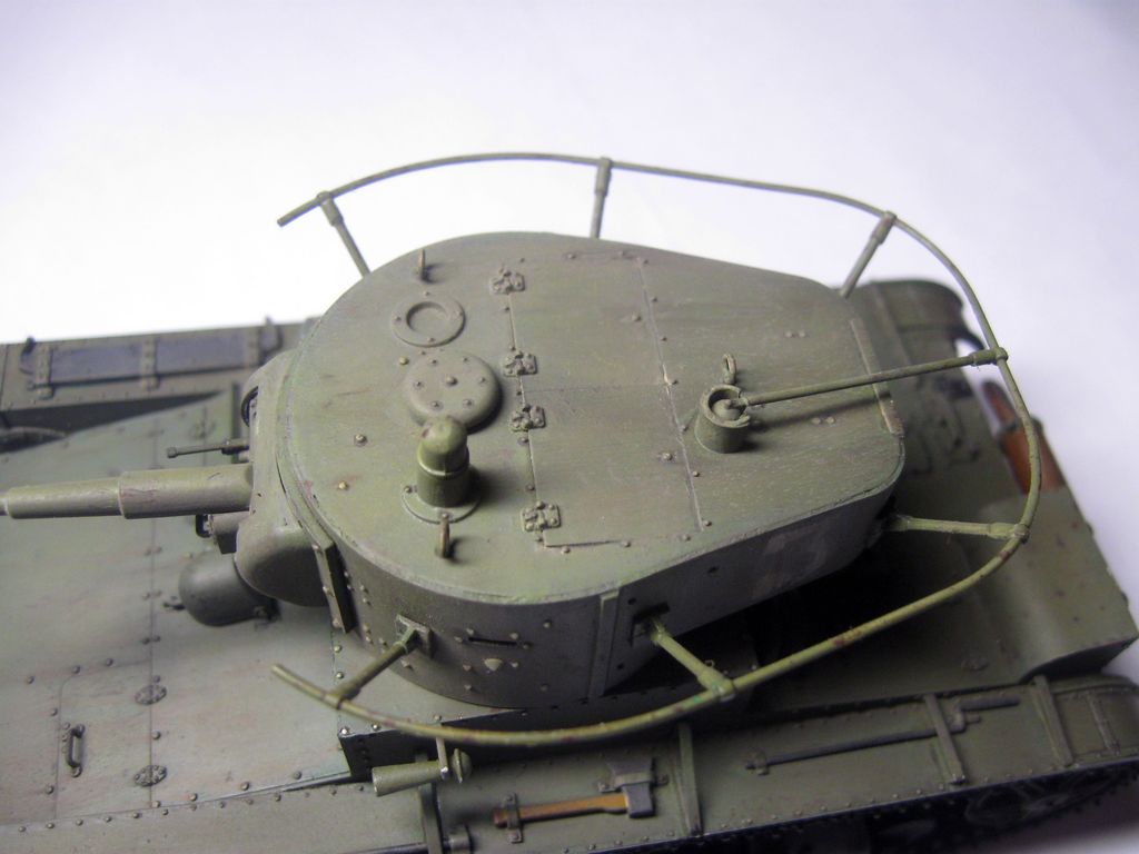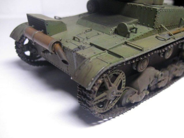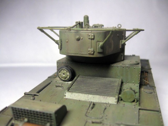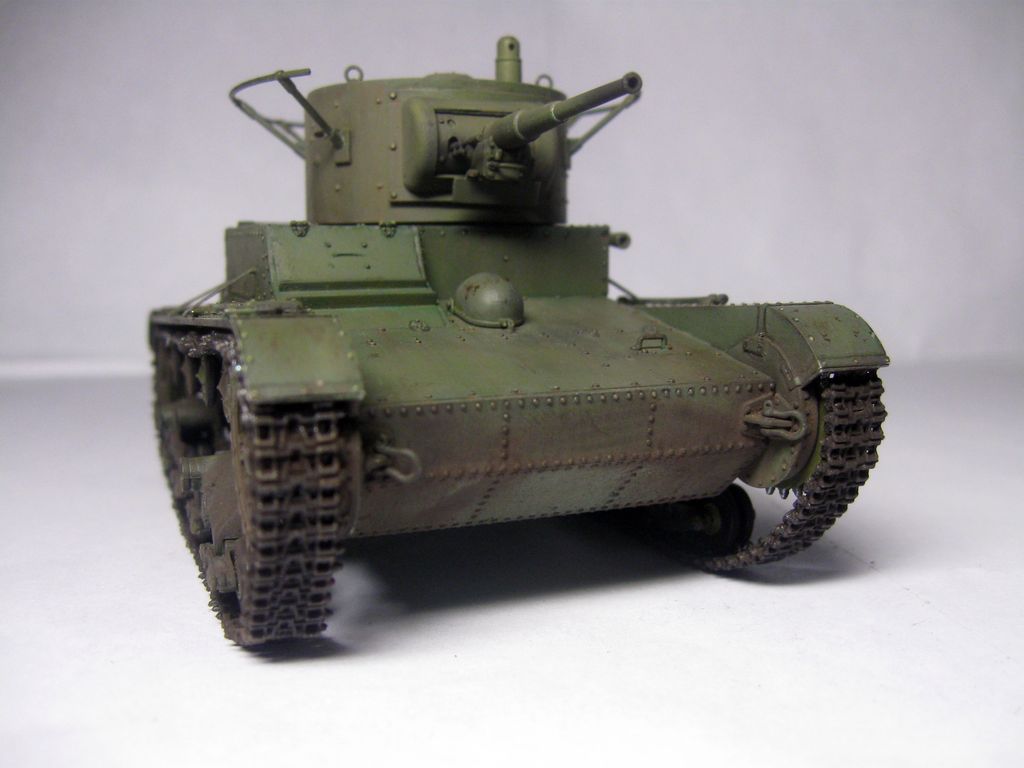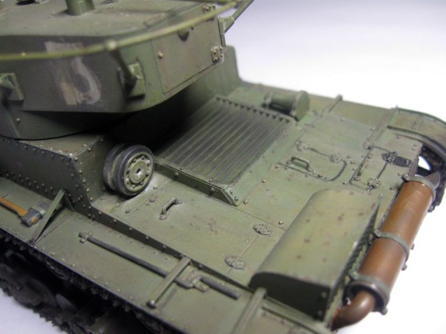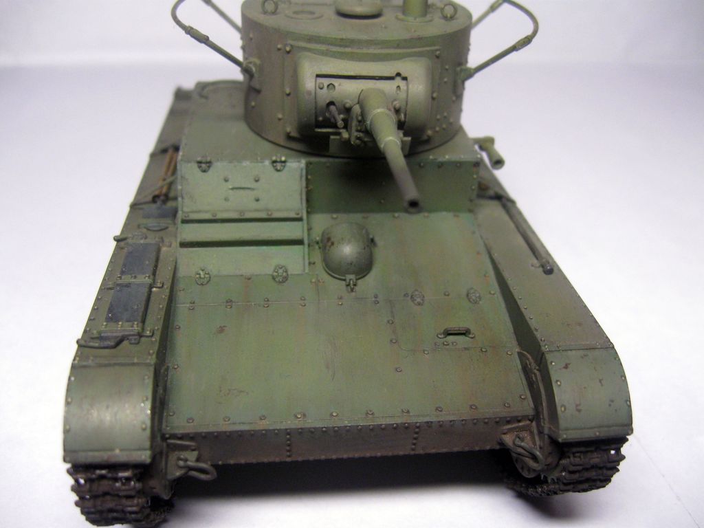 Неплохо собрано и окрашено.. Но даже в "изкоробочной" сборке несколько маленьких недоработок: гусеницы не плотно одеты на "звездочку" и виден небольшой провис у ленивцев, может стоило просто сделать на один трак по-меньше; окрас домкрата - надо было в черный потертый металл; заглушки портов для стрельбы на башне "ХоббиБосс" дал с ошибкой - должны быть плоские внутренние, надо было просто сточить конуса и просверлить отверстия под их диаметр; заглушка на кормовом люке башни стоит слишком высоко; запасной каток ничем не закреплен, а он крепился хомутом, который закреплялся болтами (один на решетке воздуховода, второй - на корпусе), самое интересное, что этот хомут дается в штатном наборе травления (№ детали не помню))). В целом, для второй модели - очень хорошо.