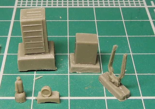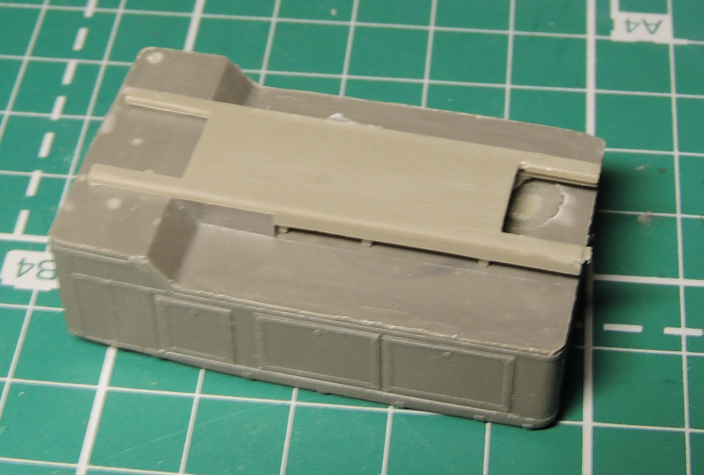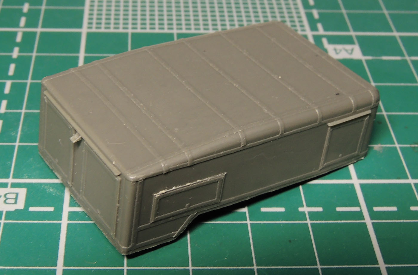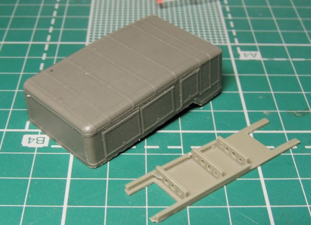 Теперь к смоле: кузов станции отлит без существенных дефектов сверху, однако снизу видны пузыри , благо, что не вырвавшиеся и не давшие раковин. Рама станции сделана одной деталью, обращаю ваше внимание, на то, что плоское "дно" на раме удалять не надо- в реале это экран предохраняющий днище станции и кислородные баллоны от попадания на них масла в случае течи сальников на редукторах задних мостов. Стыкуются эти детали без проблем- детали ровные, не поведены. Мелочёвка не богата, представлена огнетушителем, фарой на заднюю стенку станции, вилкой запасного колеса и парой ящиков. Вилку и огнетушитель необходимо иочистить от небольшого облоя. На кузове станции в процессе транспортировки отлетели отливы над люками станции, но не беда пивжесть и циакрин в руки и за 5 минут восстановим на века.
