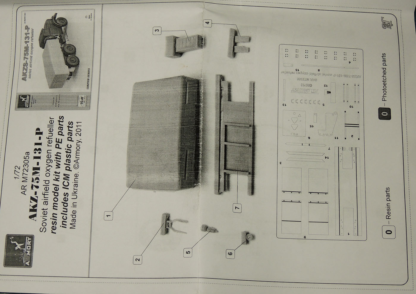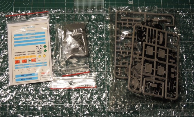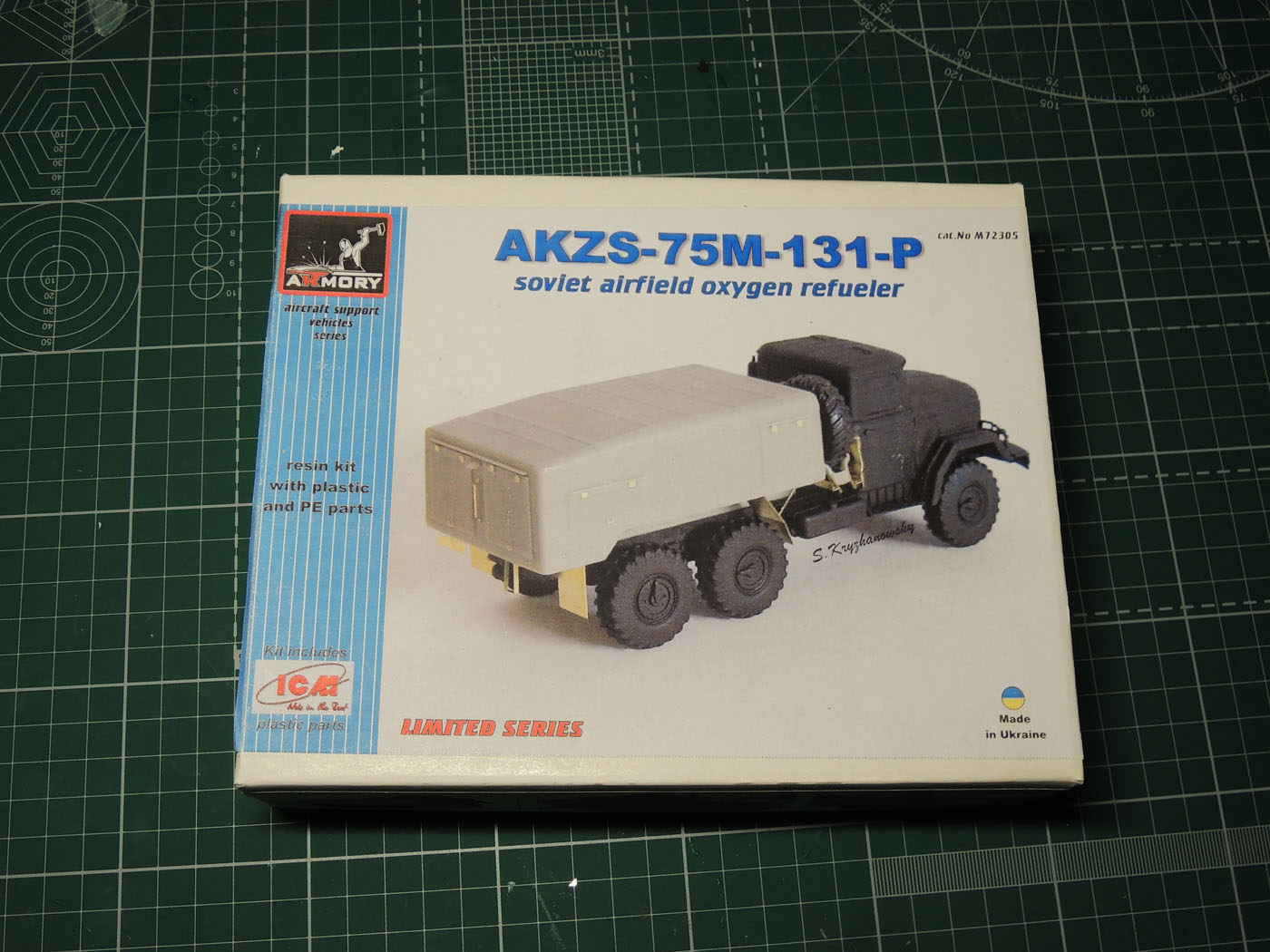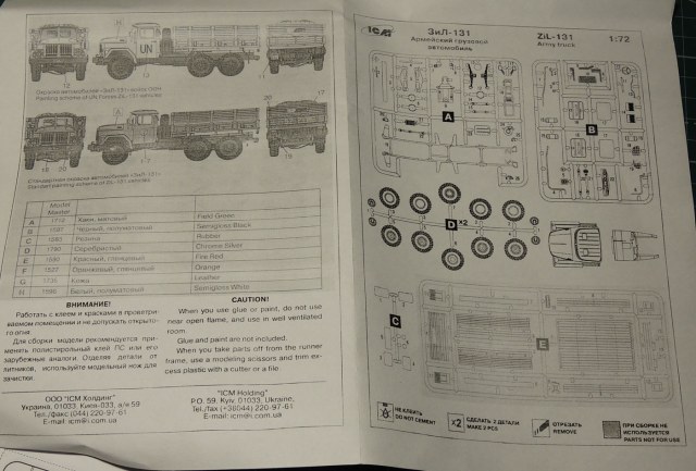 В коробке 250х150х5 из картона не очень высокой плотности находится хорошо всем знакомая модель ЗиЛ-131 от ICM, пакетик со смоляными деталями декаль и плата травления.