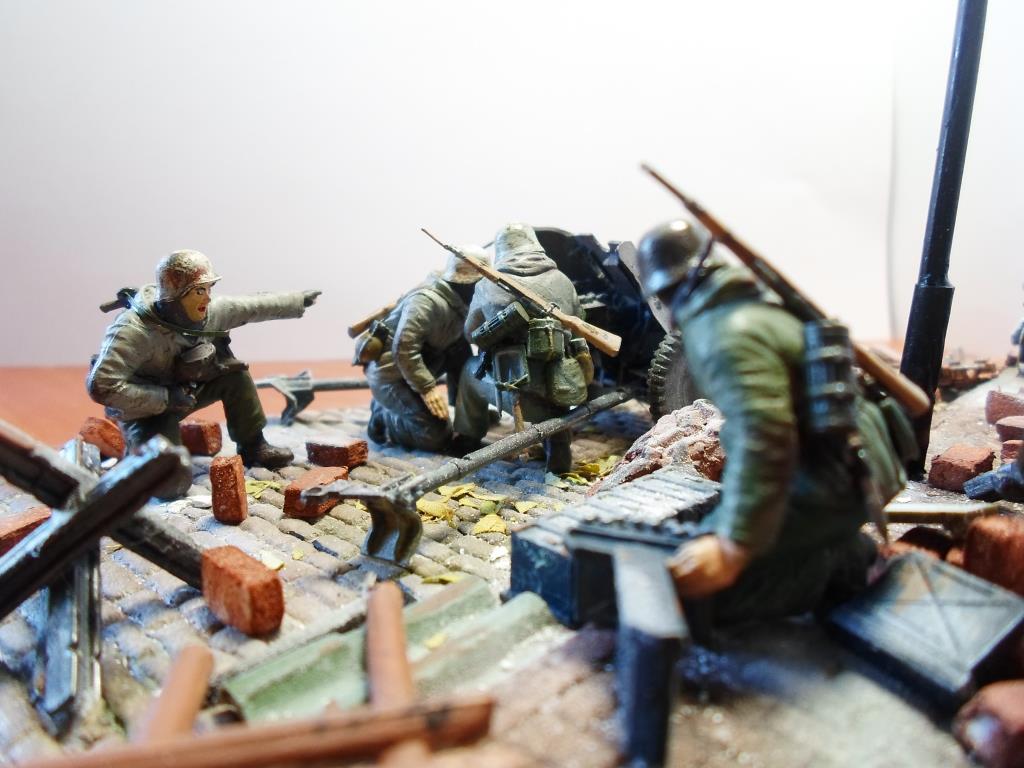 Добрый совет: обратите внимание на запыление. Судя по тому, как стреляют фашисты, всё вокруг должно быть серо от пыли. Композиция, сюжет - всё отлично, но всё блестит - невозможно в условиях боя. Этого с биноклем поближе к пушке. Разберитесь с кирпичами (лучше их так не разбрасывать) И, глядишь, получится достойная диорама. Ну, а про глаза уже сказали.)))