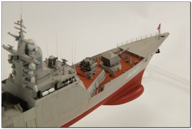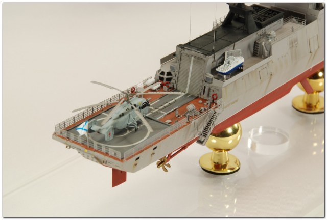 Подводная часть выглядит скучнее чем надводная, зря не стал делать свой фирменный прешейдинг, солевые потеки есть, но они потерялись, форма бульба не совсем верно передана производителем. Согласен с Борисом - оттенок цвета надводной части не совсем тот, что на последнем фото. Не хватает смывки усиления фальшборта на баке. На фото модели не видно есть ли на ступице винта дополнительная крестообразная наделка. На мачте со стороны дымовой трубы можно было бы чуть добавить копоти. Сеть на вертолетной площадке добавила бы реализма. Ощущение что вертолет чуть переразмерен - вопрос пройдет ли он в проем двери ангара. Не знаю точно но предположу, что при наличии вертолета на площадке ограждения должны быть завалены. Ну и открытая дверь на ют зияет забетонированной стенкой, надо было проем зачернить.