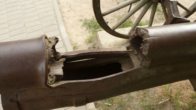 Данная пушка в очень плохом состоянии. Нет замка, прицела, приборов наведения... Это орудие участвовало в подавлении Ярославского мятежа, ствол разорван снарядом, который разорвался в канале ствола. В принципе, орудие чудом дожило до наших дней.