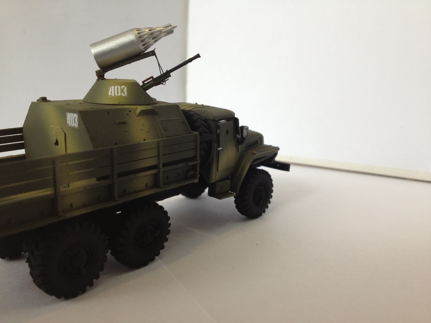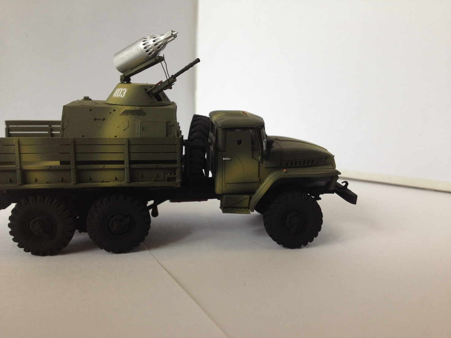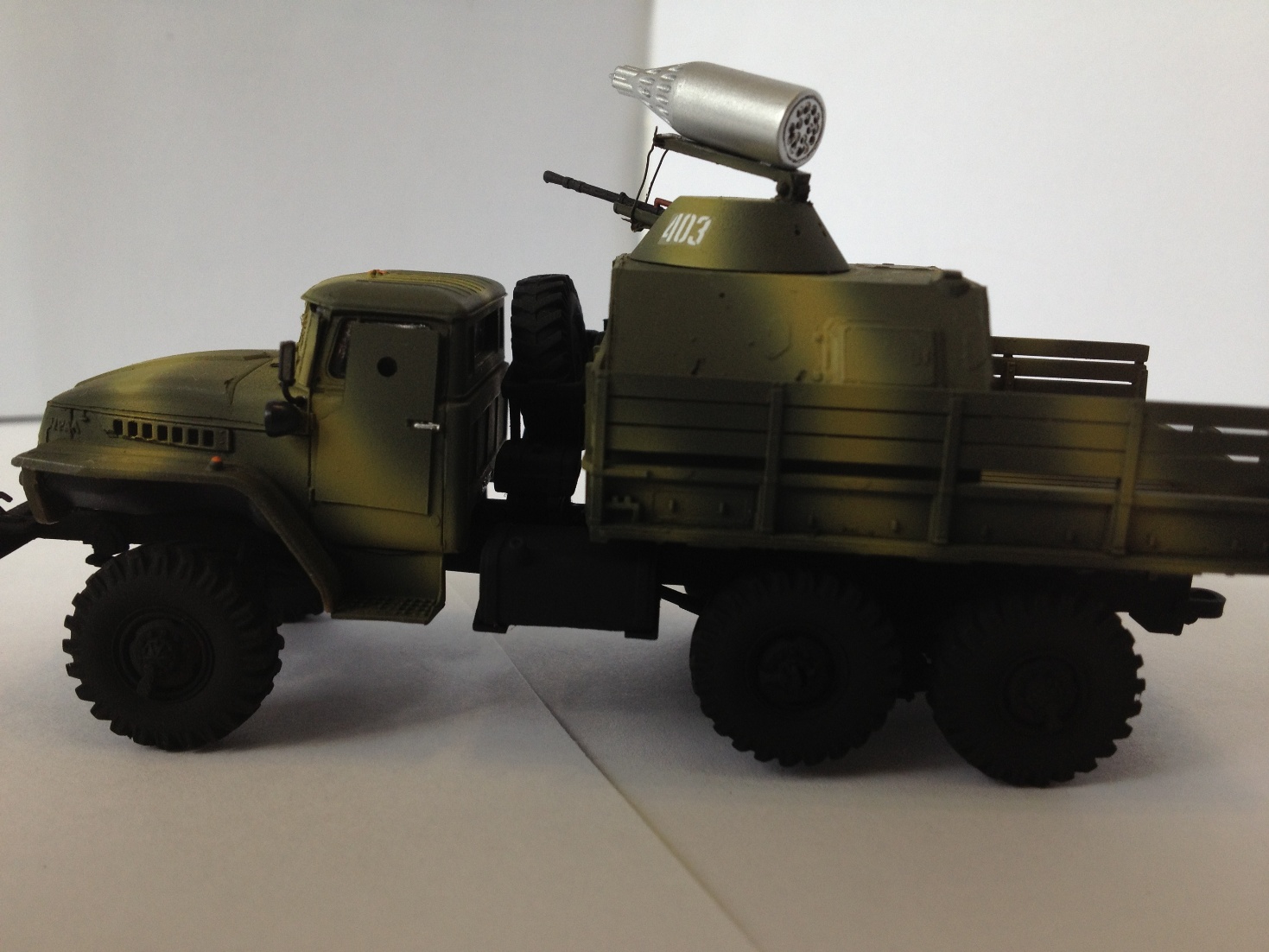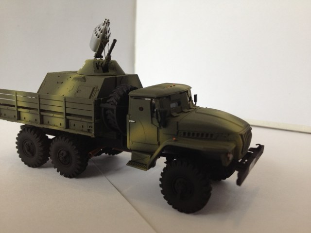 Добрый день, камрады! Предлагаю Вашему вниманию небольшую переделку из известных Ай-Си-Эмовских китов Урал+БТР 60 ПБ+доширак. Постарался изобразить самодельную афганскую конверсию, когда на Урал ставился кусок списанного БТР (БРДМ), поверх башни НУРСоблок. Прицеливание осуществлялось я так понимаю поворотом башни и подъемом КПВТ, поражение цели - за счет плотности огня. Бронировку дверей и лобового стекла имитировал дошираком. Планирую использовать в диараме, поэтому пока не пылил. Загрязню под цвет местности.