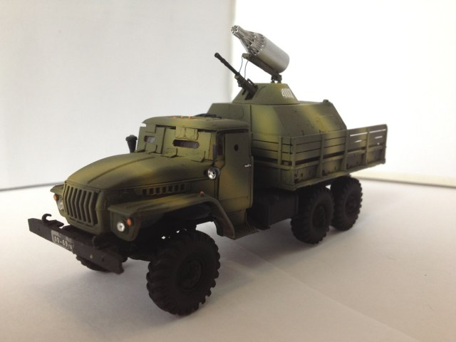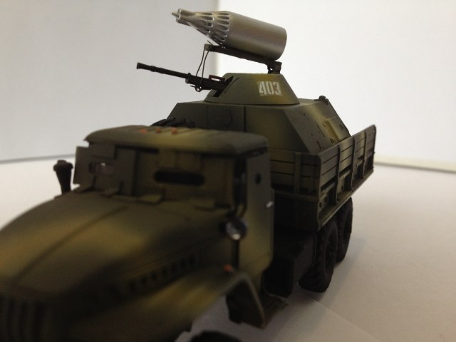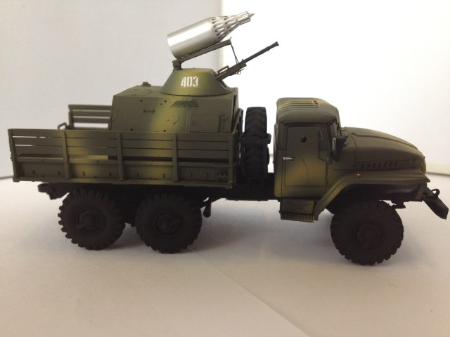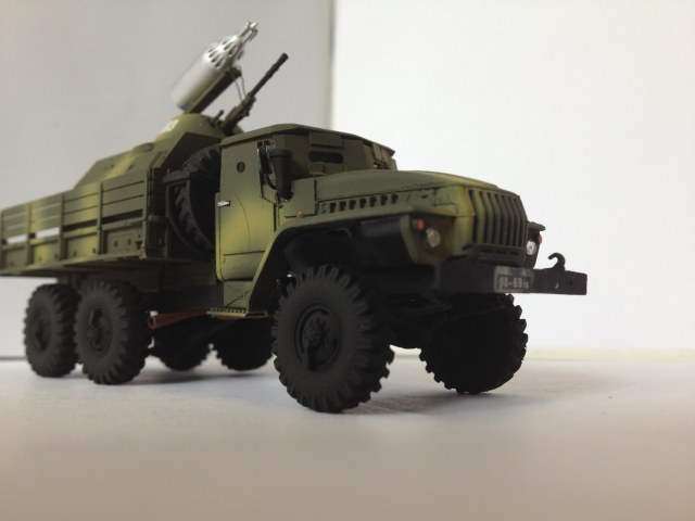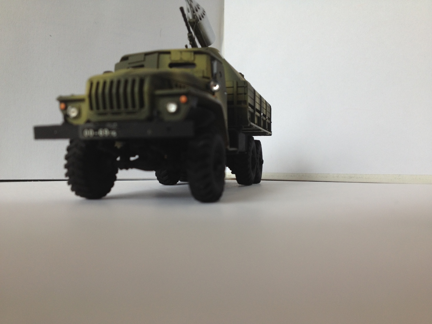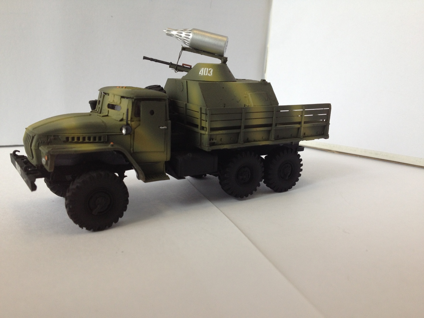 Добрый день, камрады! Предлагаю Вашему вниманию небольшую переделку из известных Ай-Си-Эмовских китов Урал+БТР 60 ПБ+доширак. Постарался изобразить самодельную афганскую конверсию, когда на Урал ставился кусок списанного БТР (БРДМ), поверх башни НУРСоблок. Прицеливание осуществлялось я так понимаю поворотом башни и подъемом КПВТ, поражение цели - за счет плотности огня. Бронировку дверей и лобового стекла имитировал дошираком. Планирую использовать в диараме, поэтому пока не пылил. Загрязню под цвет местности.