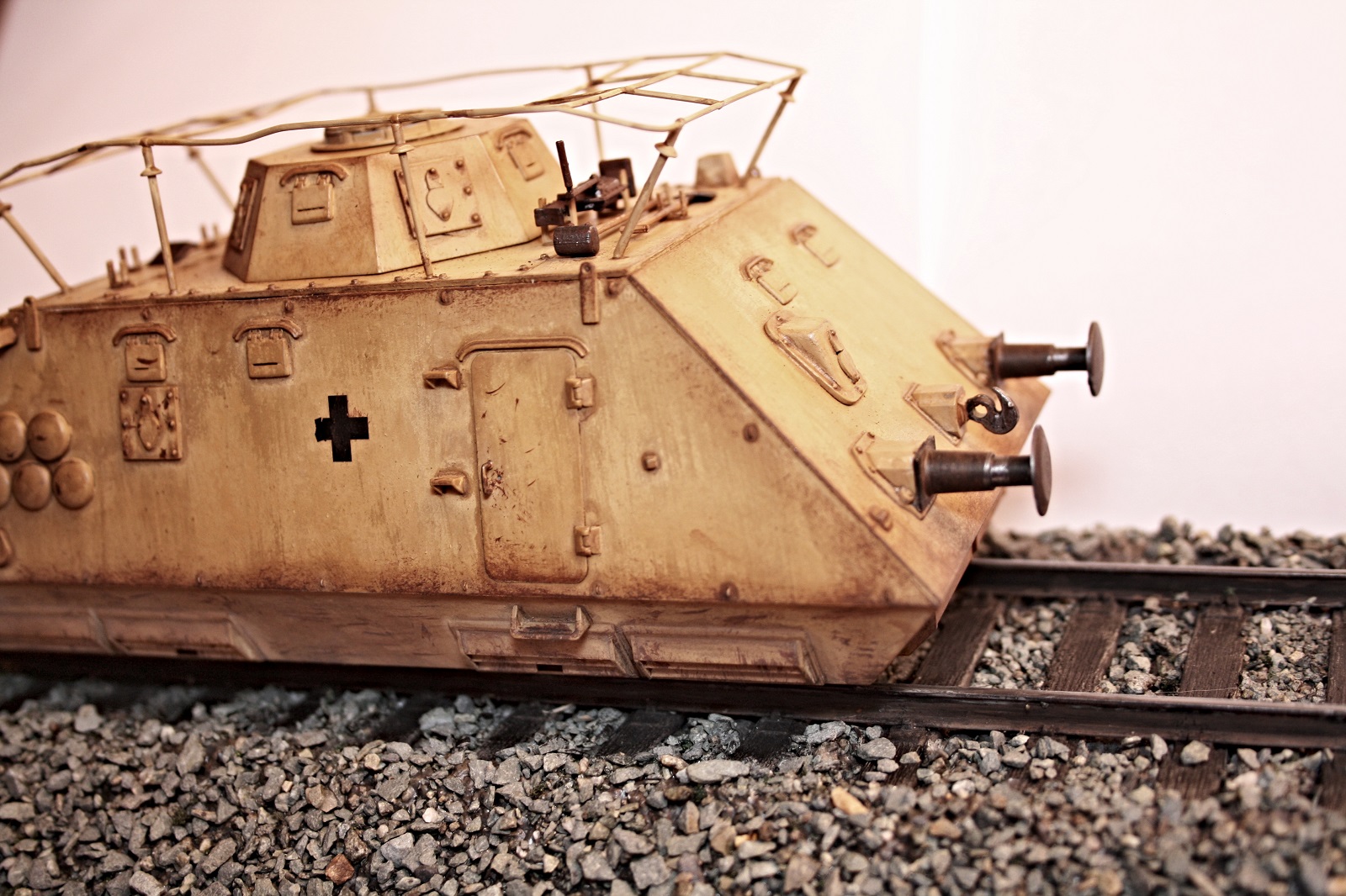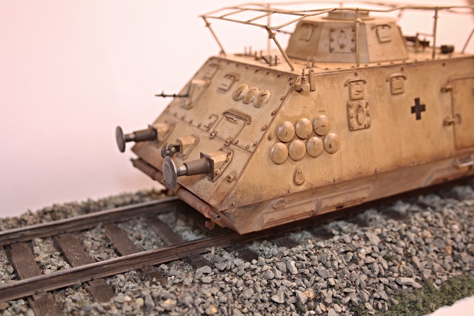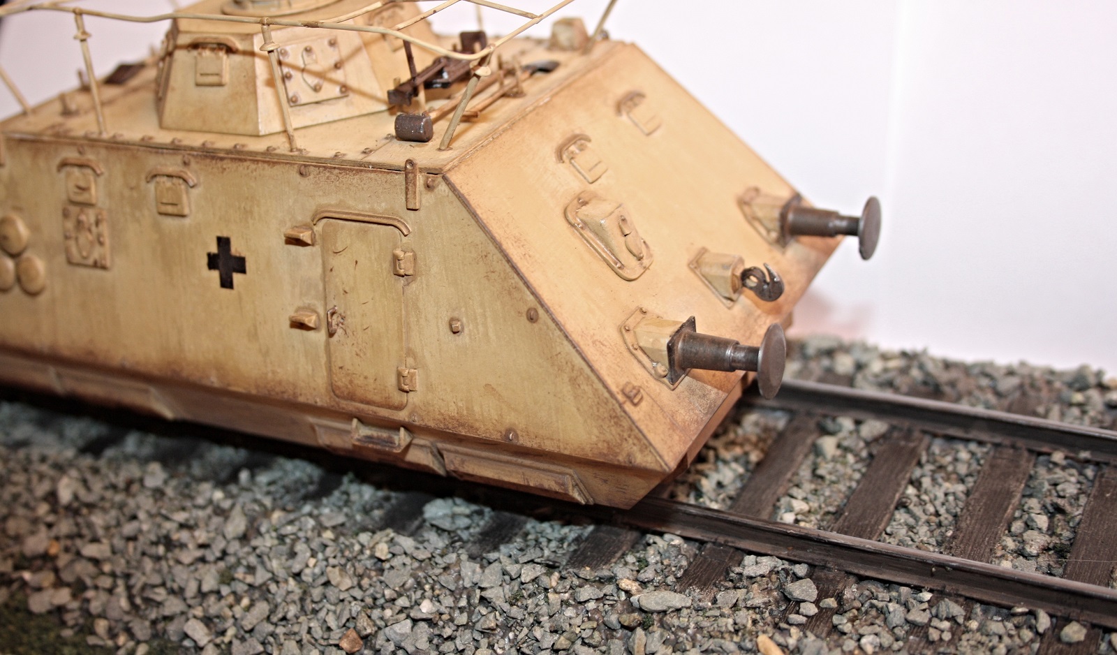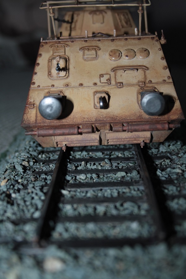 На ступеньки возле двери добавить накладки противоскольжения. Про перископы ком.башни думаю знаете. Потеряна часть шанца и укладка антенны, ровно как и она сама. Дрезине бы сцепочка не помешала, кстати, знаю что драгон не даёт, но всё-же.. Это кстати классная тема, фоткать её так что не видны пулемёты, но я чую они изкоробочные. Это не плохо само по себе, они смотрятся, НО только не вблизи. В идеале - менять на пехотные от Aber. Кстати, согласен что чуть вздёрнуты: в состояние покоя это правильно.